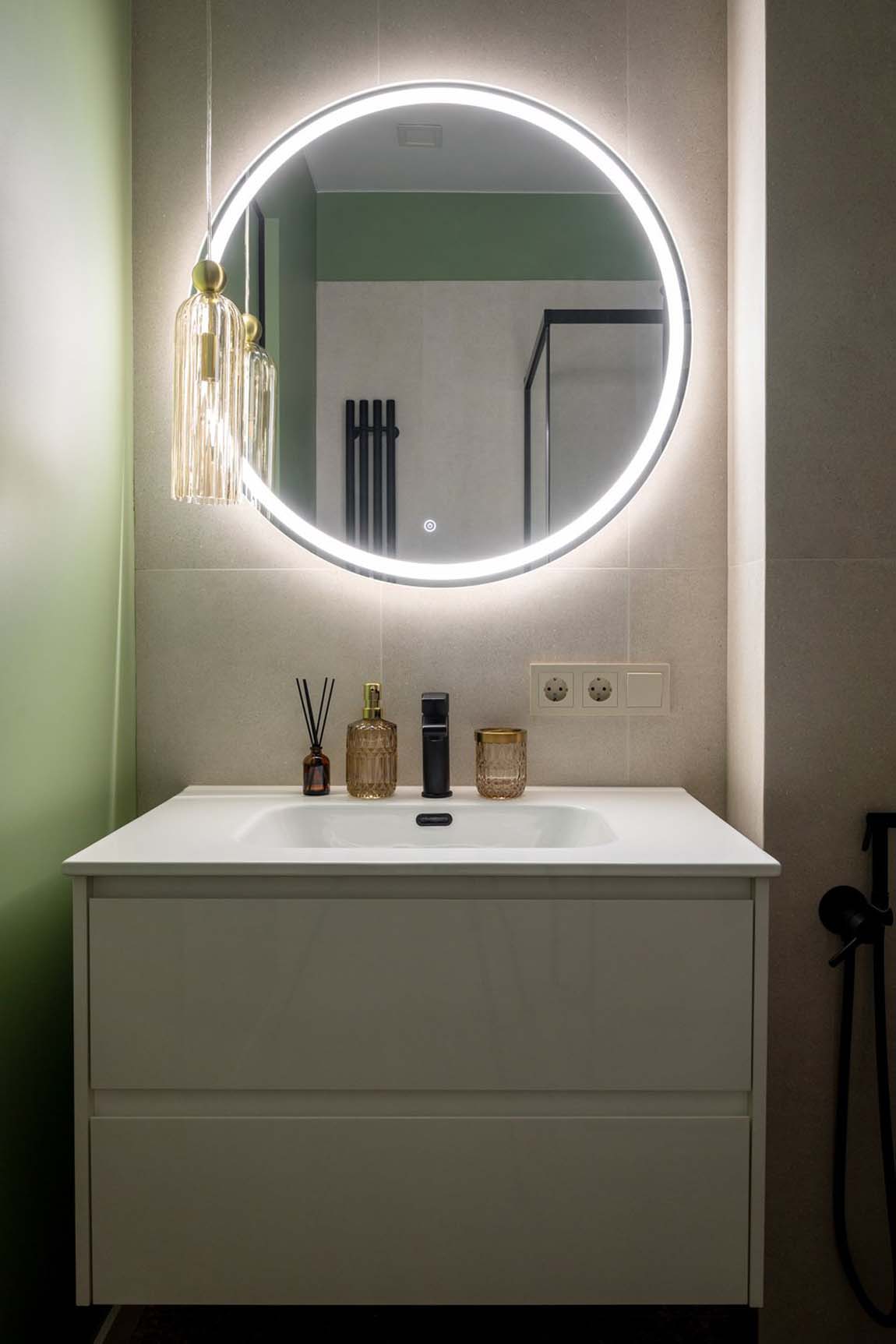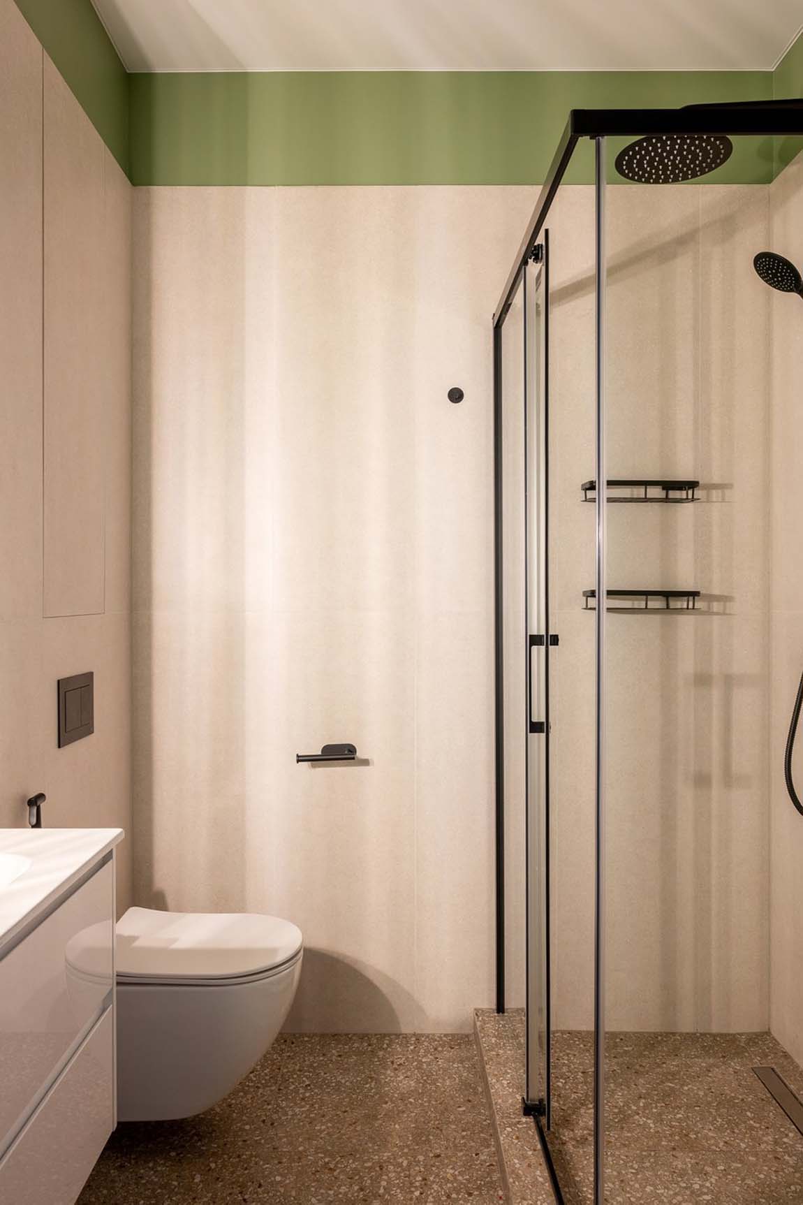A fürdőszoba anyaghasználata kissé kilép a lakás semleges világából, mégis harmonikus marad. A csempe nem fut a mennyezetig: felül egy természetes zöld sáv zárja a teret, alul pedig világos, meleg tónusú kőhatású lapok adnak alapot. A padlón terrazzo jellegű burkolat visz játékosságot a térbe, a zuhanyt pedig fekete keretes üvegfal és fekete szerelvények egészítik ki. A háttérvilágításos tükör és a bordázott üvegű függeszték funkcionális, mégis hangulatos párosítás.
