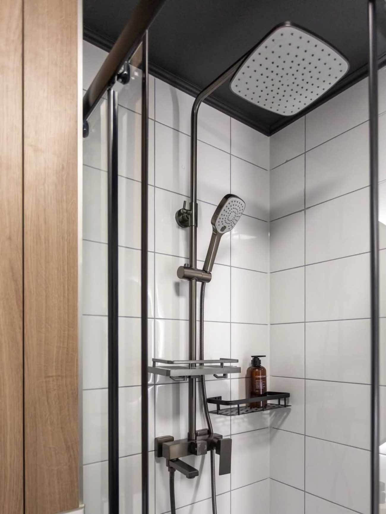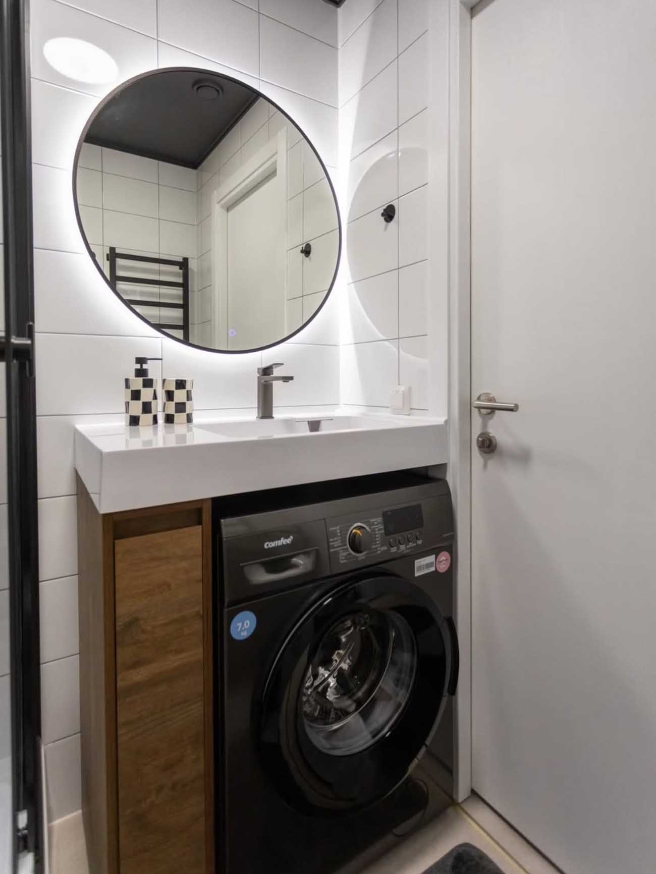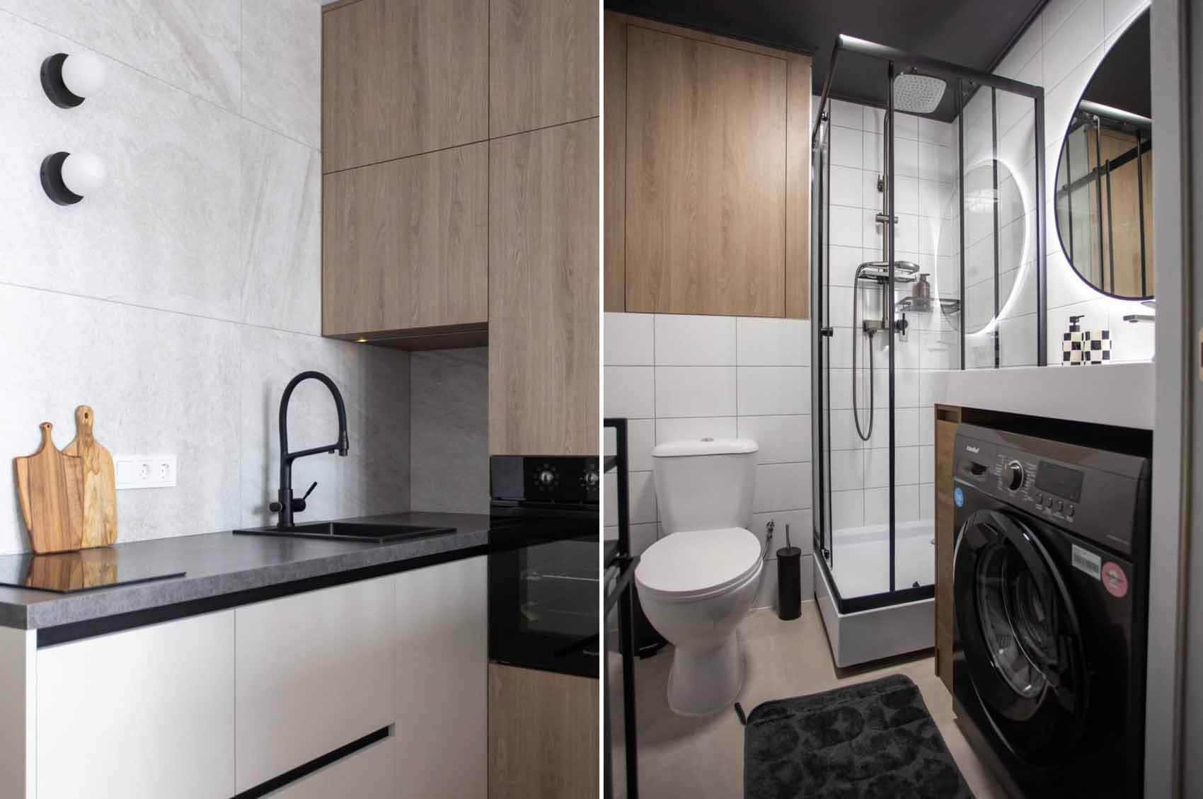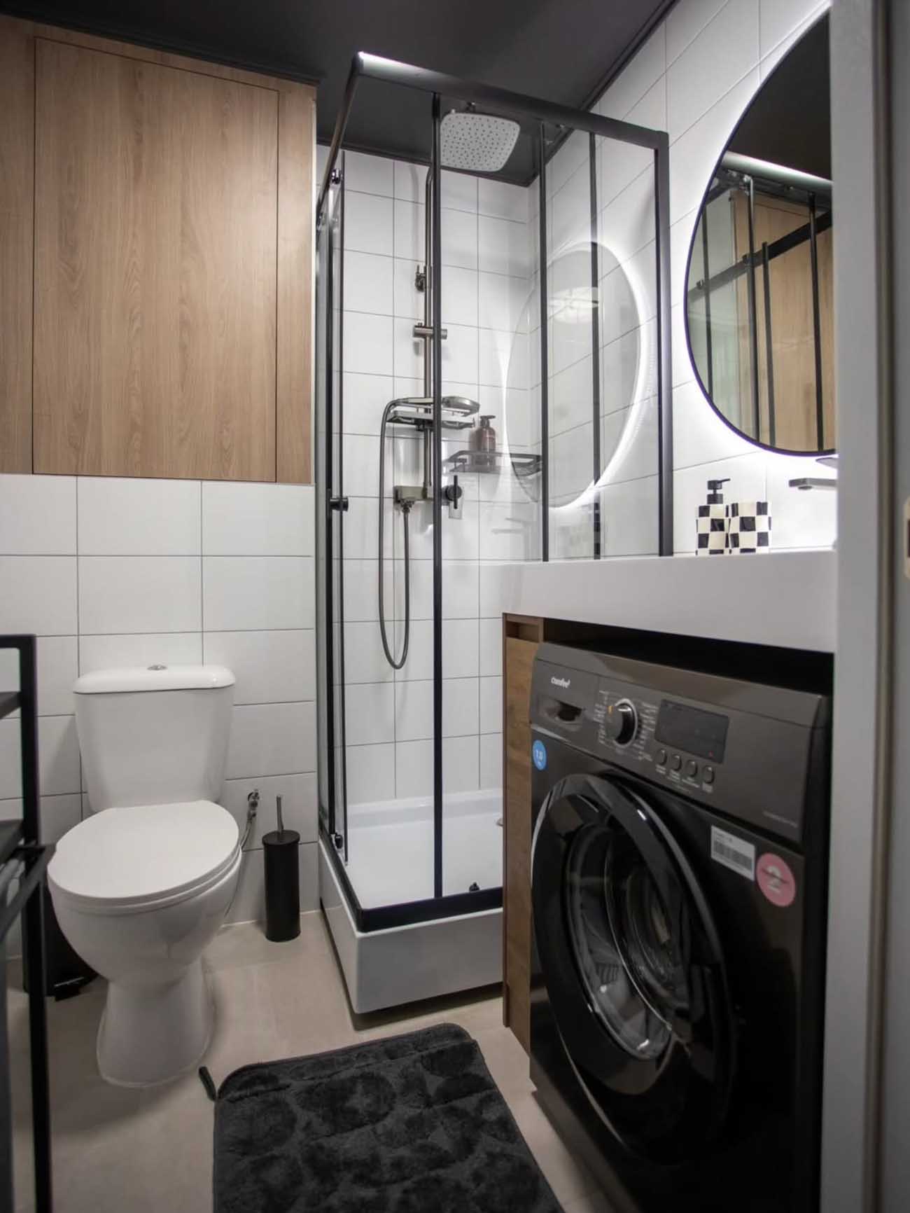 A fürdőszobában a fekete keretes zuhanykabin és a sötét mennyezet drámai kontrasztot alkot a világos burkolatokkal. A térkihasználás itt is példaértékű: a mosógép a pult alá integrálva rejtőzik, a fa felületű tároló pedig melegséget csempész a helyiségbe. A kör alakú tükör a rejtett LED-világítással praktikus és mutatós kiegészítő.