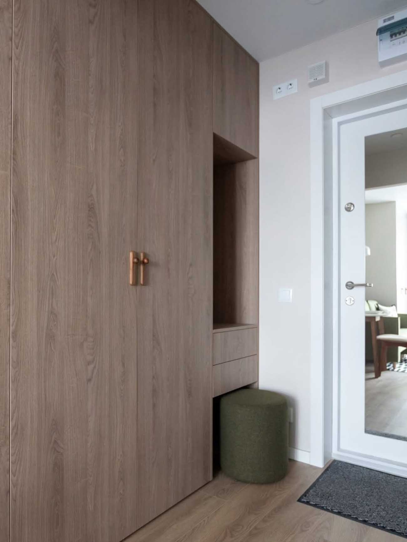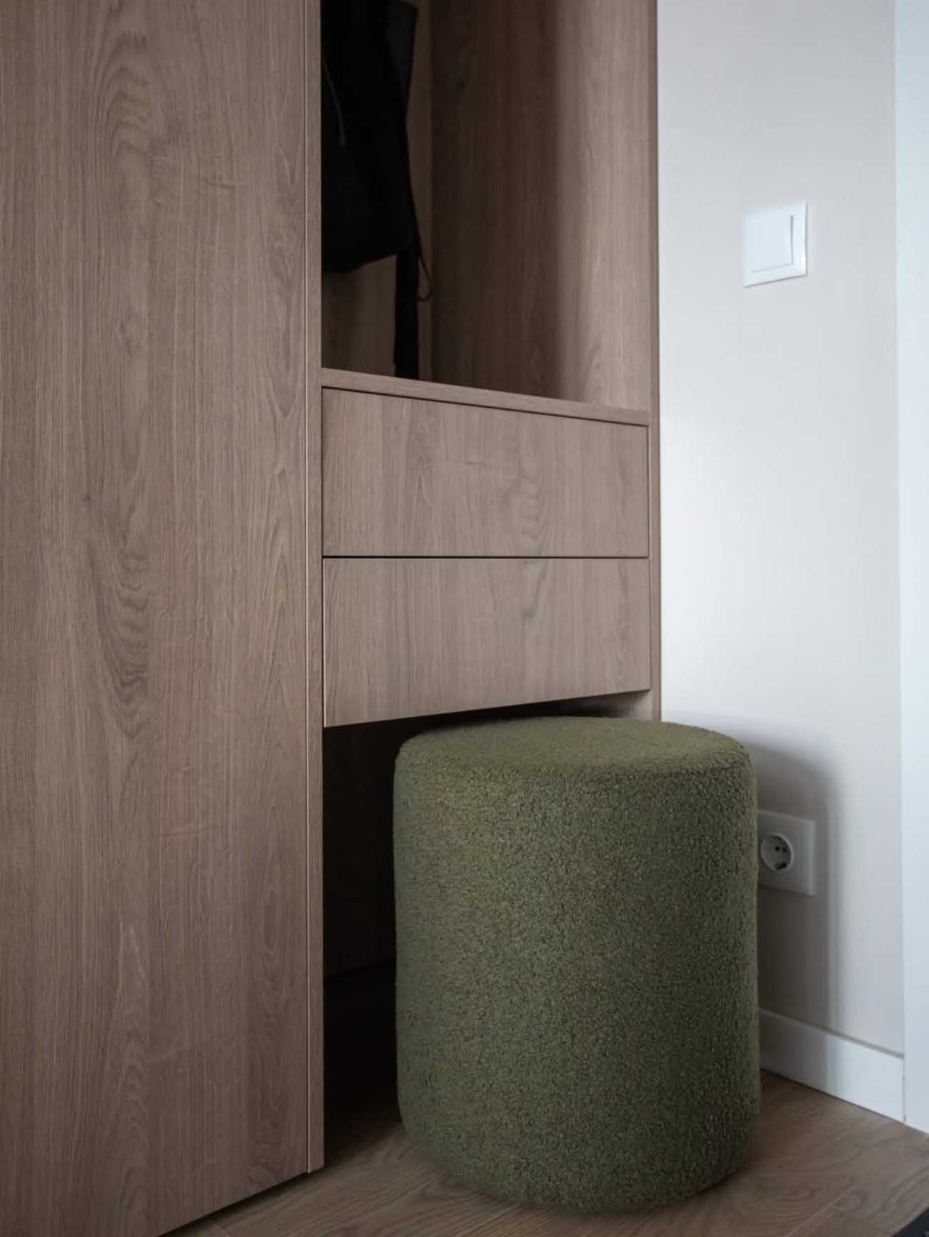 Az előszobában nincsenek szabadon álló elemek; a tárolást egy teljes belmagasságig futó, faerezetes frontokkal ellátott egyedi bútor oldja meg. Ez a beépített szekrényfal nemcsak a kabátoknak ad helyet, hanem egy okos kialakítású, nyitott fülkét is rejt. A fülke alatt fiókok gondoskodnak az apróságok rendszerezéséről, míg a benne elhelyezett henger alakú puff praktikus ülőhely a cipőhúzáshoz. A bejárati ajtó tükrös betétje szintén térnövelő hatású, és kiváltja a külön fali tükröt, így a szűk közlekedő falai szabadon maradhattak.