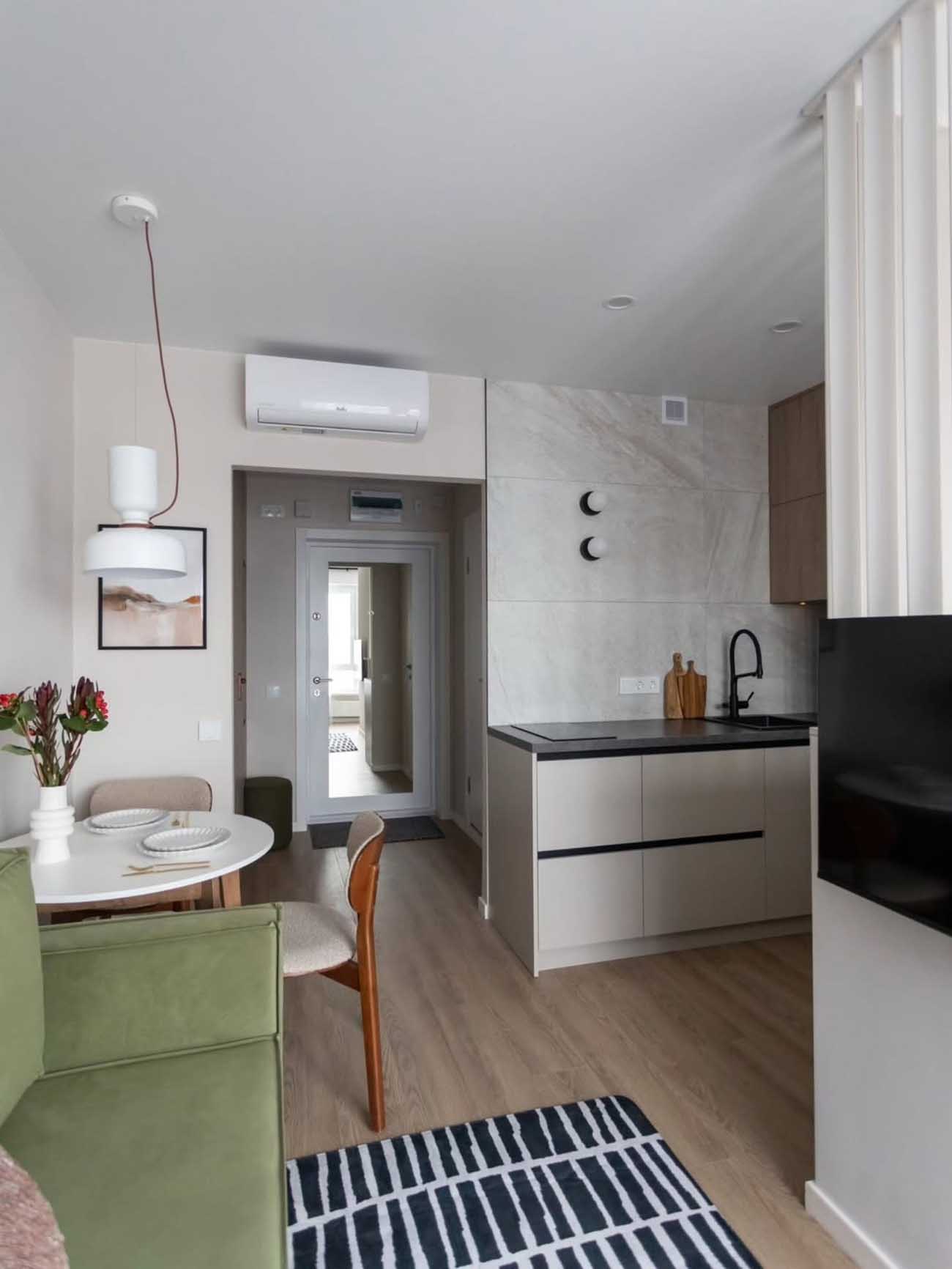 A tér közepén kapott helyet a nappali-étkező zóna. A kompakt, zöld kanapé színfoltként töri meg a semleges hátteret, harmonizálva a fekete-fehér, grafikus mintázatú szőnyeggel és a falon elhelyezett organikus formájú tükörrel. Az étkező szerepet egy kisméretű kerek asztal tölti be két székkel, amely nem akadályozza a közlekedést, felette pedig egy piros kábeles függeszték jelöli ki a térközpontot. A tárolási kapacitást a nappaliban egy letisztult, fehér, teljes magasságú ruhásszekrény egészíti ki, melynek fogantyúi elegáns ritmust adnak a felületnek.