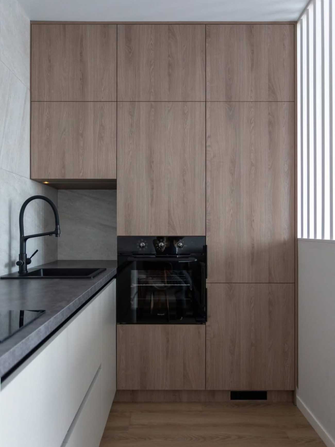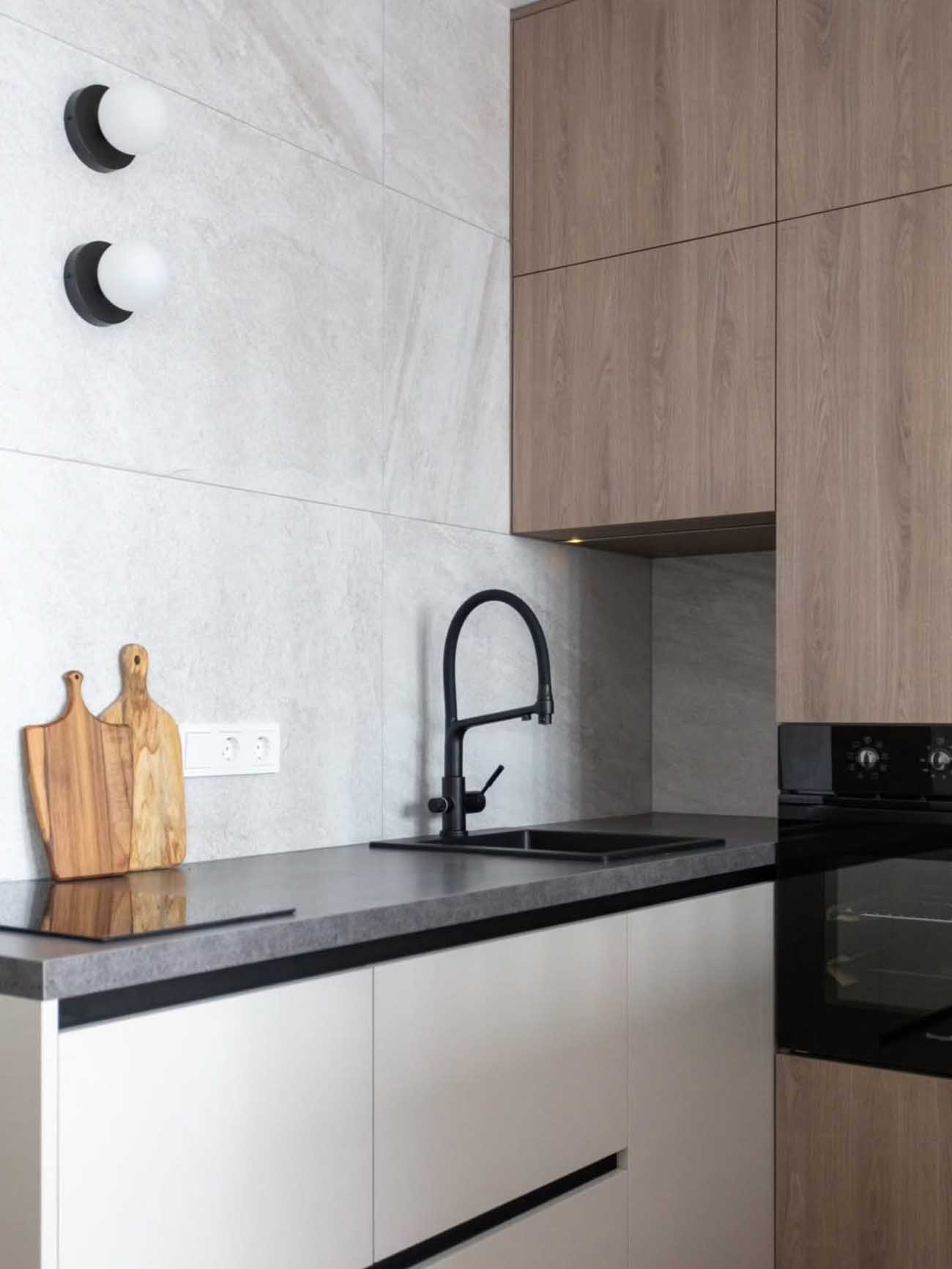 A lakótérbe érve az L alakú konyhabútor határozza meg az egyik falfelületet. A tervezés itt is a vizuális tisztaságra törekedett: az egyik oldalon a mennyezetig érő fa elemek, míg a másikon a felsőszekrények hiánya teremt egyensúlyt. A fehér alsószekrények felett futó sötét munkalap, a fekete mosogató és csaptelep, valamint a nagyméretű, kőhatású falburkolat egyetlen határozott, grafikus sávként jelenik meg. A konyha megvilágítása is a minimalizmust hirdeti: a mennyezeti spotok mellett két gömbbúrás fali lámpa adja a funkcionális fényt.
