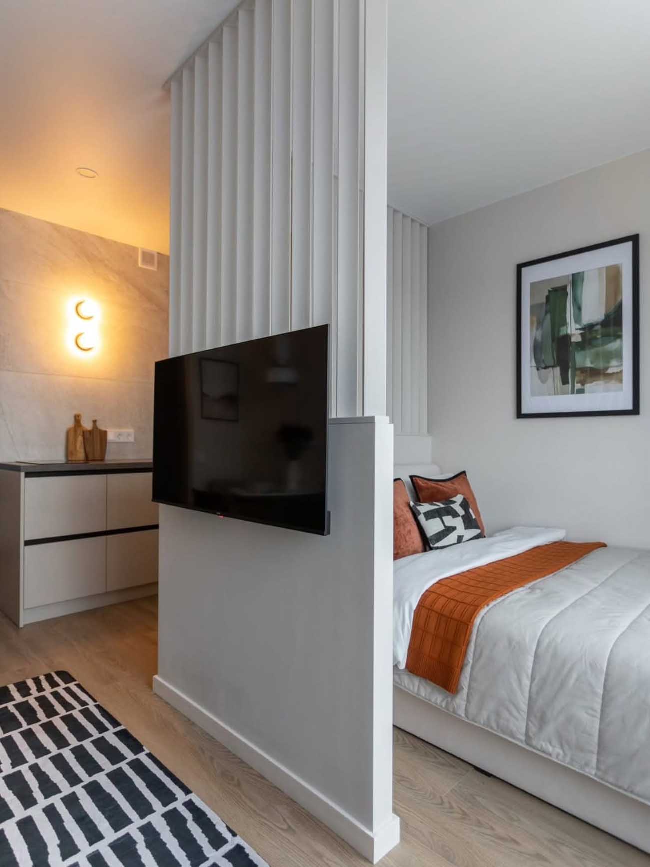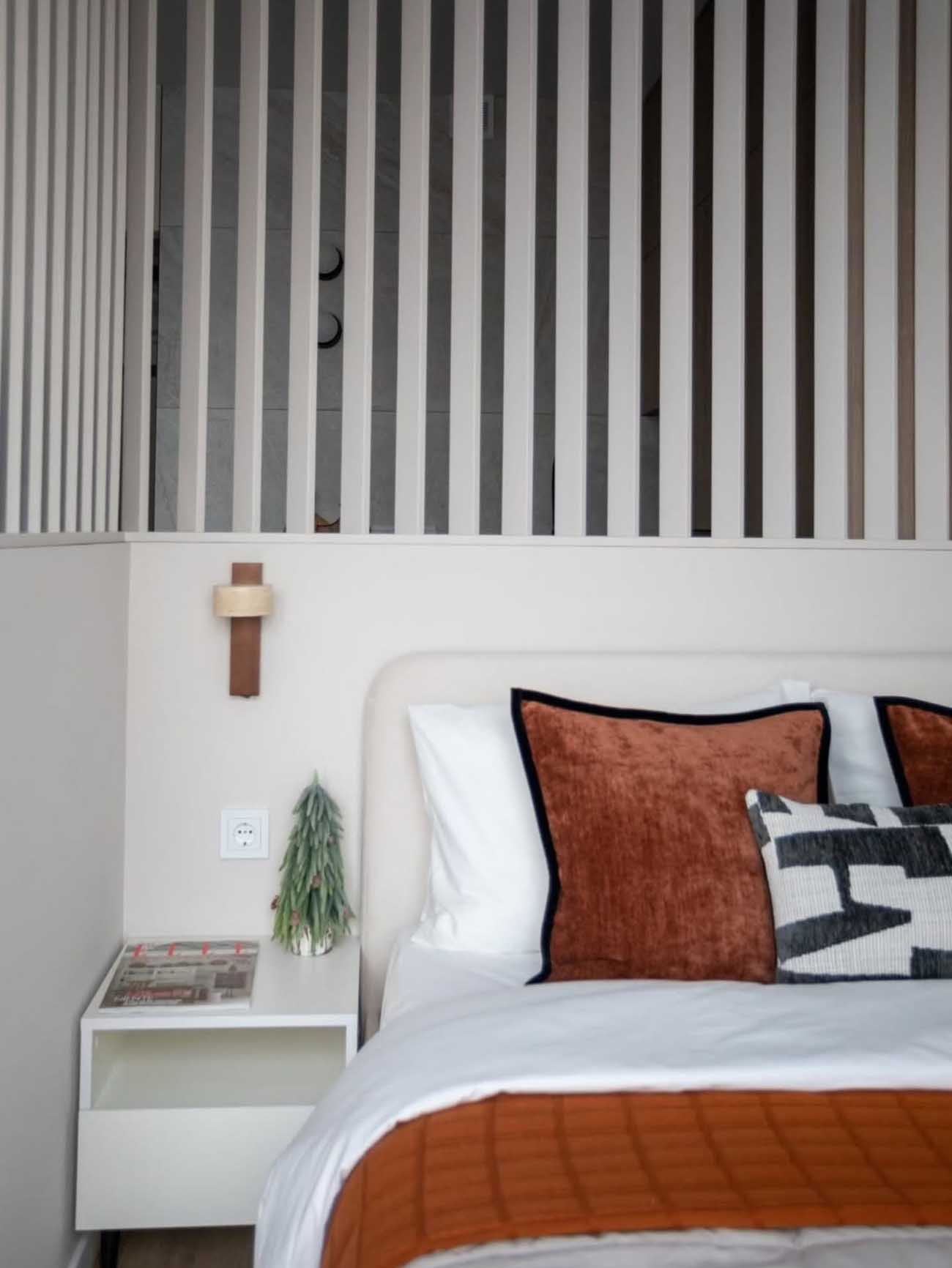 A lakás egyik legizgalmasabb eleme az alvózónát leválasztó térelválasztó szerkezet. A tervező egy alacsony parapet-falat emelt, amely a nappali felől a tévé rögzítésére szolgál, e felett pedig függőleges fa lamellák futnak a mennyezetig. Ez a megoldás úgy biztosít intimitást a hálórésznek, hogy közben nem zárja el a fényt és a levegőt. Az ágy mögött kárpitozott, lekerekített fejvég és egy kis fali olvasólámpa teszi otthonossá a pihenést – még éjjeliszekrénynek is jutott hely.