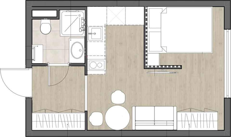 Adott egy mindössze 23 négyzetméteres alapterület, amelynek egyetlen térben kell kiszolgálnia a pihenés, a tanulás, a főzés és a tárolás funkcióit. Ebben a diáknak tervezett minilakásban a belsőépítészeti koncepció nem a falakkal tagolásra, hanem a zónák szigorú, mégis légies logikájára épült. A végeredmény egy olyan enteriőr, ahol a funkciók nem összemosódnak, hanem egymást kiegészítve alkotnak élhető egészet.