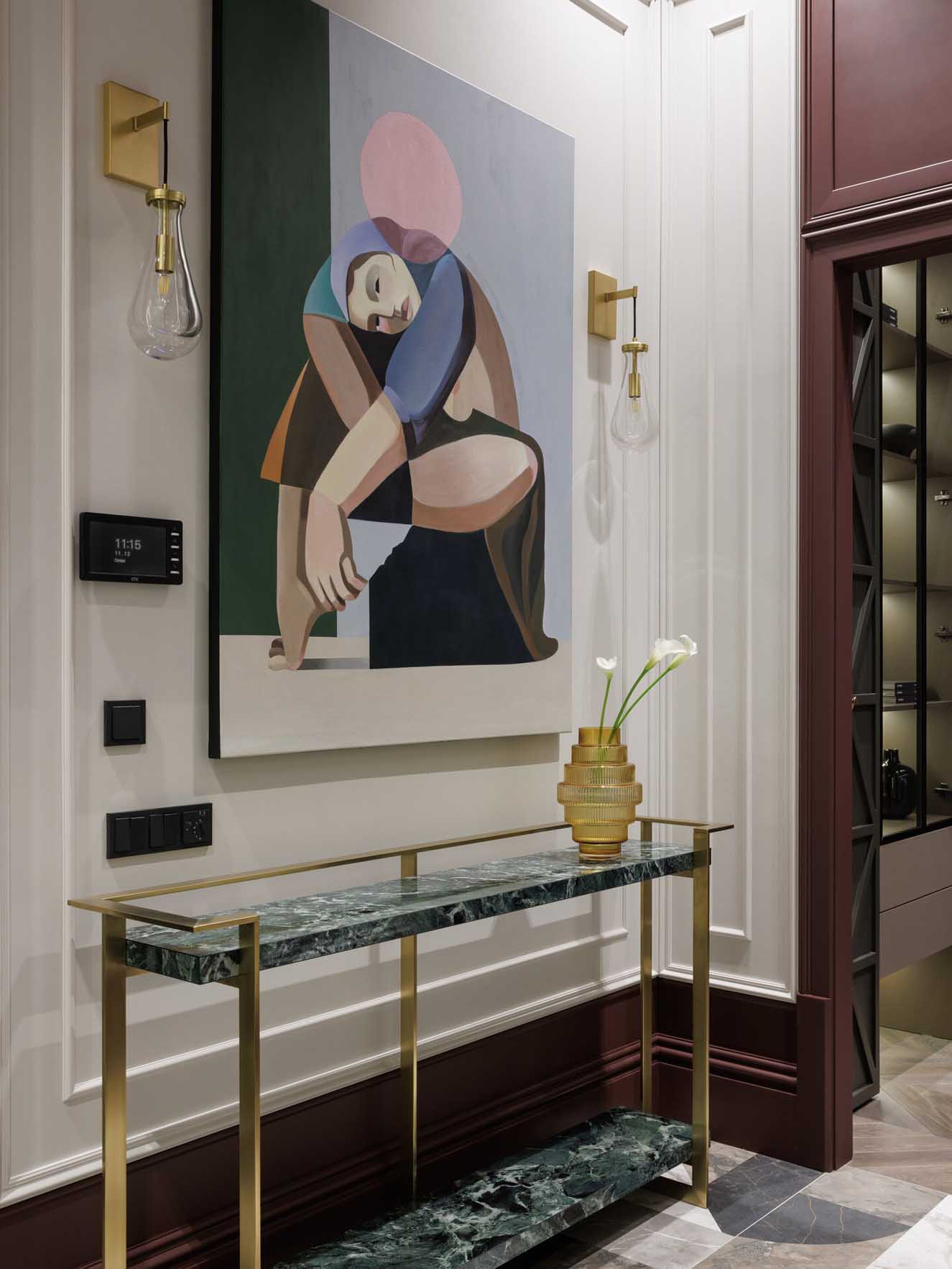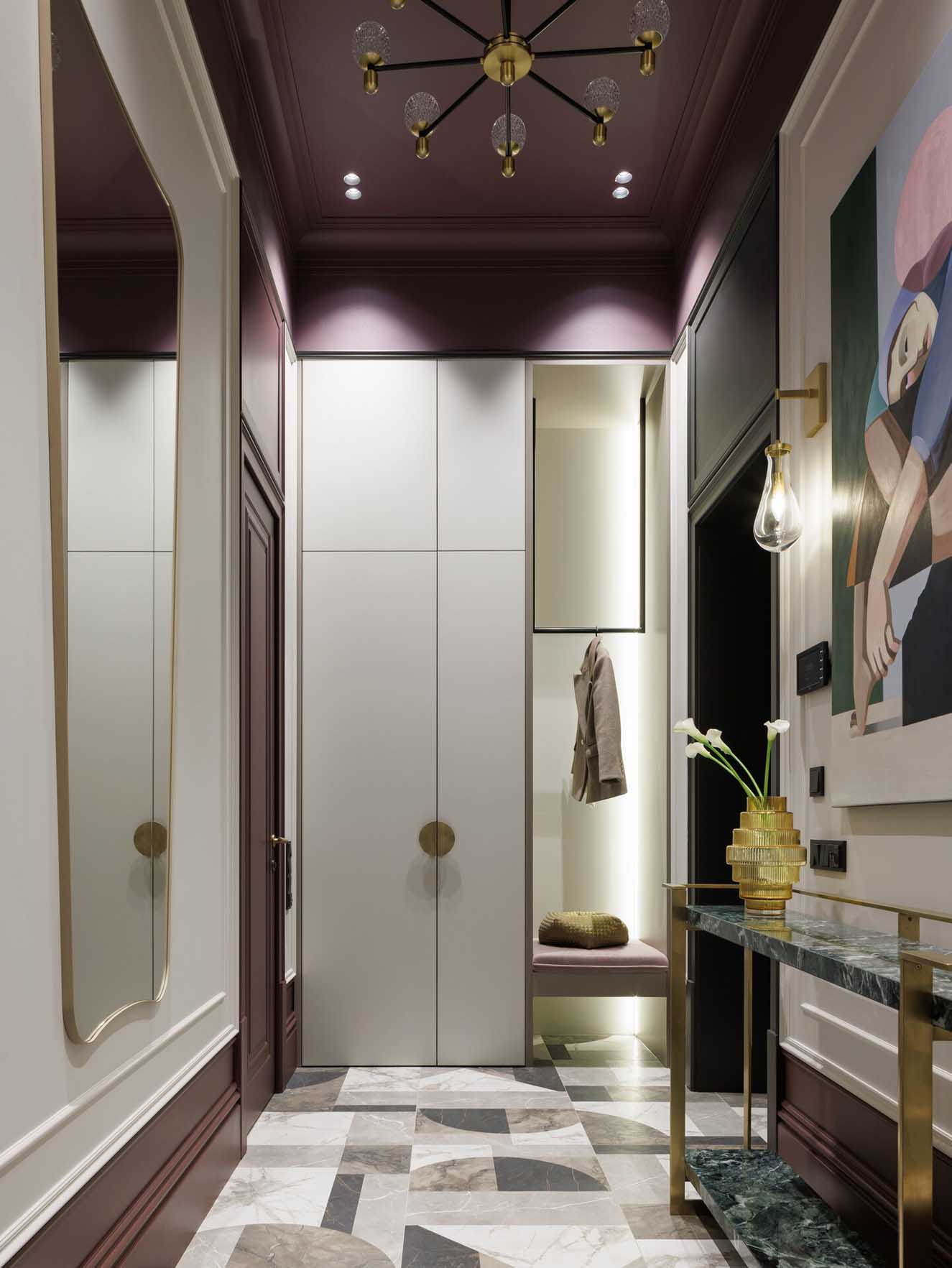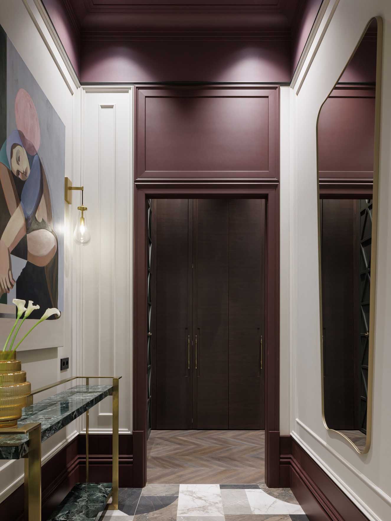 Már a bejáratnál megadja az alaphangot a lakás kifinomult színvilága. A falakon a törtfehér és egy mély, padlizsánba hajló bordó árnyalat alkot drámai, mégis elegáns kontrasztot. A tervezők ezt a gazdag, sötét tónust nem a teljes falfelületen, hanem az ajtókereteken, a mennyezeten (és alatta egy széles sávban) és a lábazaton alkalmazták, ami keretet ad a térnek és kiemeli a klasszikus stílusjegyeket.