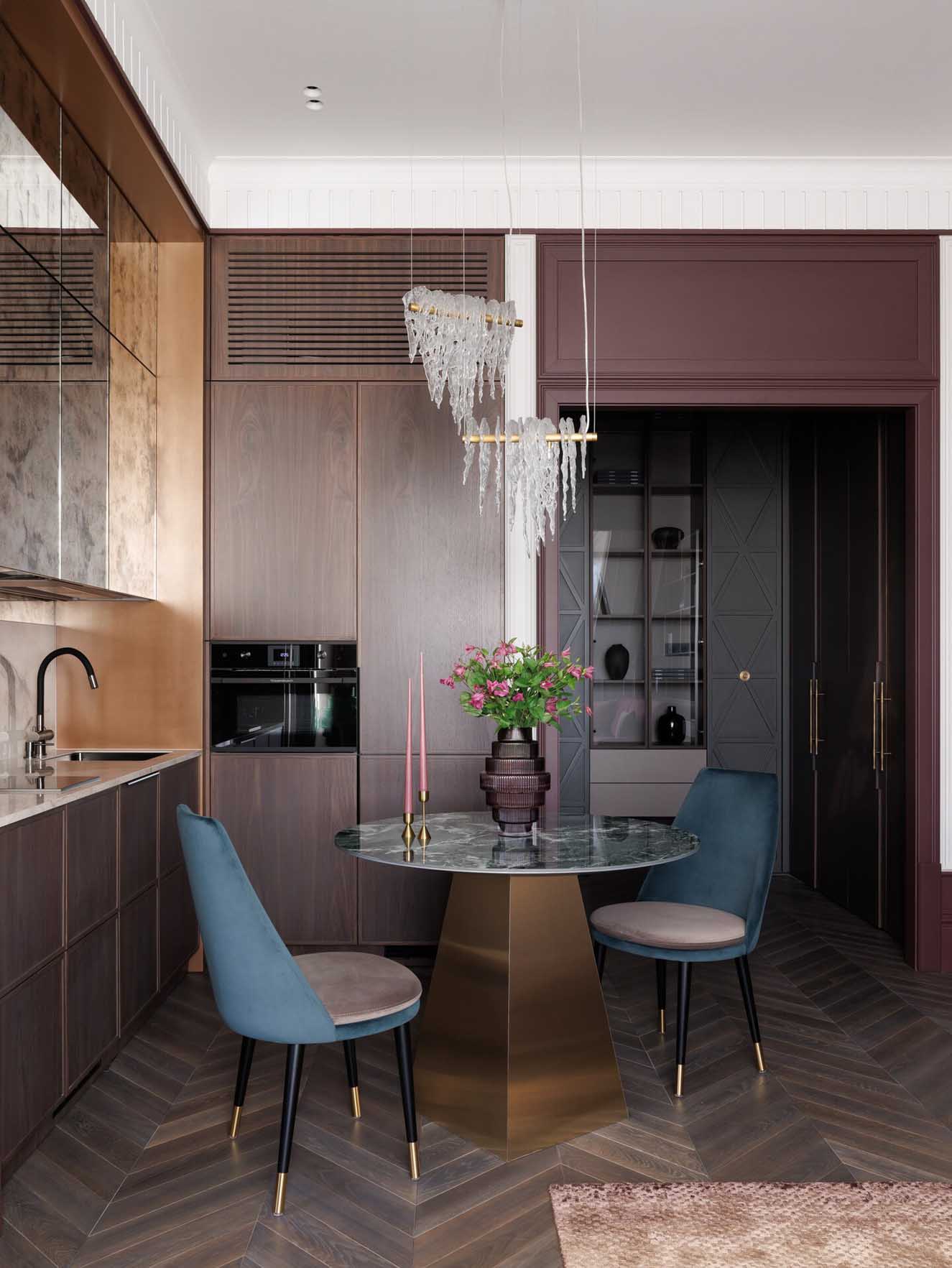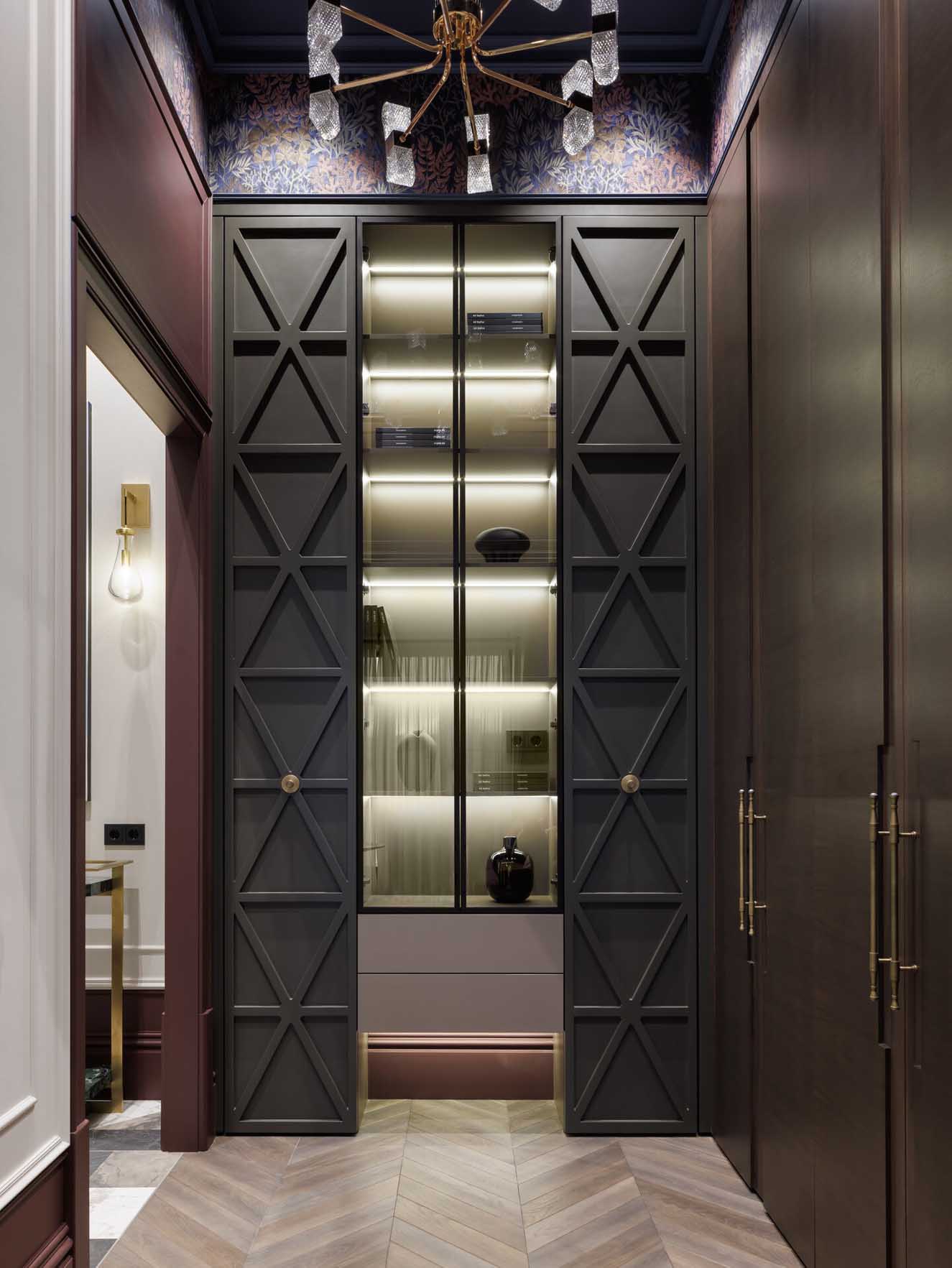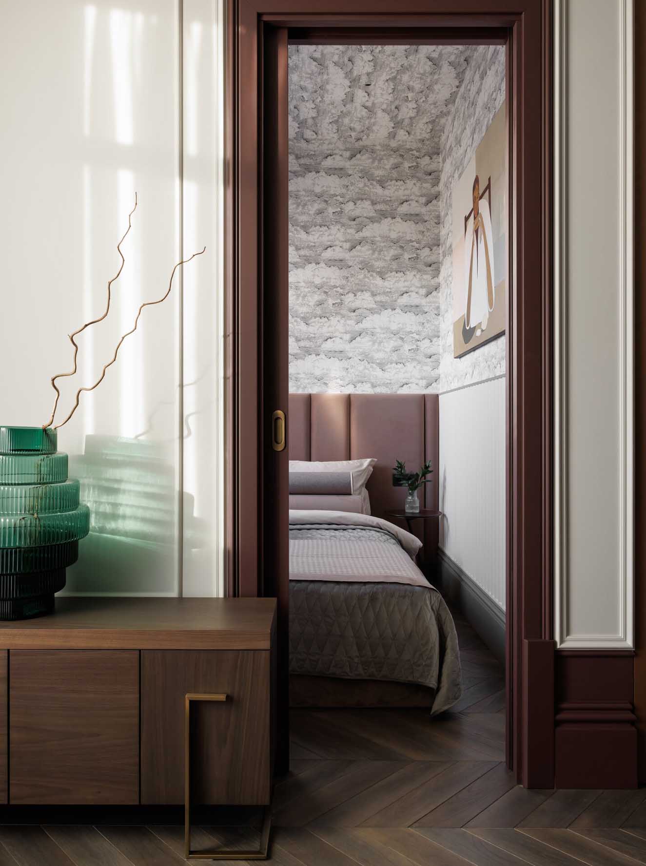 Már a bejáratnál megadja az alaphangot a lakás kifinomult színvilága. A falakon a törtfehér és egy mély, padlizsánba hajló bordó árnyalat alkot drámai, mégis elegáns kontrasztot. A tervezők ezt a gazdag, sötét tónust nem a teljes falfelületen, hanem az ajtókereteken, a mennyezeten (és alatta egy széles sávban) és a lábazaton alkalmazták, ami keretet ad a térnek és kiemeli a klasszikus stílusjegyeket.