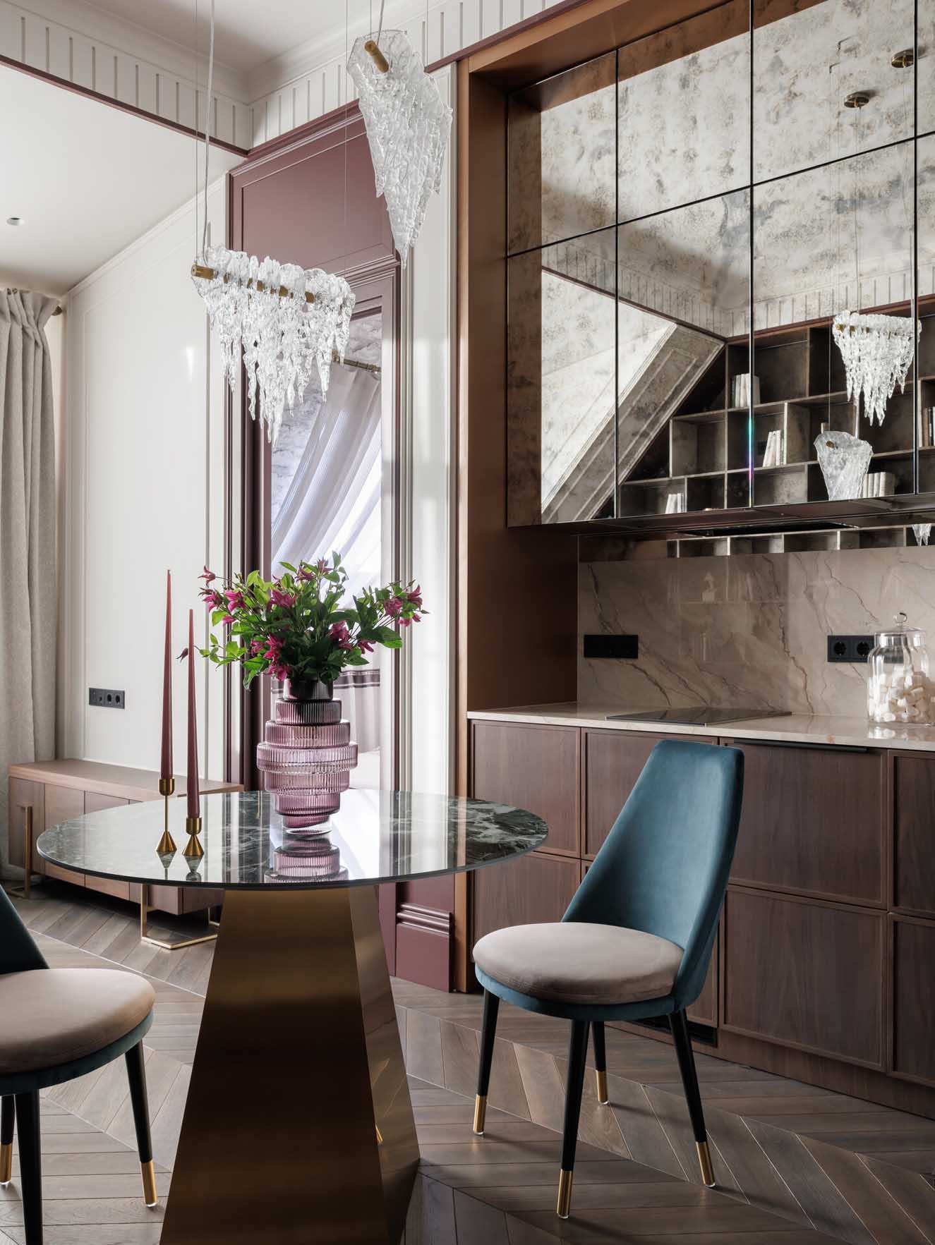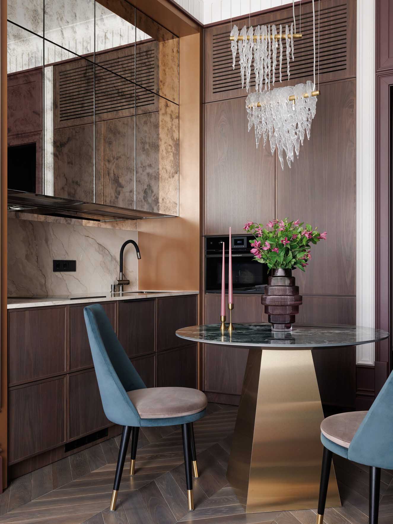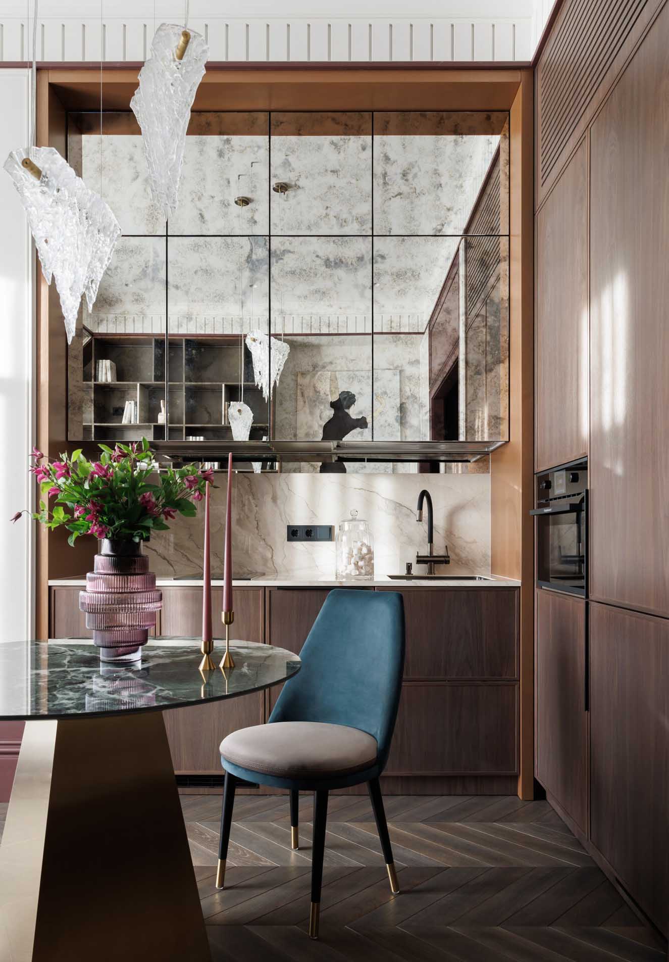 Az egyedi tervezésű konyhabútor a teljes belmagasságot kihasználja. Jobb oldalon a hűtőszekrényt és egyéb tárolókat magukba foglaló toronyszekrények kaptak helyet. Egy dekoratív, áttört frontú felső elem rejti a klímaberendezés beltéri egységét. A felső szekrénysort antikolt tükör borítja, amely finoman „feloldja” a bútor tömegét a térben, miközben izgalmas mélységet ad az enteriőrnek.