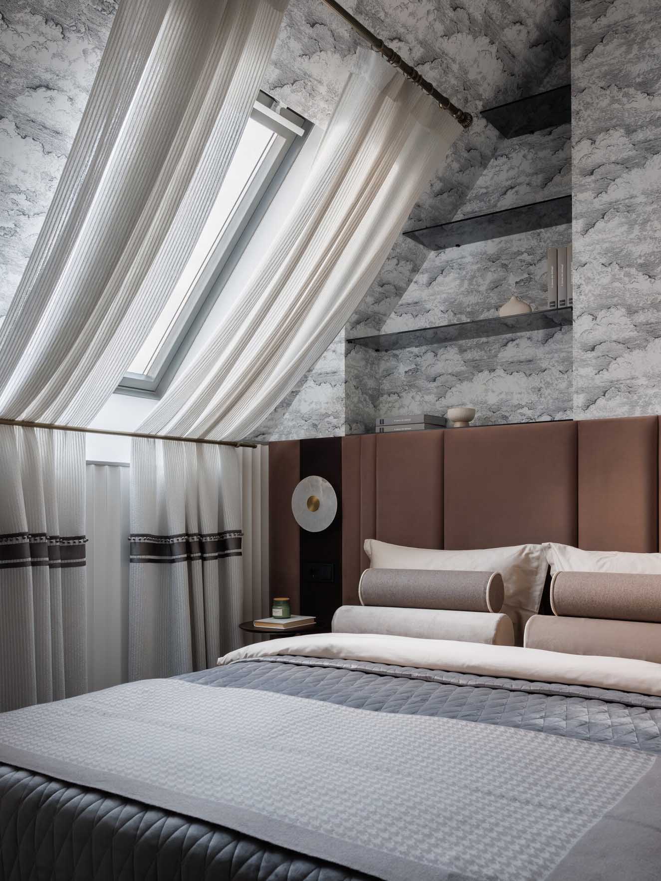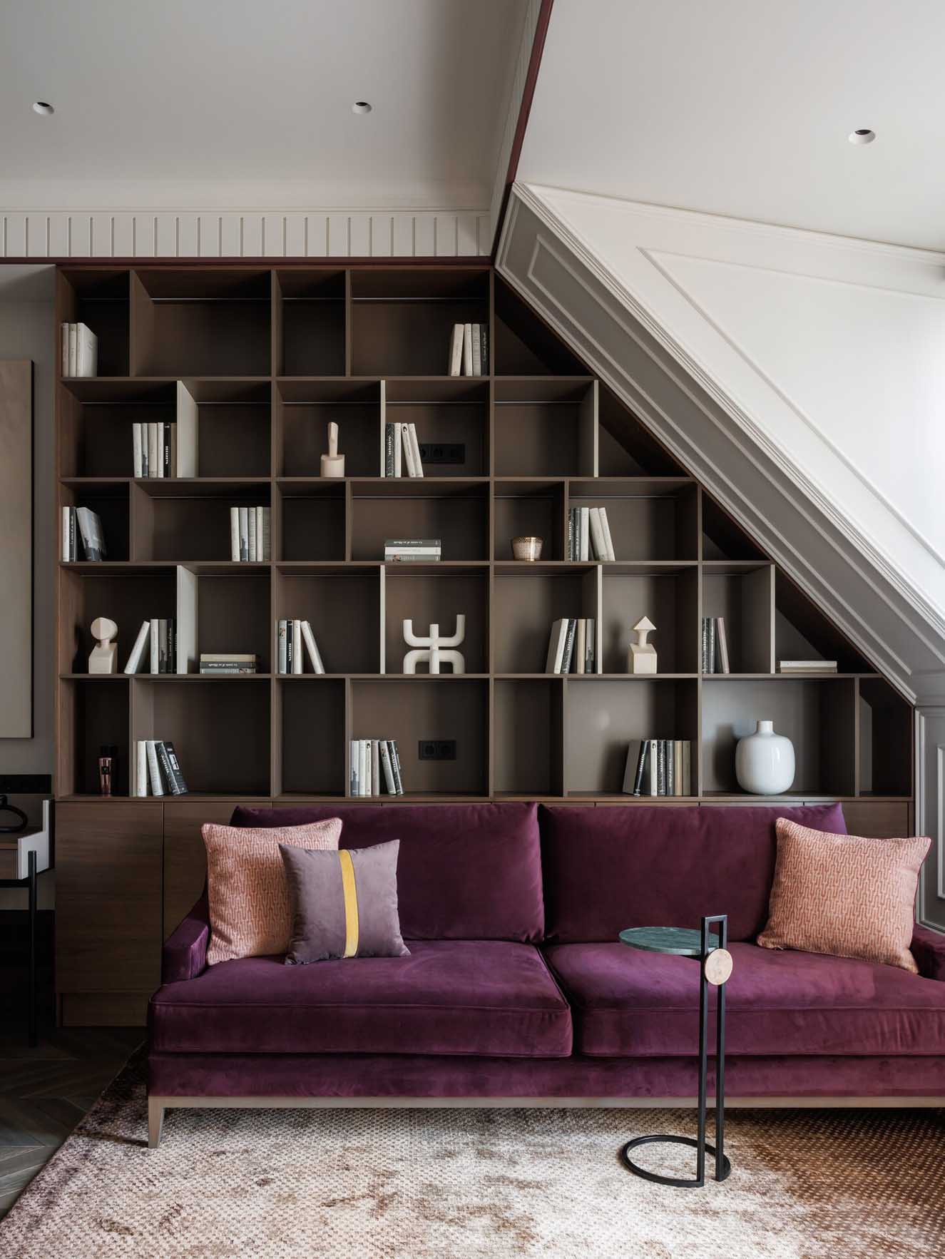 .A kétszobás, tetőtéri lakást egy fiatal doktornőnek rendezte be a lakberendező. Az alapkoncepció egy sötét tónusú, kifinomult színvilágú otthon megteremtése volt, ahol a hangsúly a nagy belmagasság kiemelésére és a praktikusan kialakított tárolórendszerekre helyeződik.