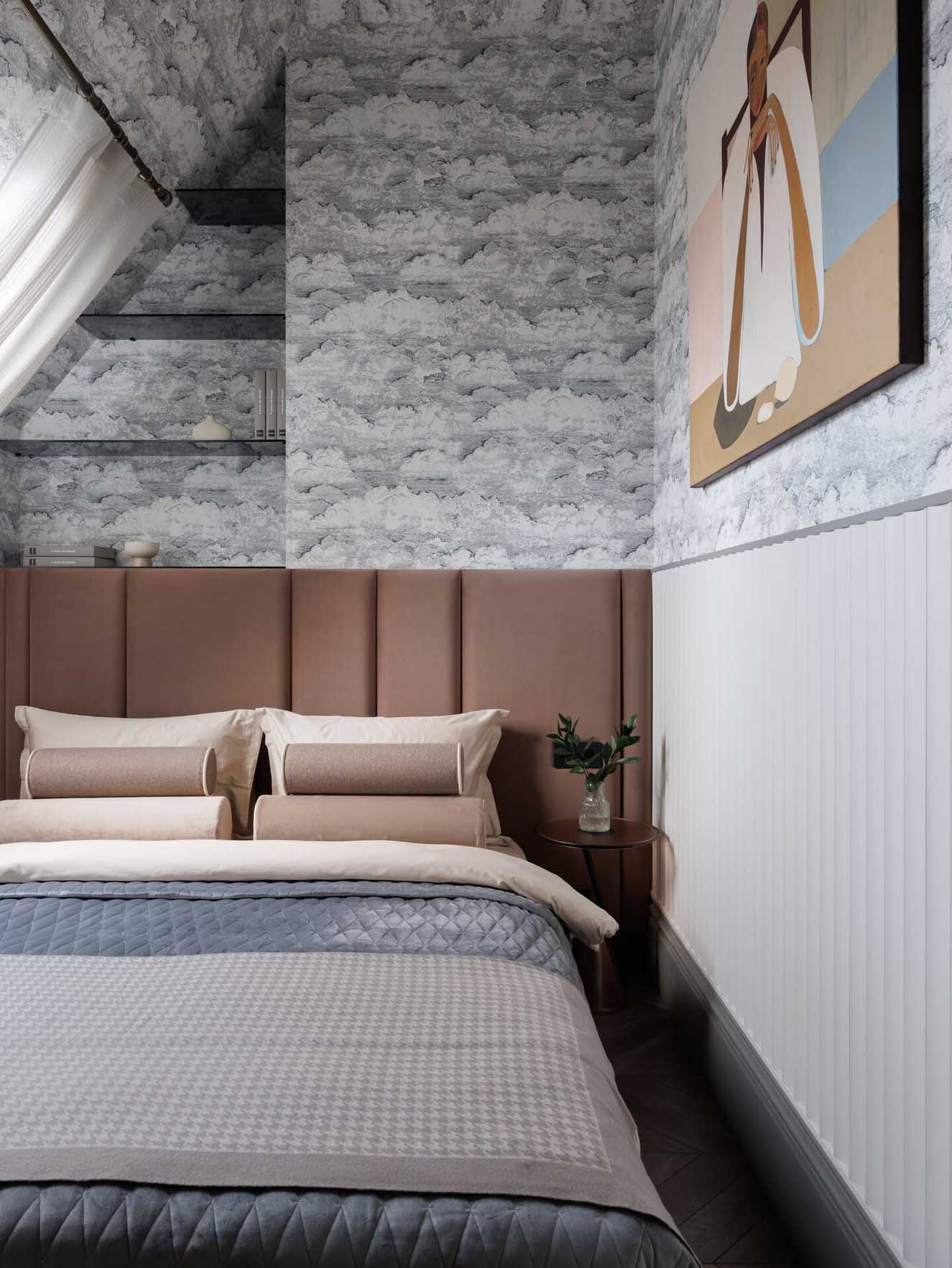 A falakon a mély tónusú, matt festés, a különleges tapéták és a greslap burkolatok harmonikus egységet alkotnak. A tapéták melegséget és finom textúrát visznek a térbe, míg a természetes kő hatású, fugamentesen burkolható greslapok nemcsak esztétikusak, de a nagyméretű, illesztés nélküli felületeknek köszönhetően a tisztán tartásuk is rendkívül egyszerű.