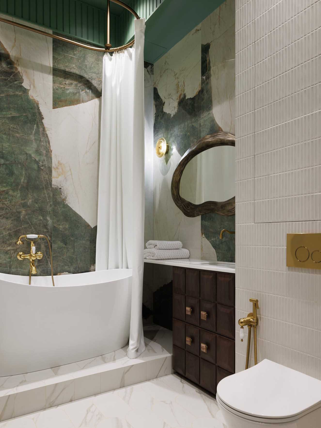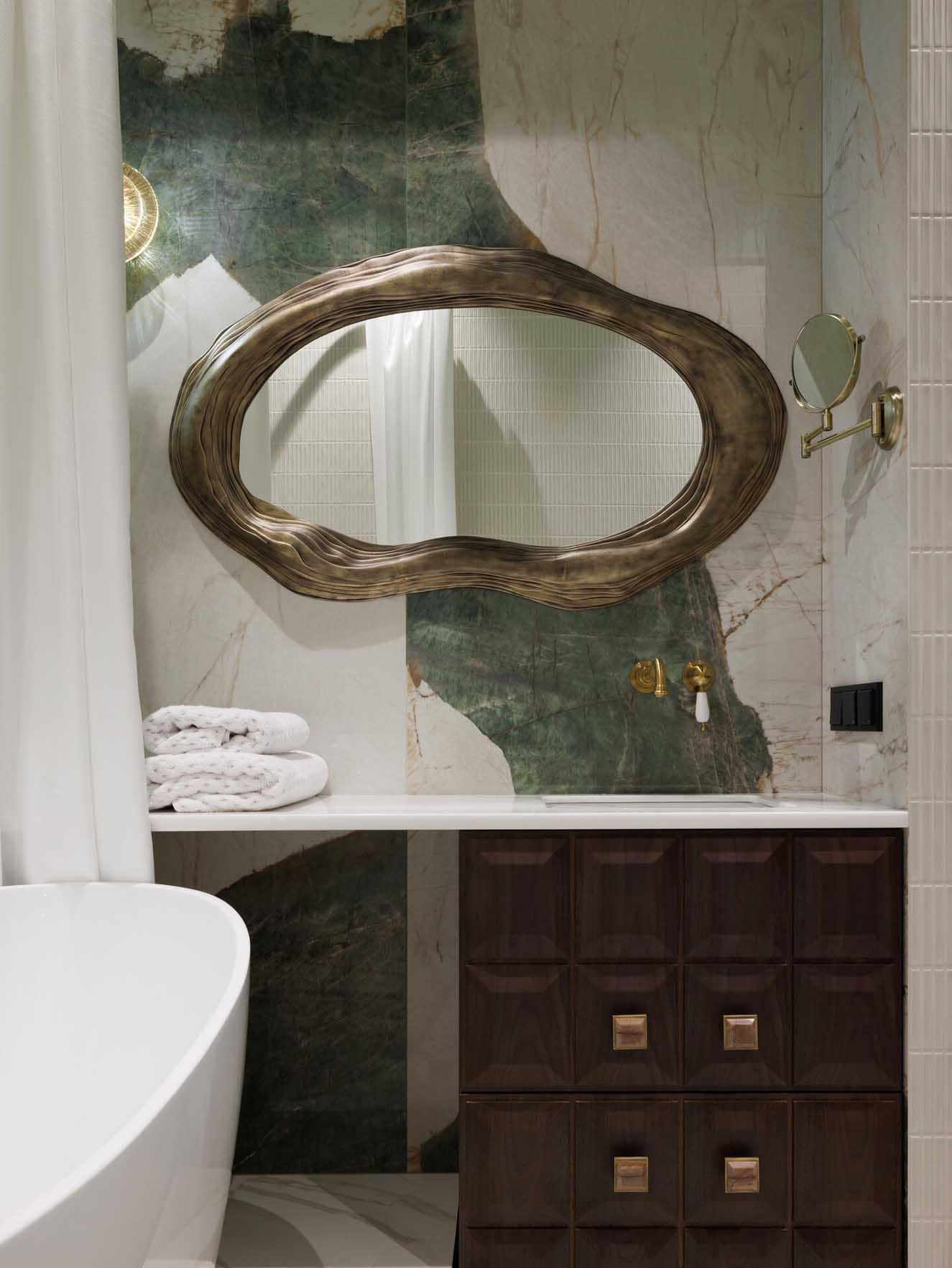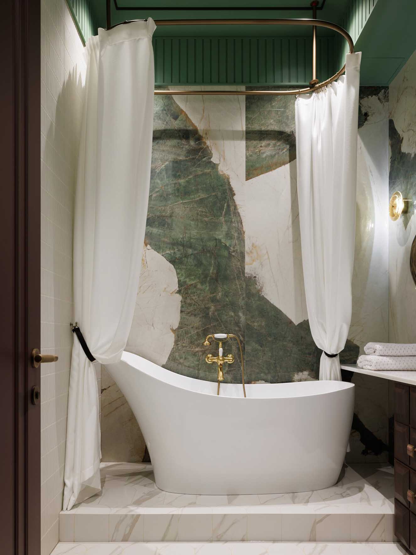 A fürdőszoba fókuszpontja a szabadon álló kád, amelynek intimitását és funkcionalitását egy egyedi sárgaréz karnison futó, vízlepergető textíliából készült zuhanyfüggöny biztosítja, lehetővé téve a zuhanyzást is. A tárolásról egy nagyméretű, széles pulttal rendelkező mosdószekrény gondoskodik. Innovatív megoldásként a hagyományos törölközőszárító radiátor helyett egy falfűtési rendszert, úgynevezett „meleg falat” alakítottak ki, amely diszkréten oldja meg a törölközők szárítását, mentesítve a teret a felesleges vizuális zajtól.