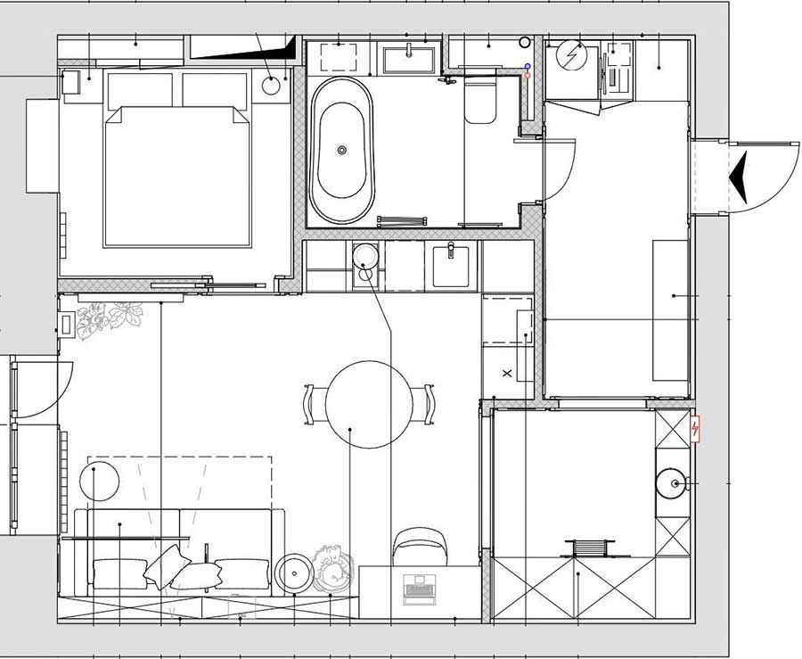 A lakás eredeti alaprajzát a tervezők finomhangolták, a helyiségek alapvető funkcióit megőrizve. A beavatkozások elsősorban a tárolórendszerek optimalizálását és az ajtók, átjárók áthelyezését célozták. Az átalakítás eredményeként egy tágas, egységes konyha-nappali tér, különálló hálószoba, gardrób, tágas előszoba és egy komfortos fürdőszoba jött létre.