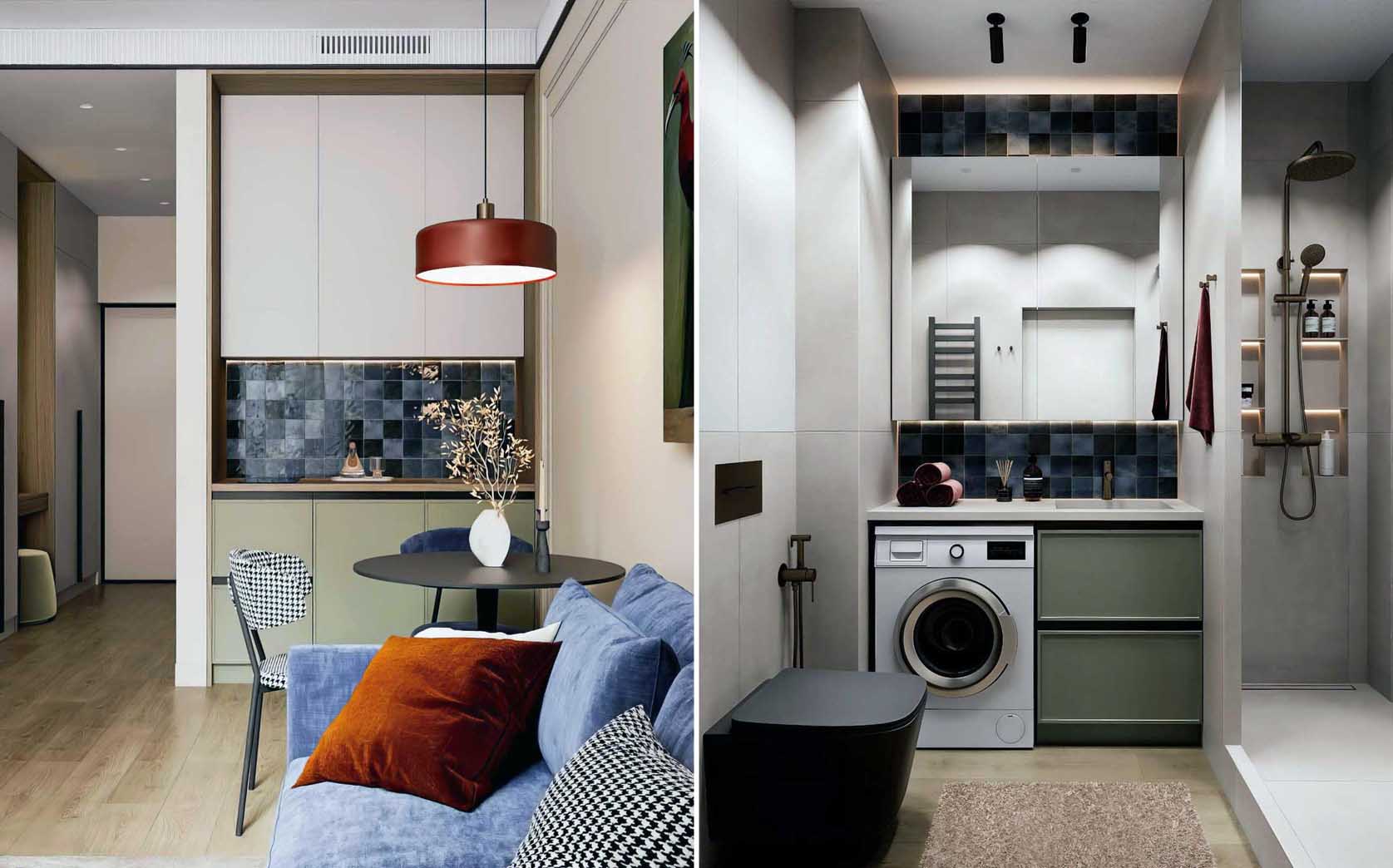 Egy 23 m²-es minigarzont tervezett a lakberendező, a kis területen arra koncentrált, hogy az átgondolt funkciók (tárolóhelyek, dolgozósarok, konyha) és az igényes, esztétikus enteriőr összhangja feledtesse a szűkös teret, és egy pályakezdő fiatalnak tökéletesen élhető otthont biztosítson az egyetemi évekre.