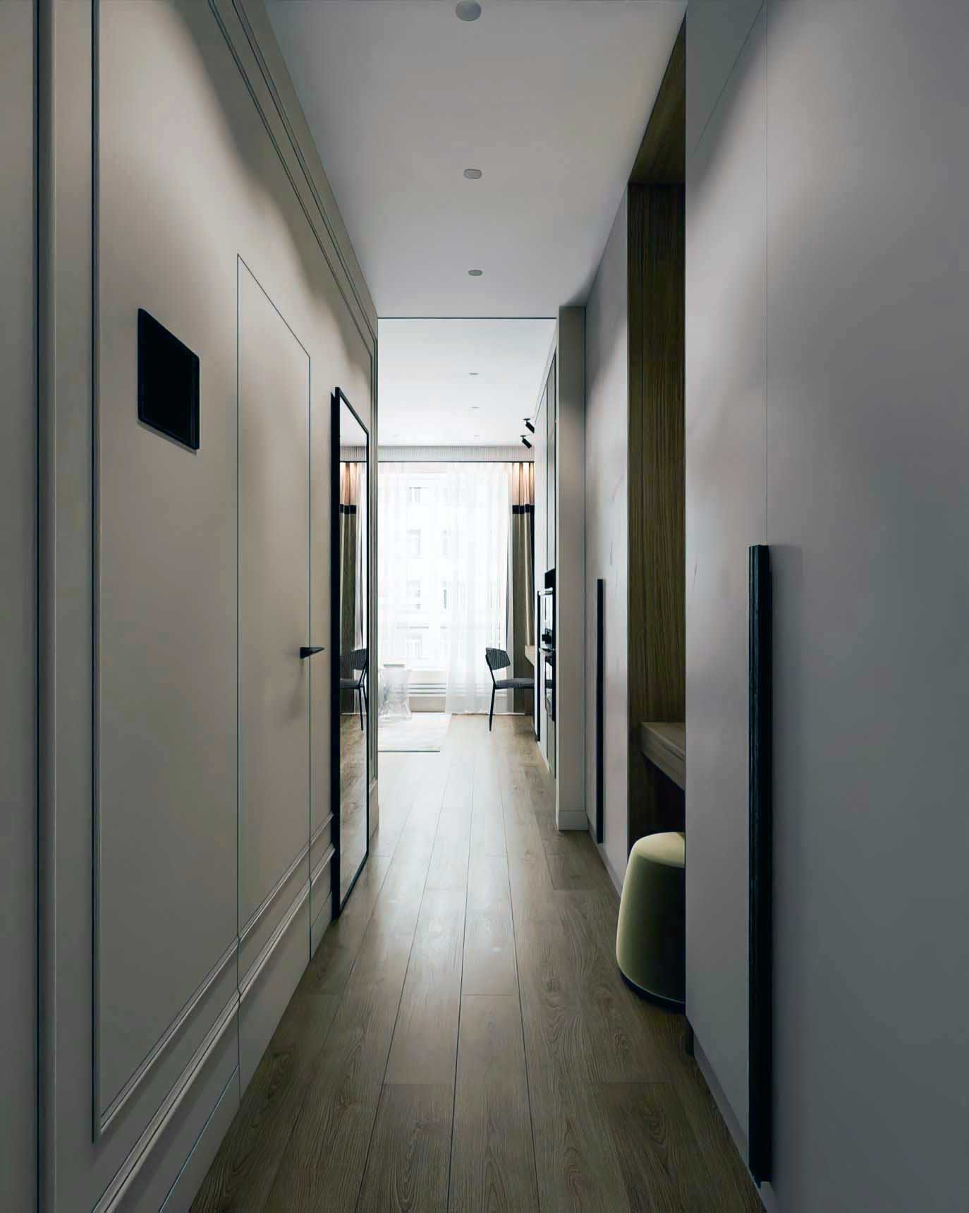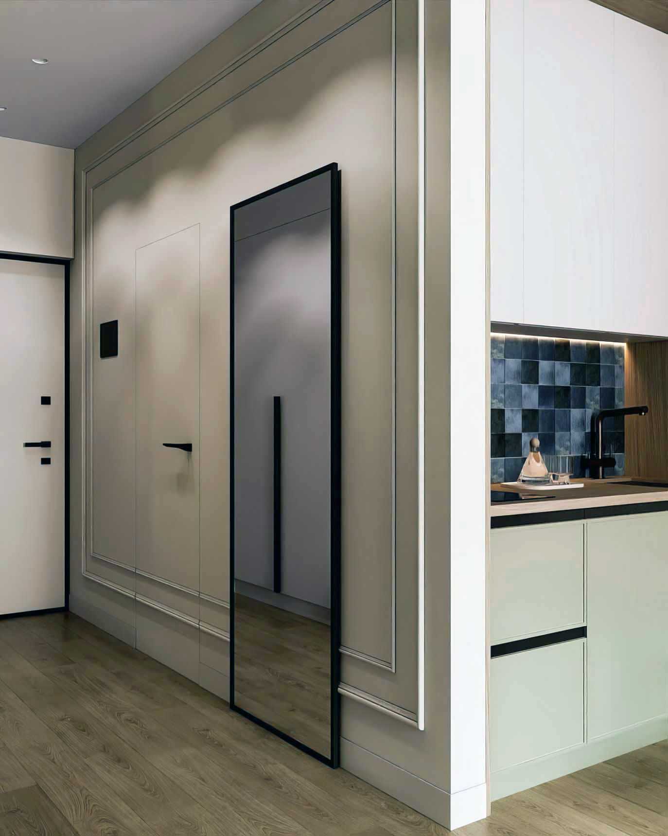 A lakás fő tere felé haladva fokozatosan nyílik ki a tér. A folyosón a teljes alakos tükör nemcsak praktikus, hanem vizuális „megállót” is ad, és a fekete keretével ugyanazt a ritmust viszi tovább, mint a többi részlet. A beépített sík felületek – ajtók, falburkolatok, szekrényfrontok – szándékosan kevés tagolást kapnak, így a közlekedő nem zsúfolódik túl, inkább egy tiszta, galériaszerű átvezető zónaként működik.