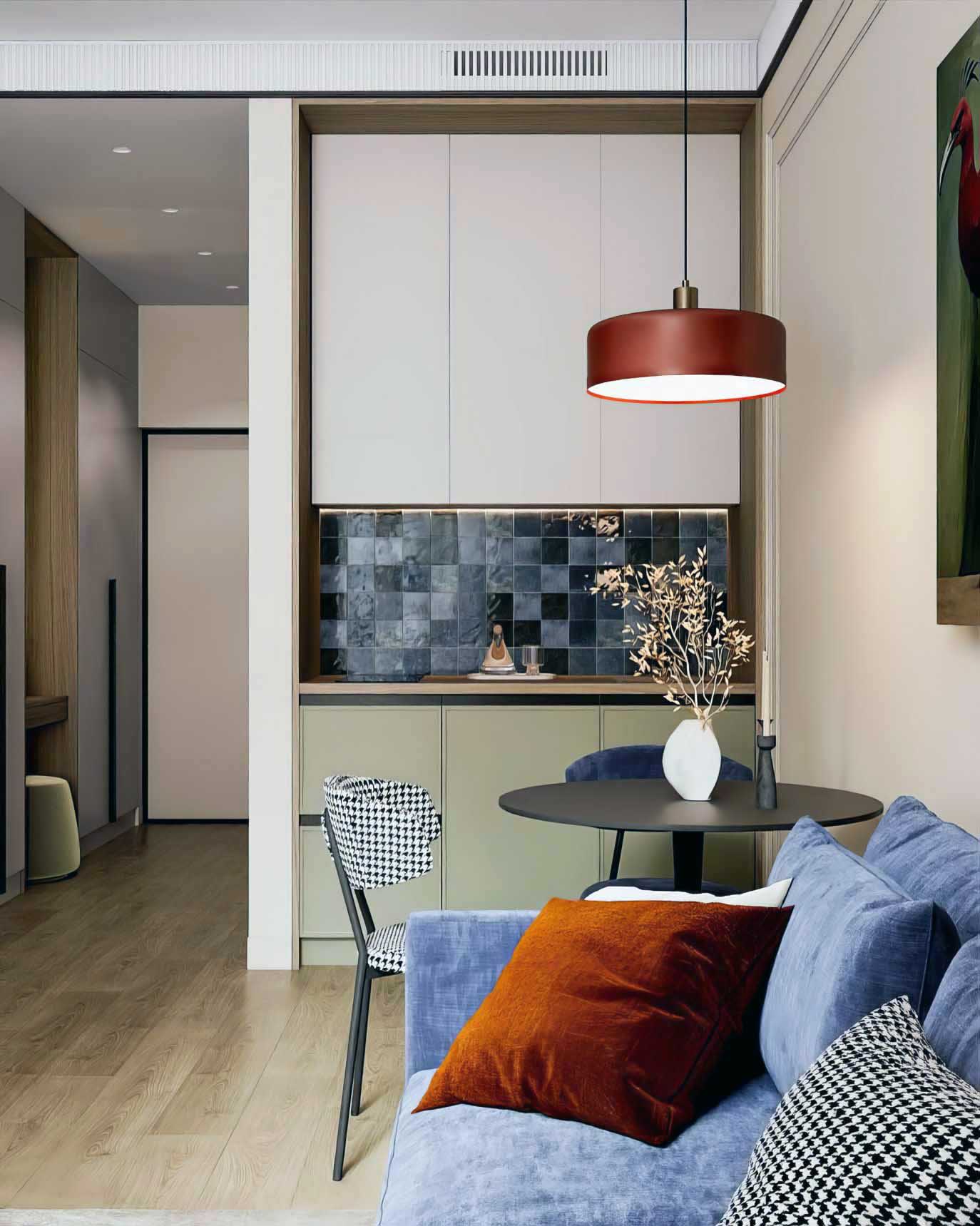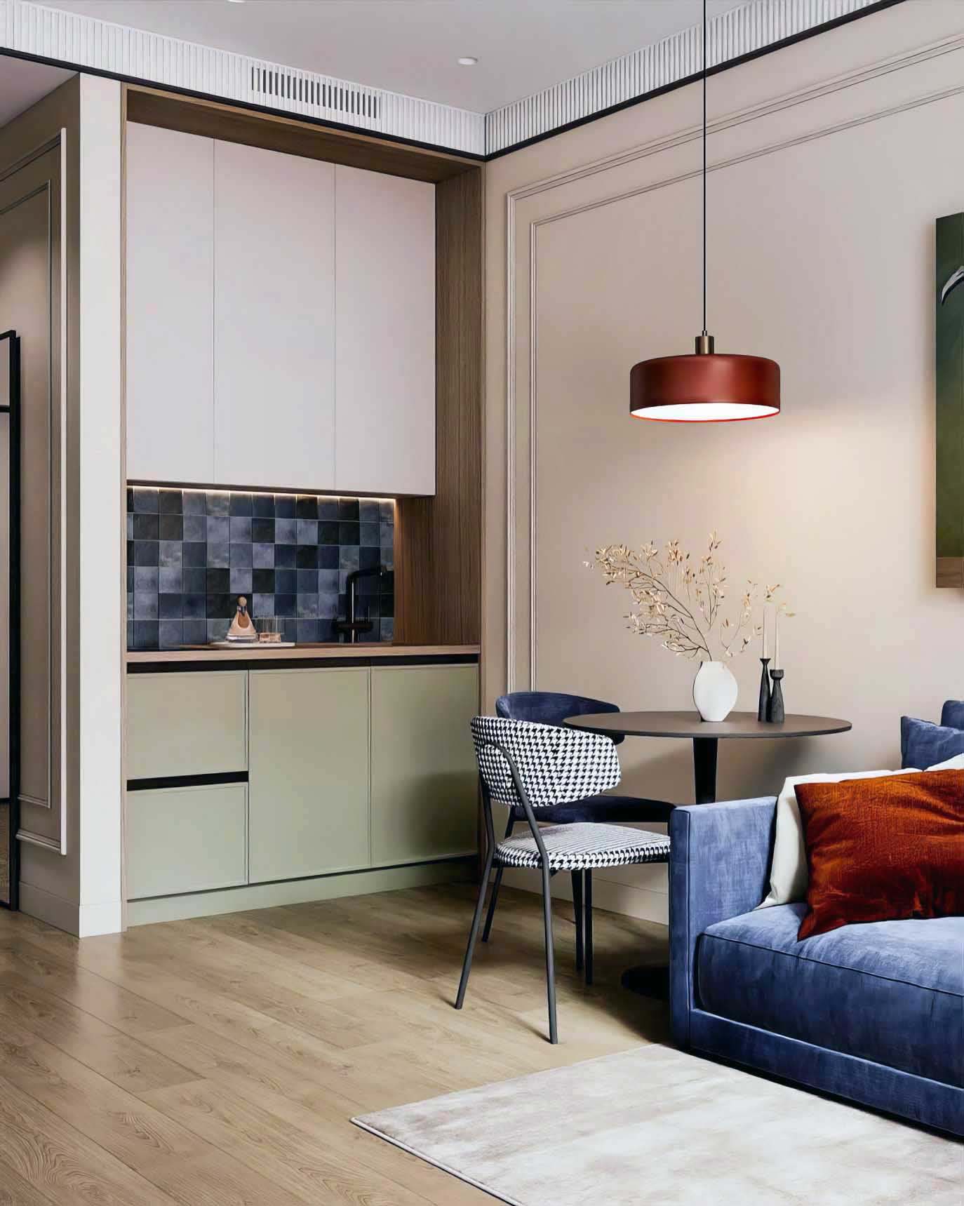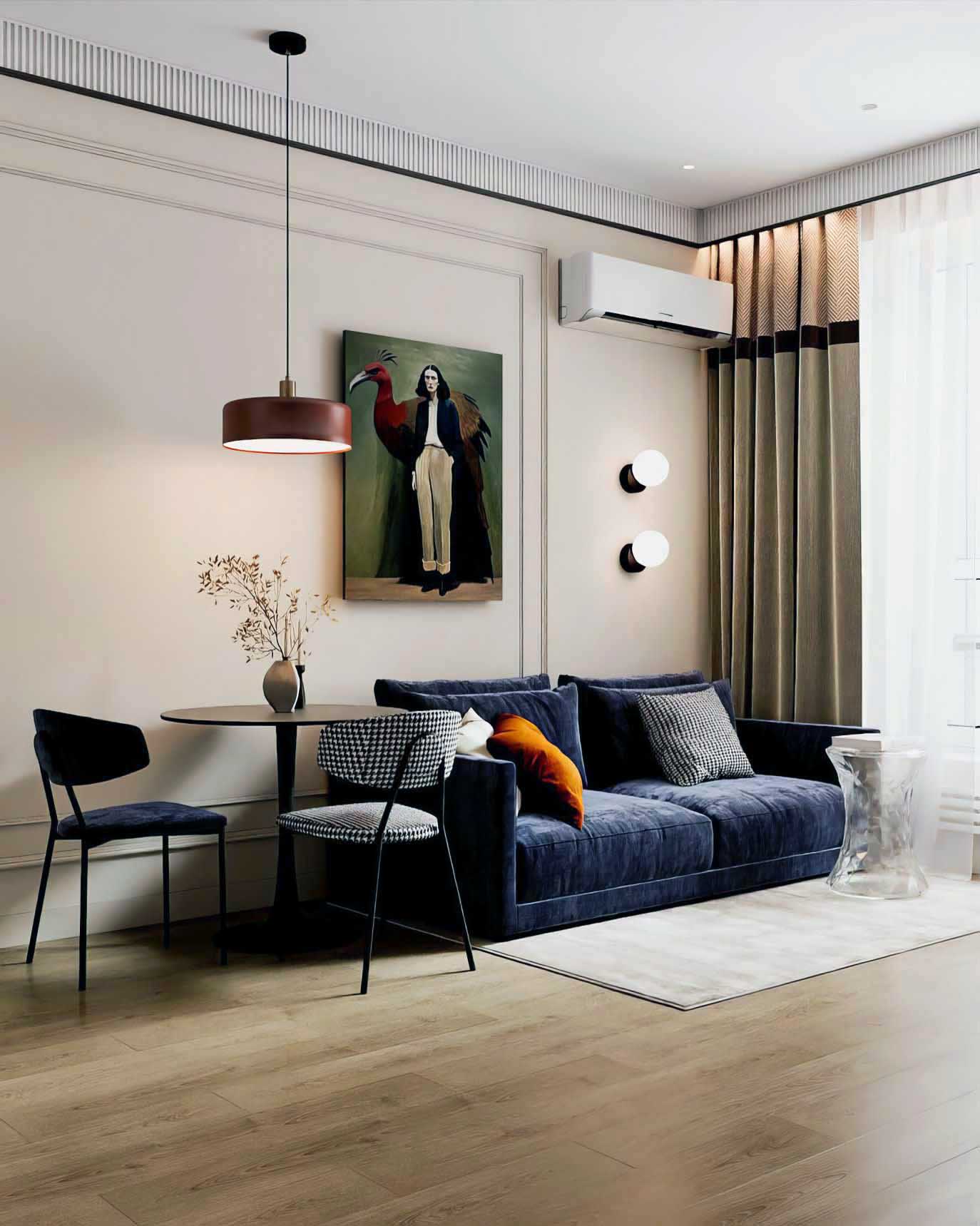 A nappaliban a kék kanapé adja a fő tömeget, amit egy rozsdás tónusú párna és a fekete-fehér minták (szék, díszpárna) tesznek élénkebbé, anélkül hogy túl sok szín jelenne meg egyszerre. A kerek étkezőasztal jó választás kis térben: könnyebb kerülni, és a közlekedési sávok is tisztábban megmaradnak.