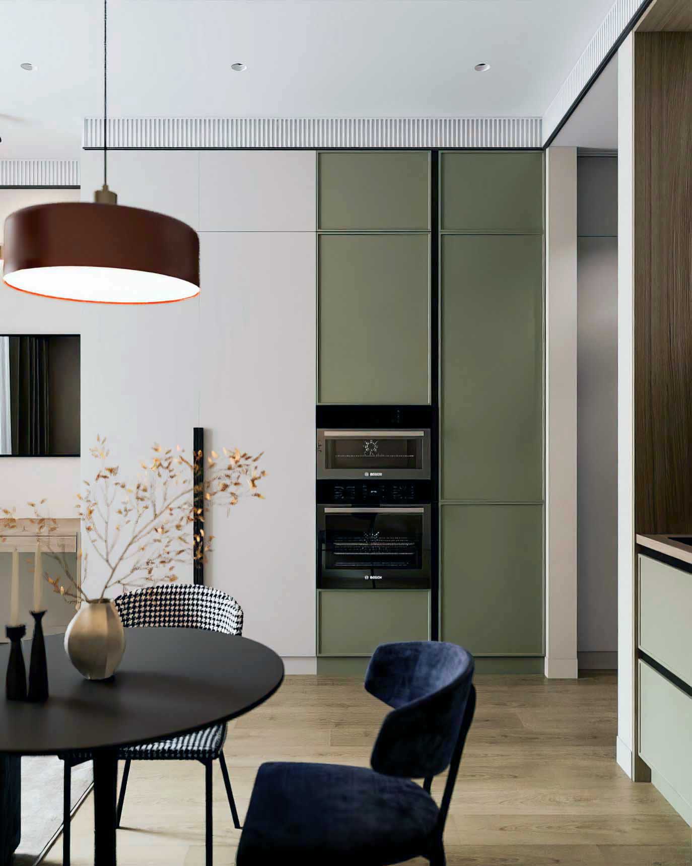 A konyha a térbe simul, mégis önálló egységnek látszik a szín- és anyagváltások miatt. A felső, világos szekrények könnyítik a látványt, az alsó olívazöld frontok pedig mélységet adnak; a sötét munkapult és a kékes árnyalatú, kis méretű burkolat erős, de kontrollált fókuszpont. A rejtett pultvilágítás kiemeli a csempét és használat közben is jól működik, a magas beépített blokk (tároló és sütők) pedig a kis alapterülethez illő módon „függőlegesen” oldja meg a tárolóhelyek problémáját.