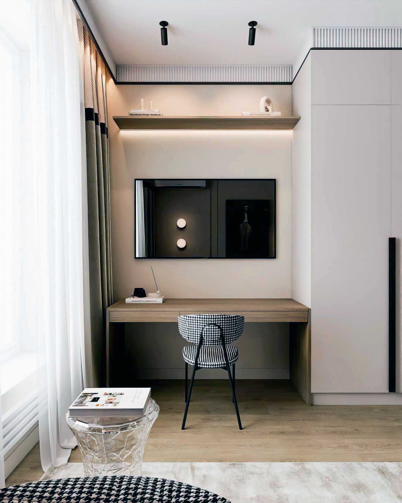 A dolgozósarok fa felületű pultja egyszerre spórol helyet és egységesíti a látványt a padlóval; felette a falra tett képernyő és a polc rejtett fényével este is hangulatosan használható.