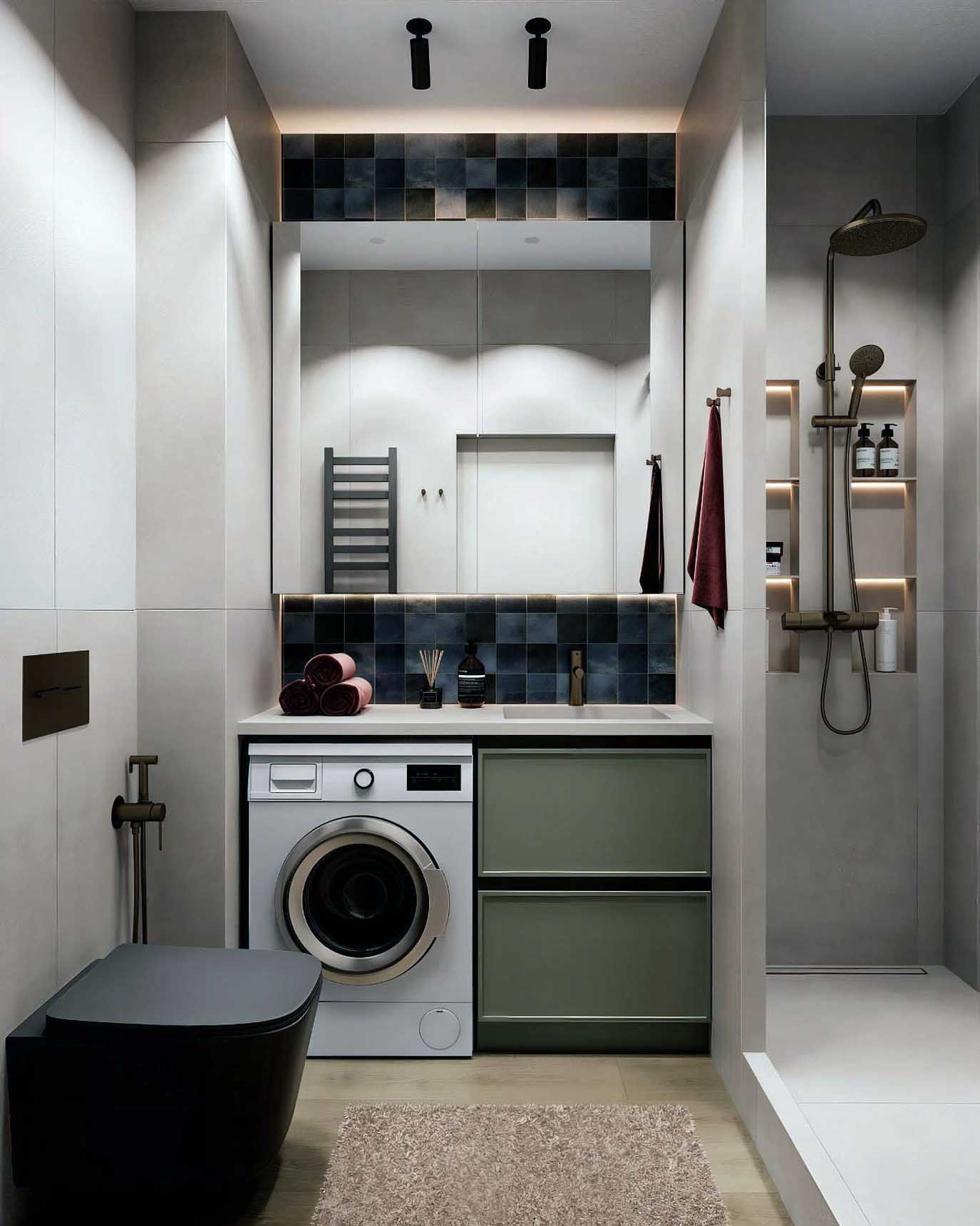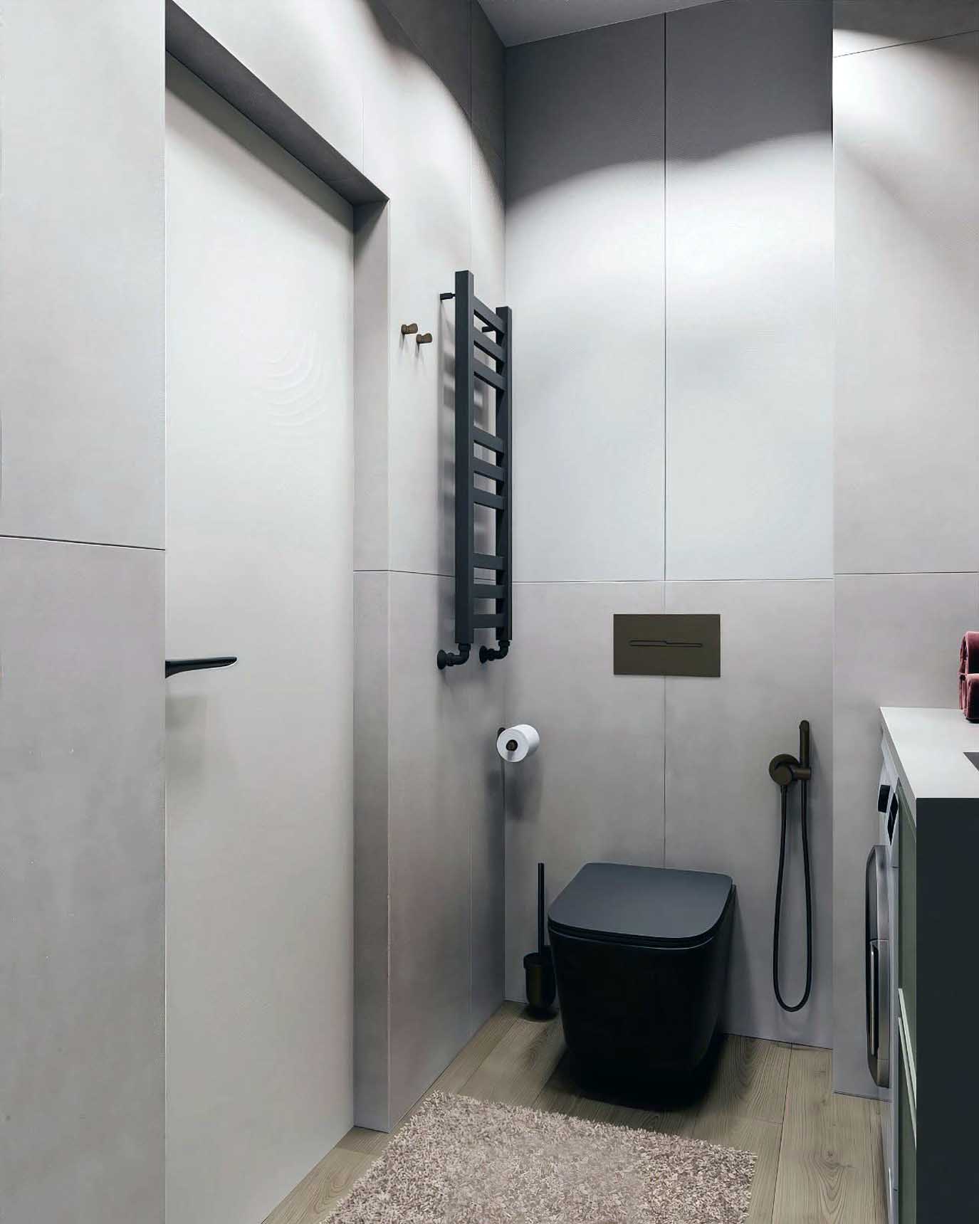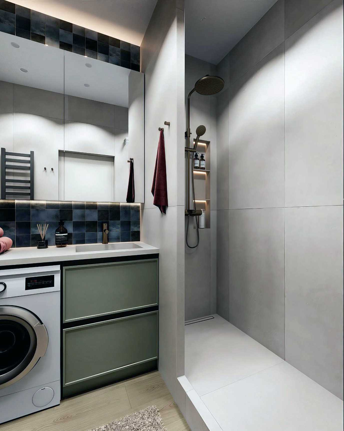 A fürdőszoba ugyanebbe a rendszerezett szemléletbe illeszkedik: a mosógép a pult alá kerül, a tárolás fiókokban és világított falfülkékben történik, a sötétebb burkolatsáv és a fekete törölközőszárító pedig ugyanazt a kontrasztlogikát viszi tovább, mint a lakás többi helyiségében.