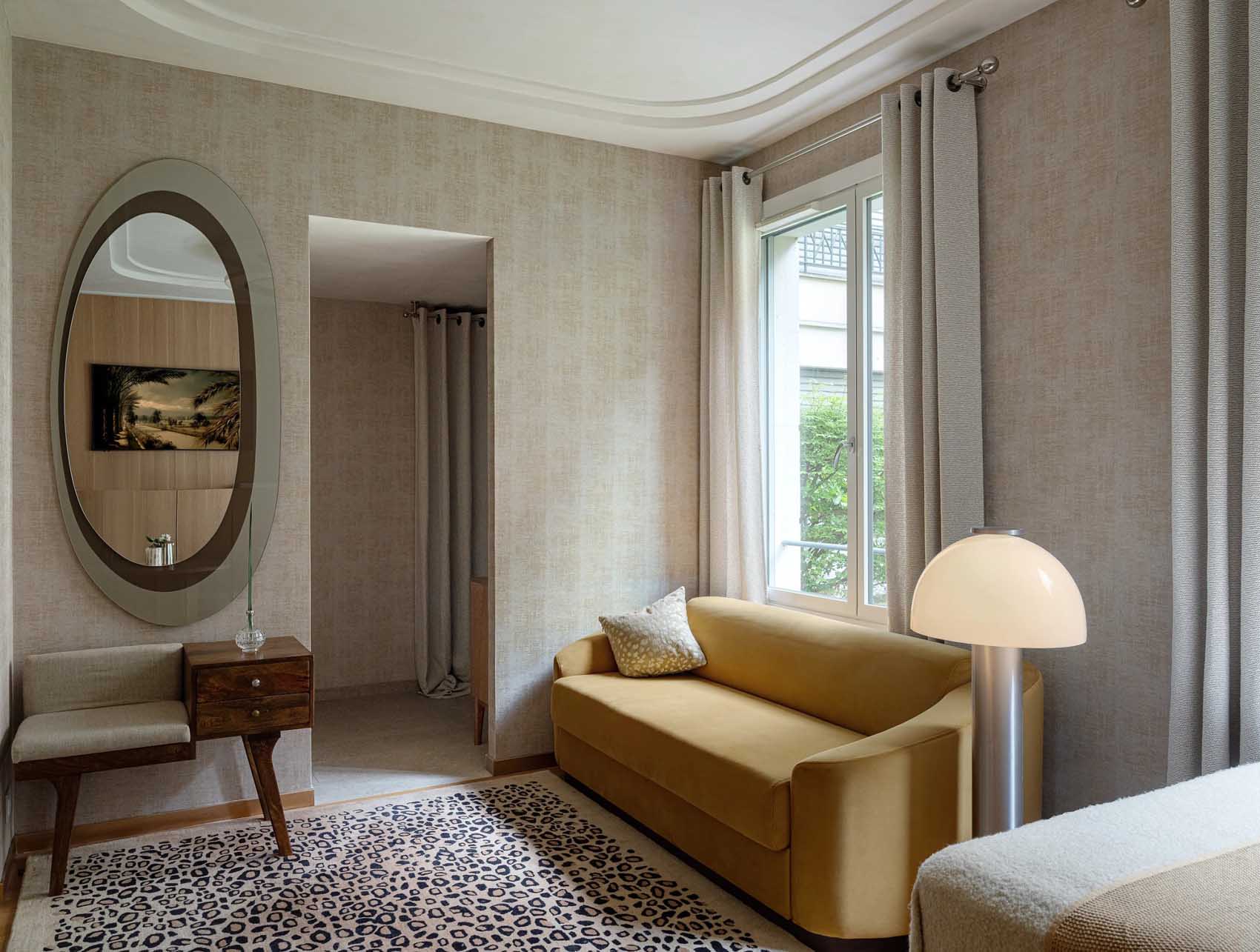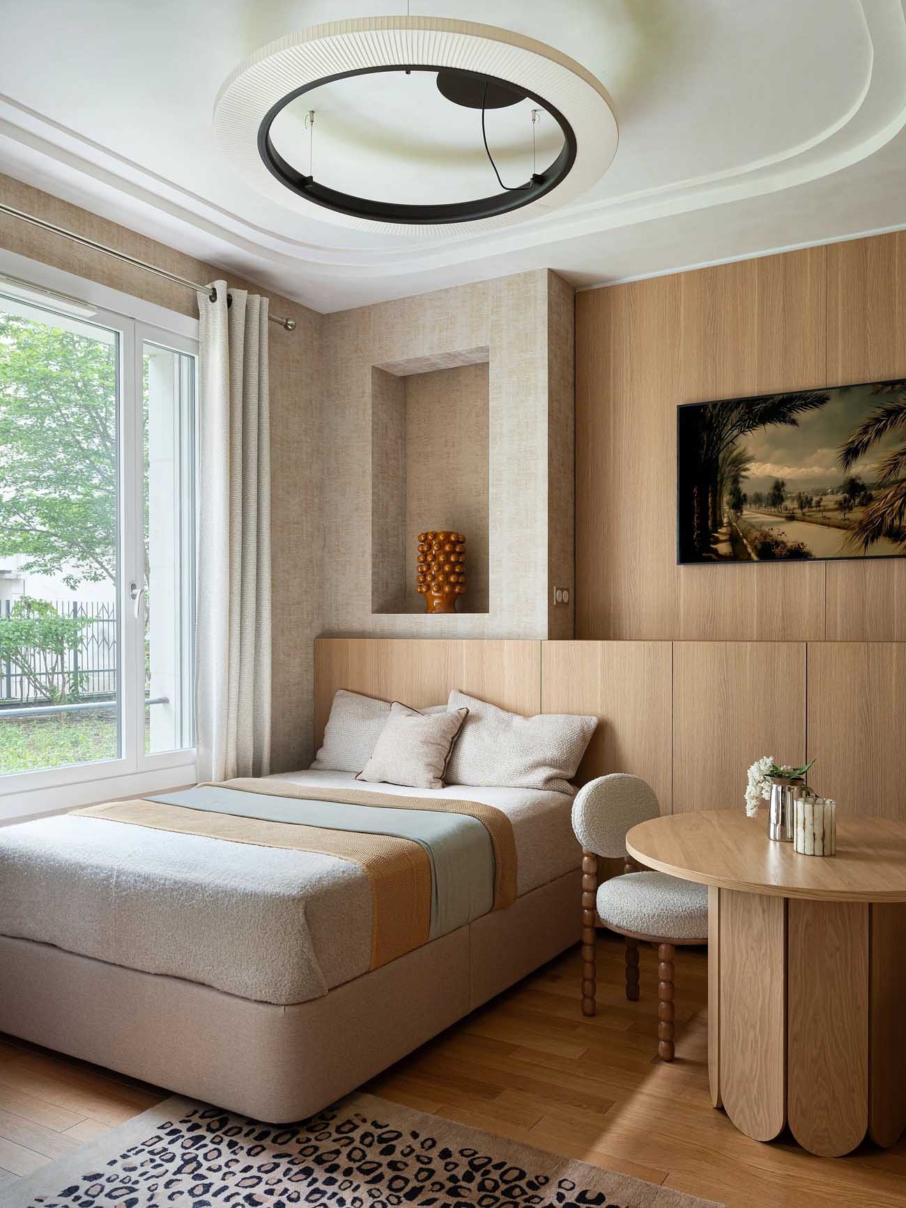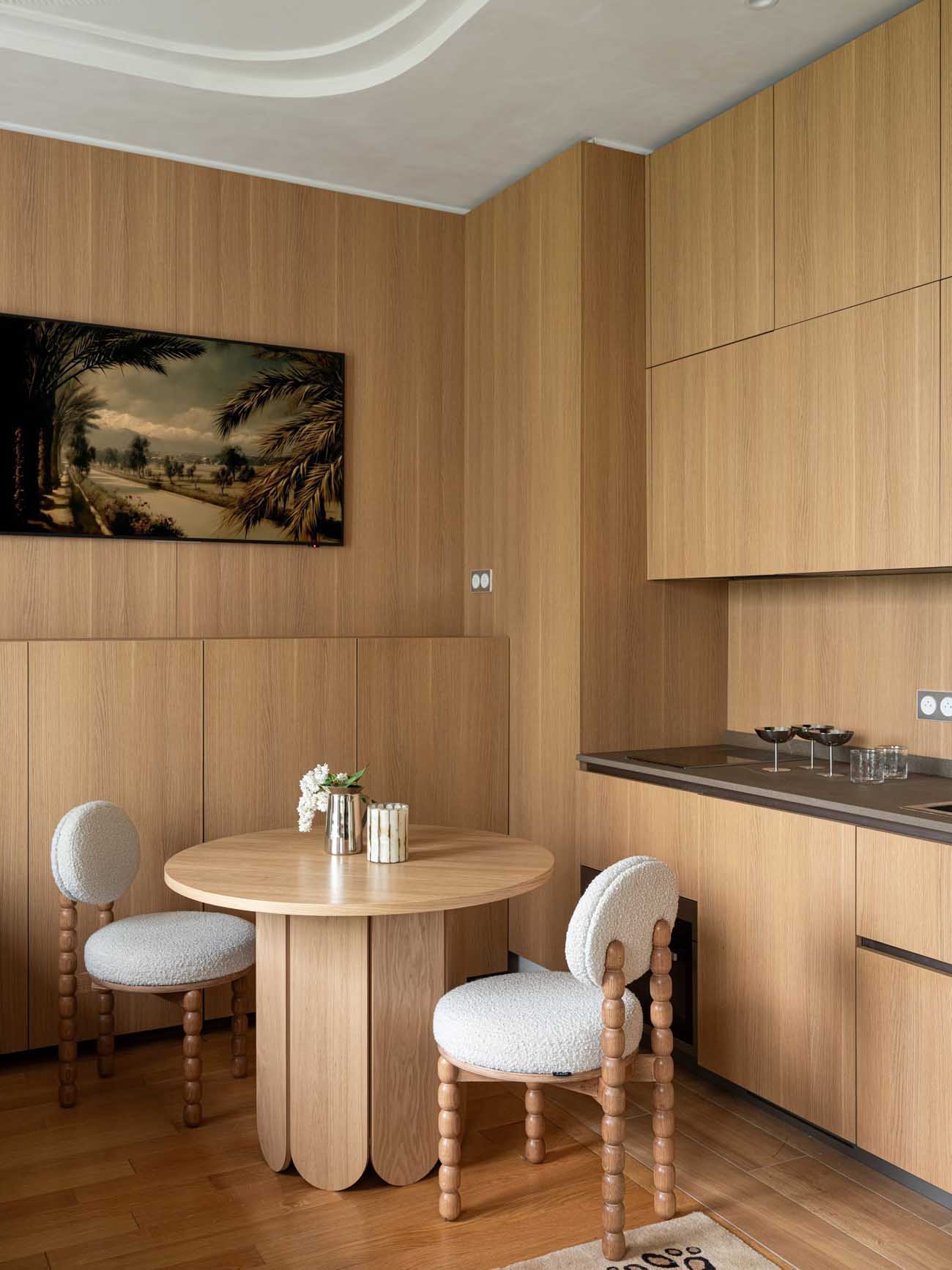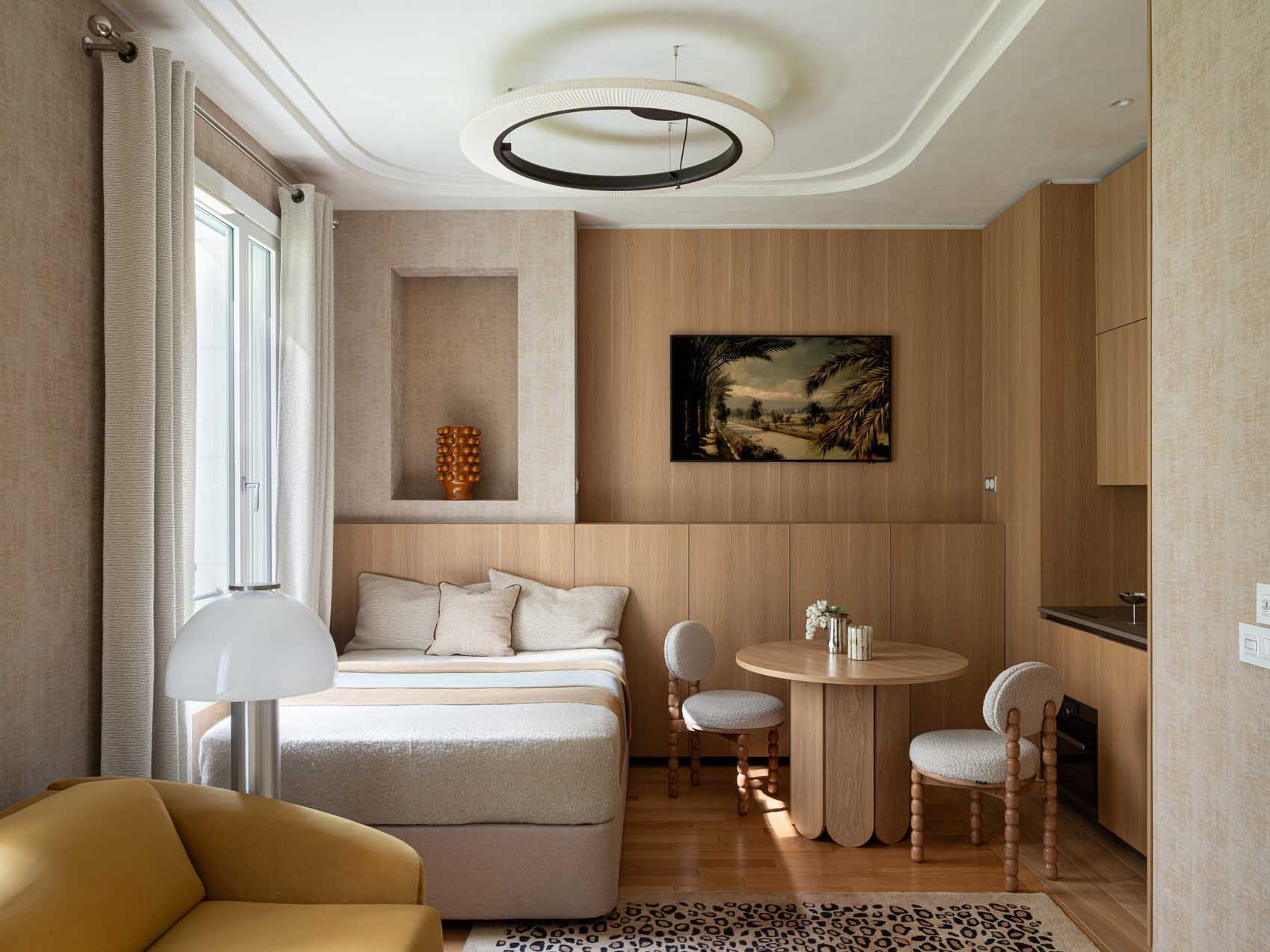 A Párizs 7. kerületében található kis stúdiólakásban a tervezési koncepció központi eleme a tér vizuális tágítása volt. A lakás minden négyzetcentimétere tudatos mérlegelés eredménye, ahol a cél a “kis tér, nagy lehetőségek” elvének érvényesítése. A zónák elosztása logikus és folytonos: a konyha összhangban van az étkezővel, amely finom átmenetet képez a nappali és a háló zónák felé.