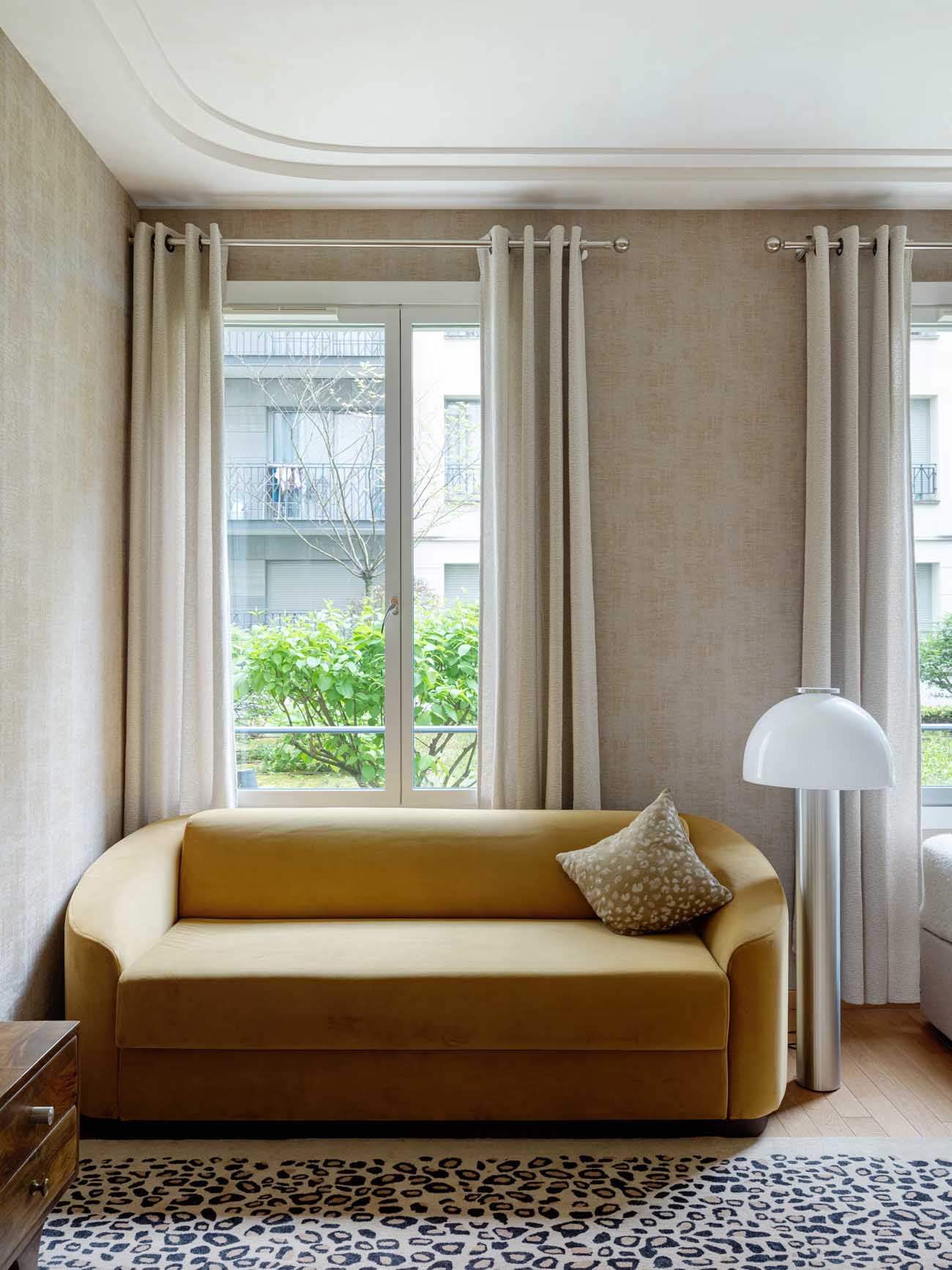 A lakás karaktere a részletekben rejlik. A nappali-háló térben elhelyezett kanapé nemcsak vendégágyként funkcionál, de erőteljes mustársárga színével fókuszpontot is kijelöl. A textúrák játékát egy hangsúlyos, állatmintás gyapjúszőnyeg teszi teljessé, amely merész kontrasztot alkot a letisztult bútorzattal.