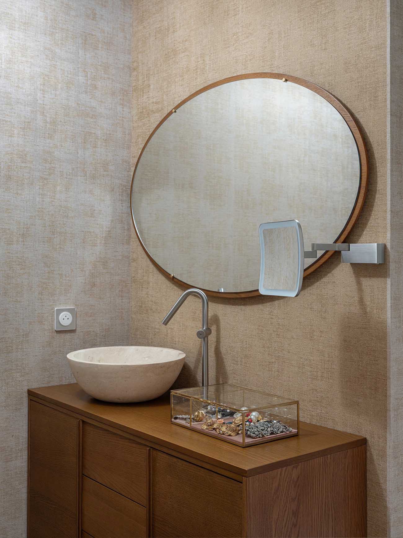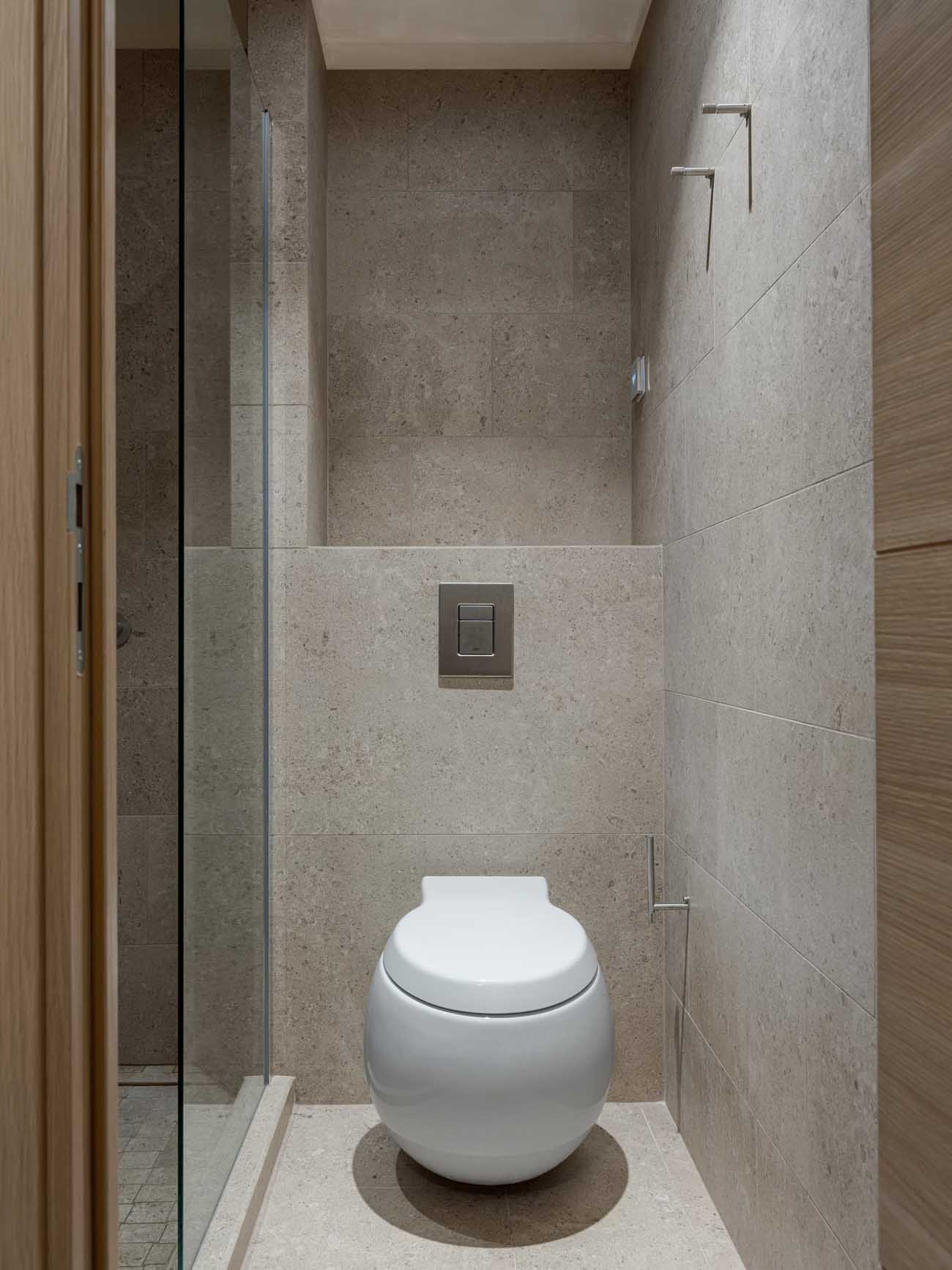 Az alaprajzi adottságok és a párizsi klíma sajátosságai – különösen a páratartalom – egyedi megoldást szültek a vizesblokk kialakításánál. A szűkös alapterület miatt a fürdőszoba funkcióit kettéválasztották: a zuhanyzó és a WC egy zárt helyiségbe került, míg a mosdókagyló a közlekedő zónában kapott helyet.