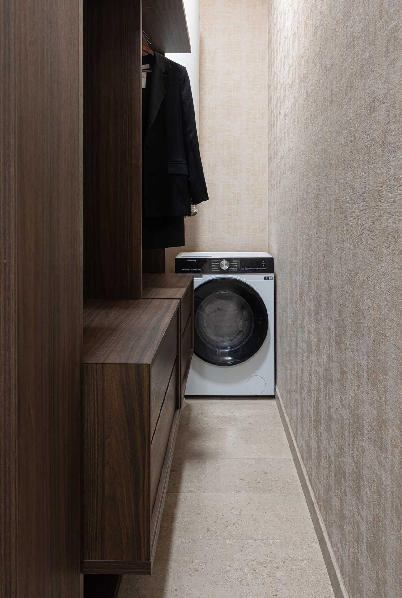 A térszervezés egyik legleleményesebb megoldása a gardrób és a háztartási helyiség kialakítása. A ruhák tárolását és a mosógépet egy keskenyebb technikai zónában, egy sűrű szövésű függöny mögött rejtették el. Itt egy moduláris polcrendszer biztosítja, hogy a tulajdonos teljes ruhatára átláthatóan elférjen, mentesítve ezzel a lakóteret a nagy szekrények látványától.