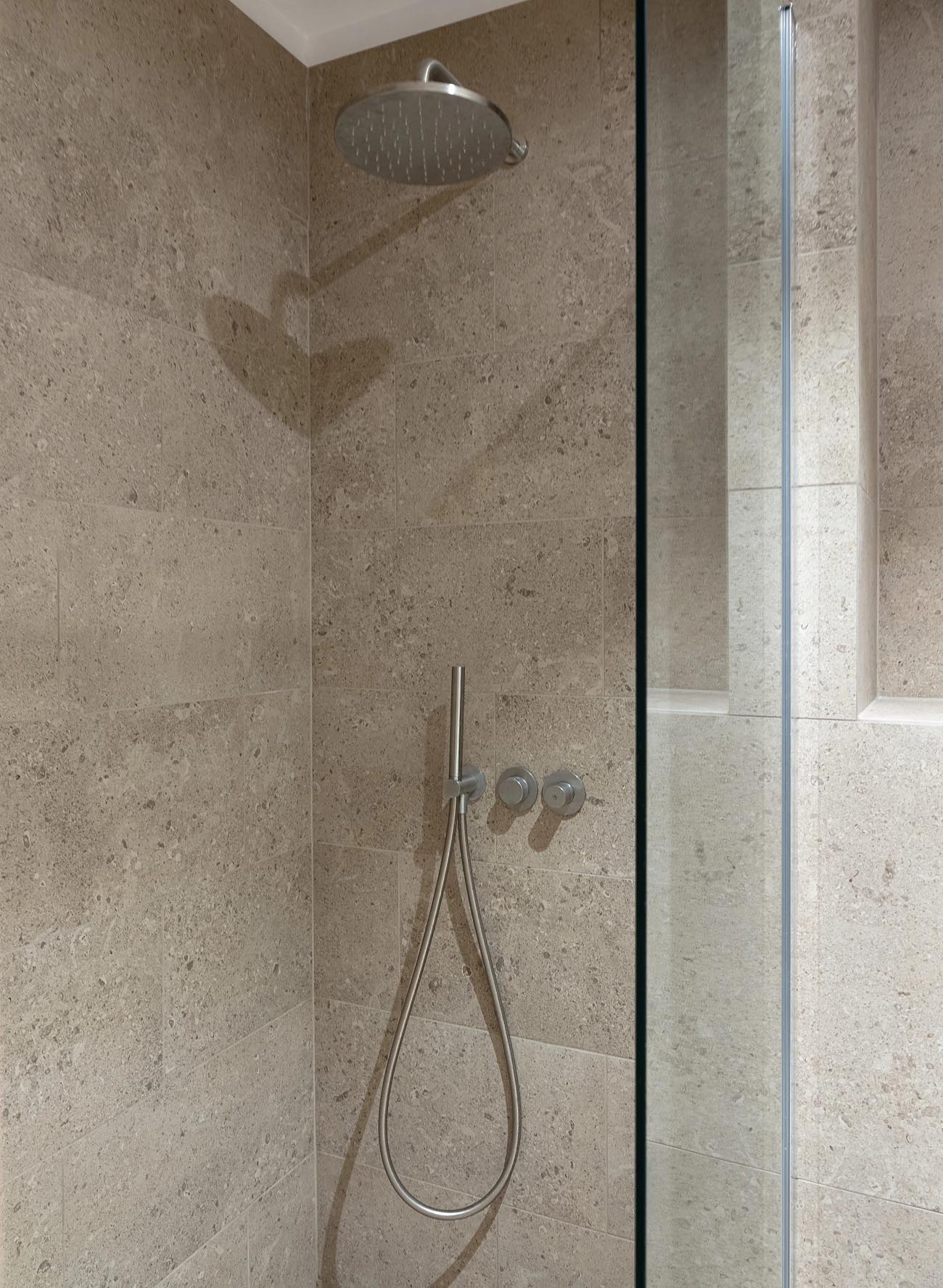 Ez a megosztás nemcsak helytakarékos, de a napi rutin szempontjából is praktikus, elkerülve a nyirkos érzetet a tisztálkodás során. A komfortérzetet tovább növeli a vizesblokkban kialakított padlófűtés. A lakótér meleg fa burkolatával ellentétben itt, valamint a gardrób zónájában, egy organikus hatású, kőmintázatú burkolat került beépítésre, amely vizuálisan is elkülöníti ezeket a kiszolgáló helyiségeket.