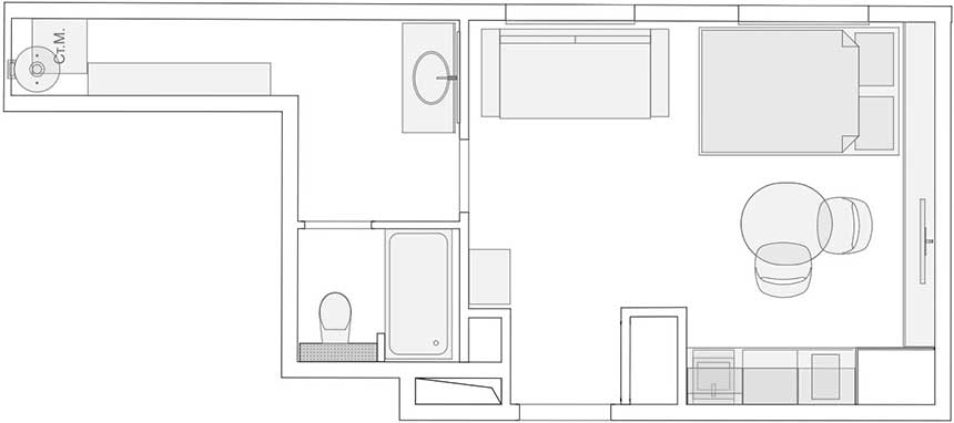 A kis alapterületű lakások egyik legnagyobb kihívása a megfelelő mennyiségű tárolóhely kialakítása anélkül, hogy a bútorok “agyonnyomnák” a teret. Ebben a projektben a konyhabútor mennyezetig érő beépítése biztosítja a maximális helykihasználást. A kompakt méret ellenére a konyha felszereltsége hiánytalan: a beépített sütő, a mikrohullámú sütő, a főzőlap, az elszívó és a mosogatógép is helyet kapott a frontok mögött.