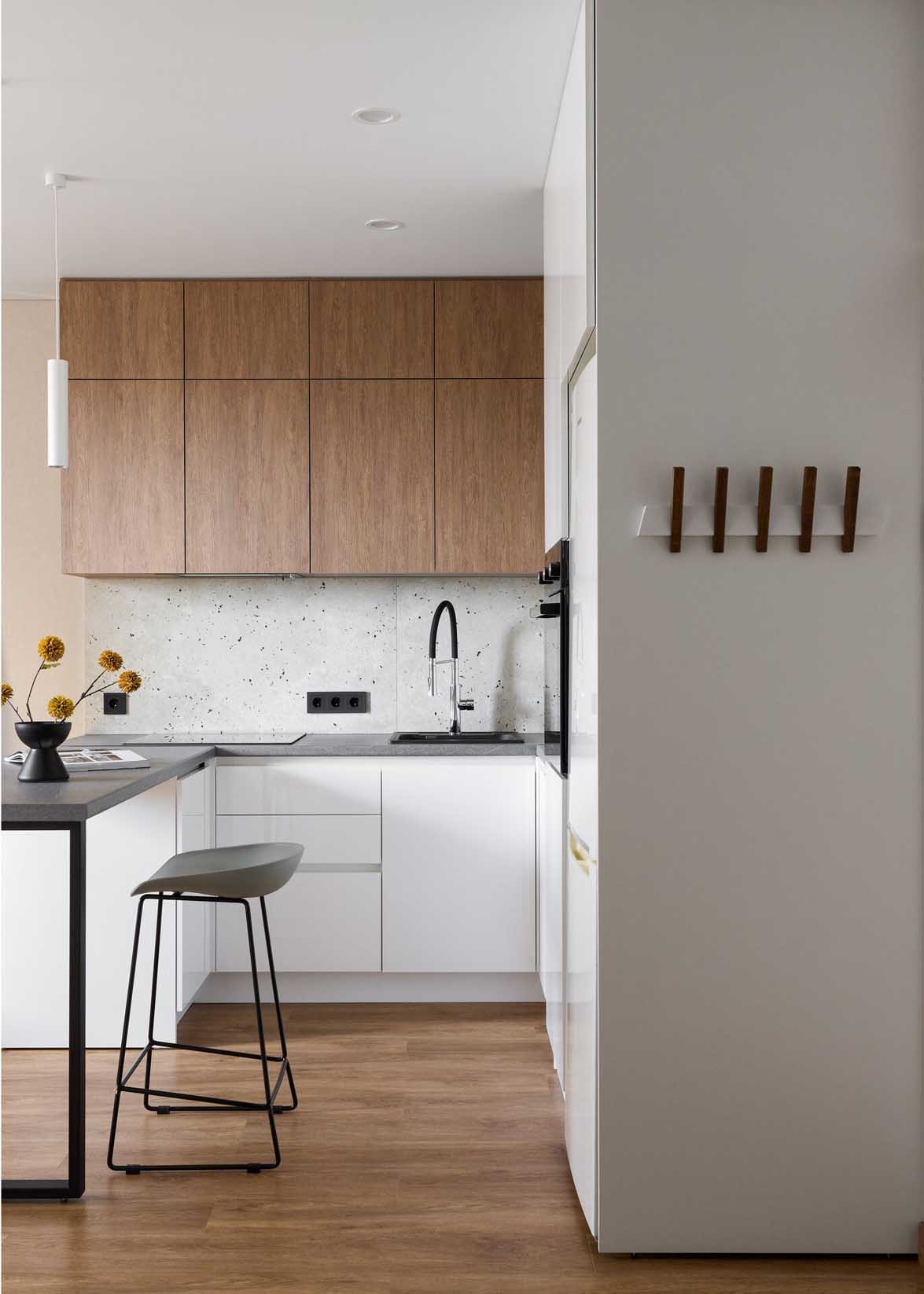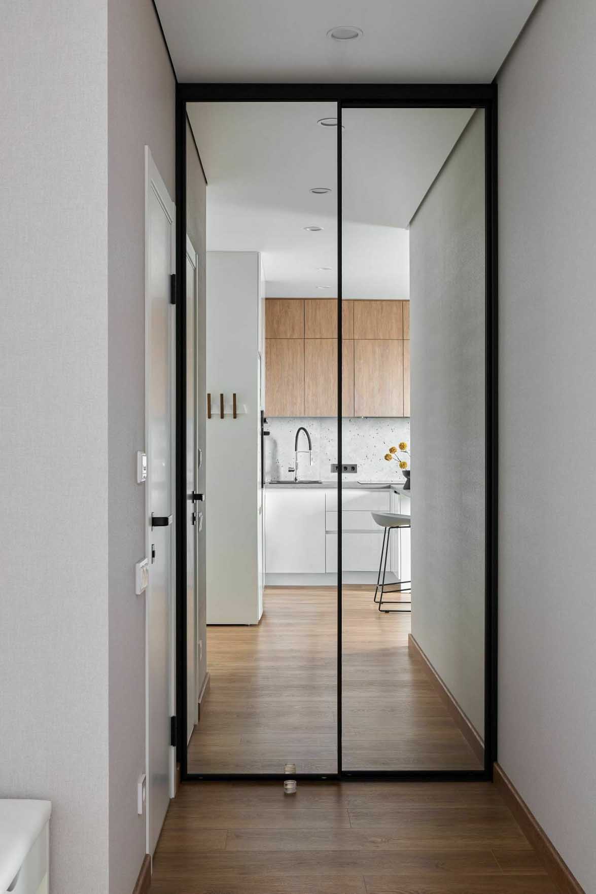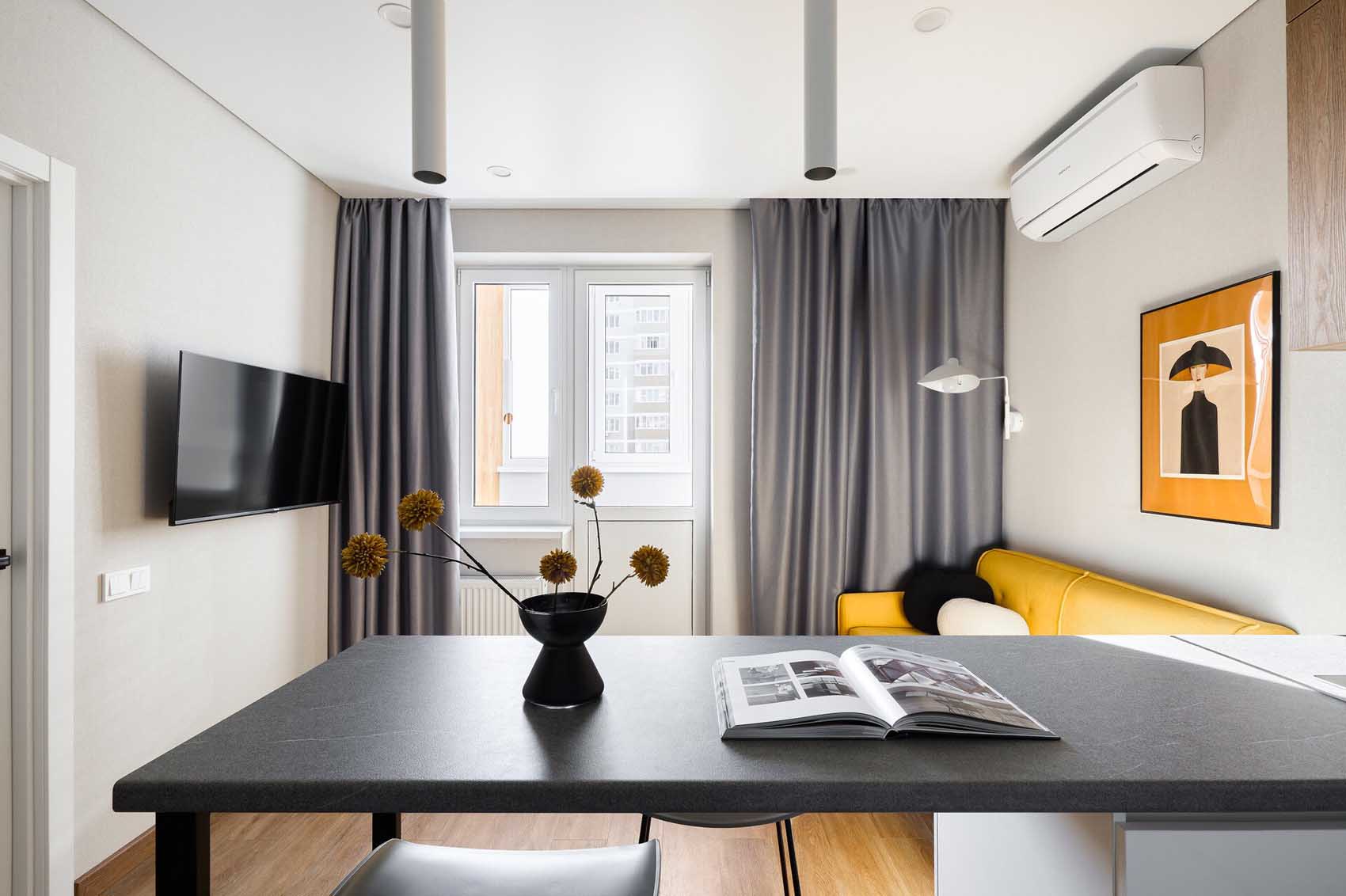 A lakás komfortjának növelése érdekében finomhangolták az alaprajzi elrendezést: a hálószoba bejáratát az előszobából a nappali irányába helyezték át. Ez a megoldás nemcsak a közlekedési útvonalakat ésszerűsítette, hanem finoman egyesítette is a különböző zónákat, miközben azok funkcionális szeparáltsága megmaradt.