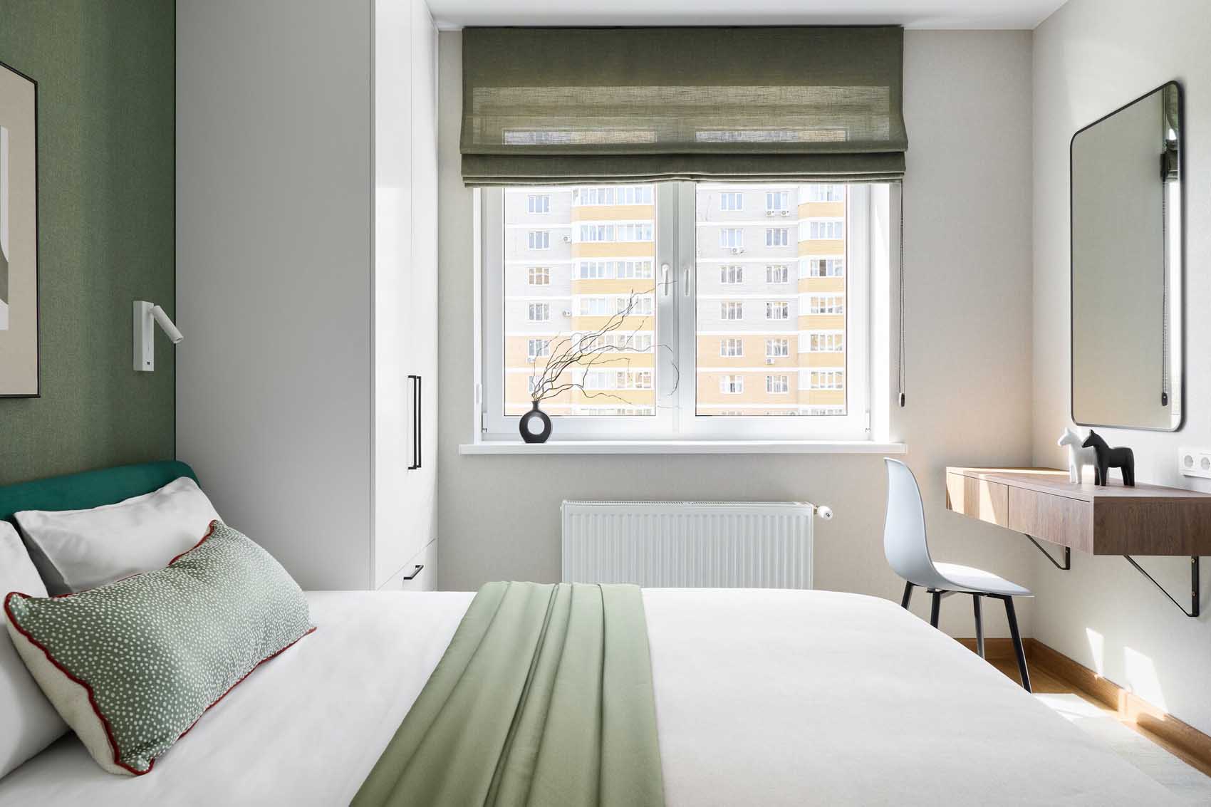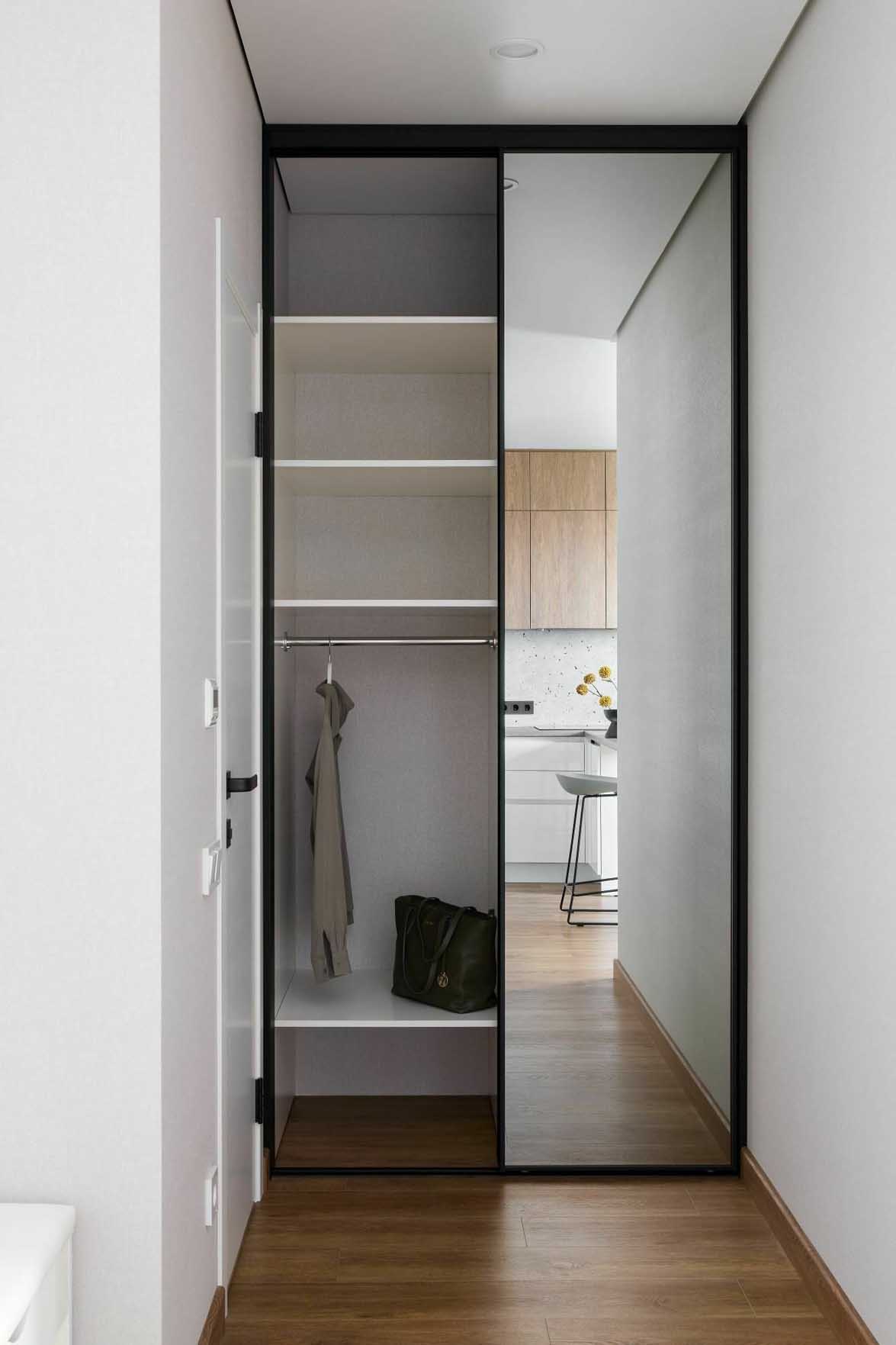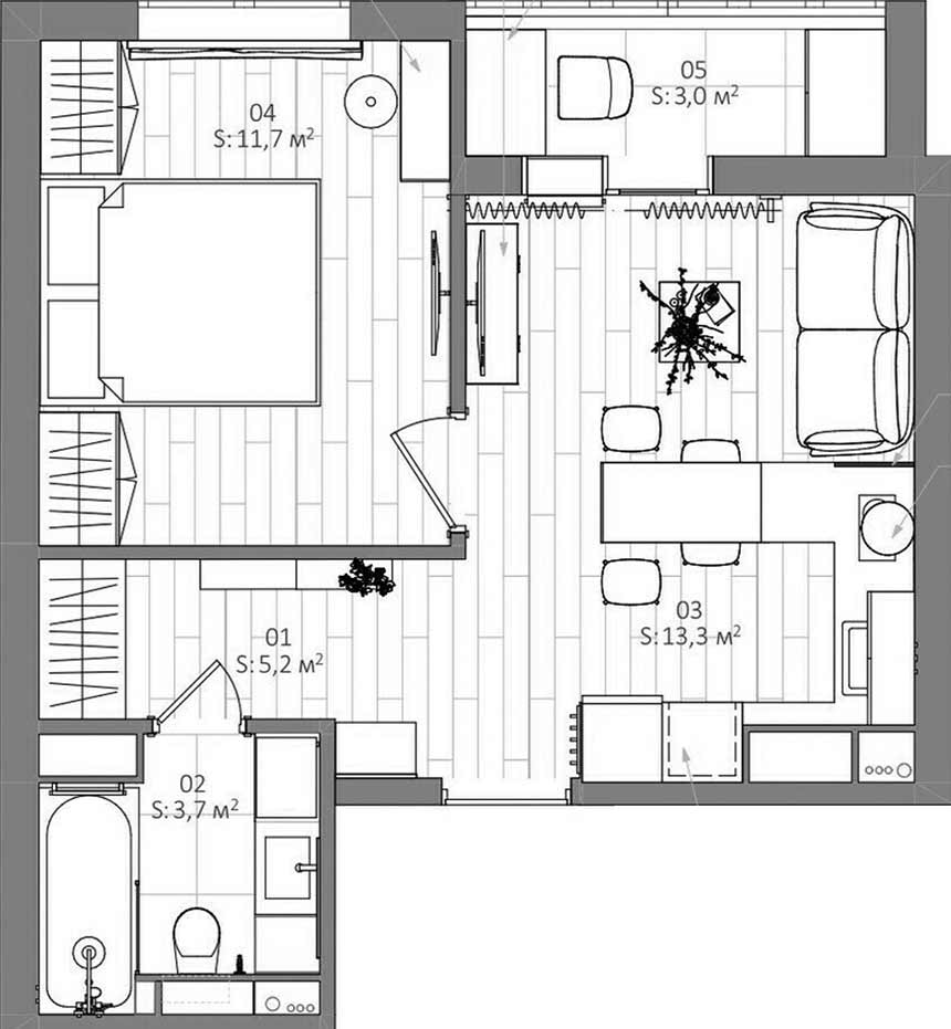 A lakás komfortjának növelése érdekében finomhangolták az alaprajzi elrendezést: a hálószoba bejáratát az előszobából a nappali irányába helyezték át. Ez a megoldás nemcsak a közlekedési útvonalakat ésszerűsítette, hanem finoman egyesítette is a különböző zónákat, miközben azok funkcionális szeparáltsága megmaradt.