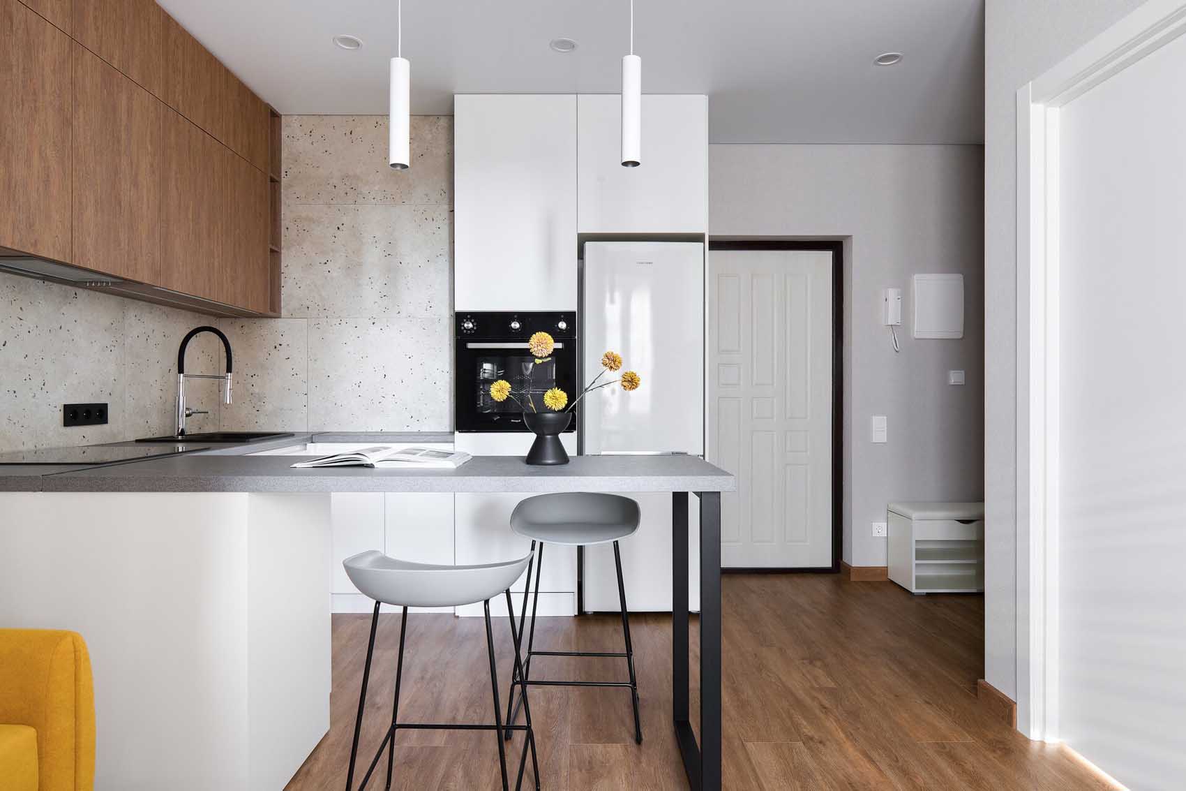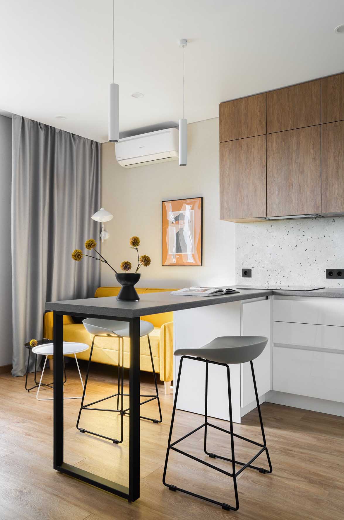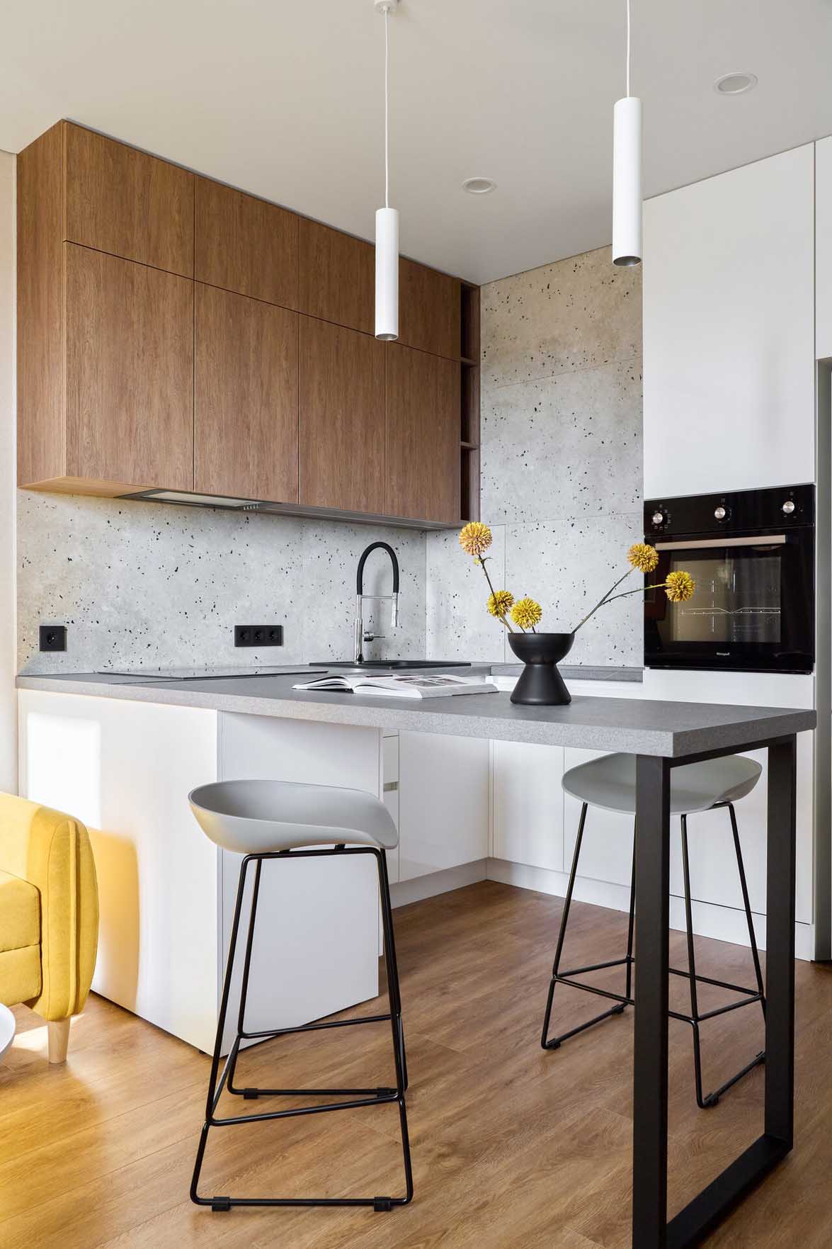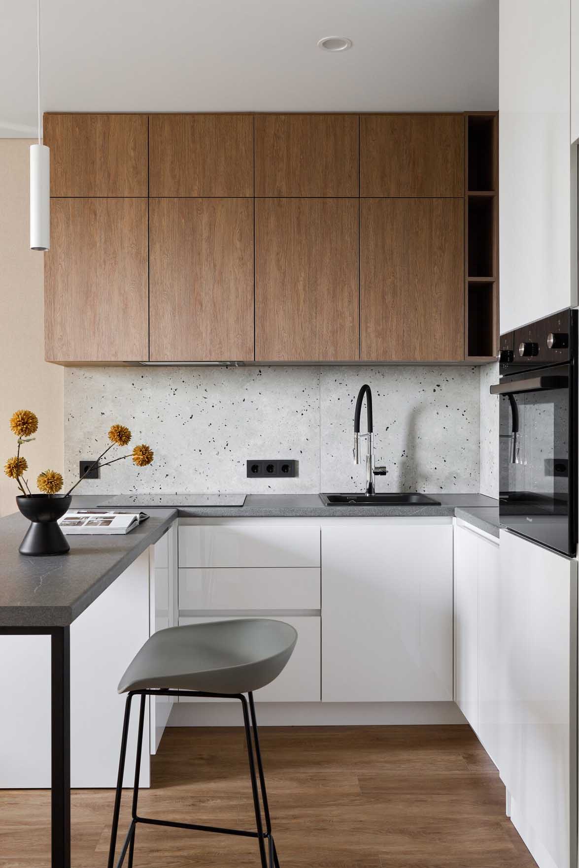 Az egyedi asztalosmunkával készült konyhabútor közvetlenül a helyiség bejáratánál kapott helyet, maximalizálva a térkihasználást. Az alsó szekrénysor egy könnyed kialakítású félszigetben végződik, amely kettős funkciót lát el: egyszerre szolgál kiegészítő munkafelületként és az étkezőasztalt kiváltó, kompakt étkezőpultként.