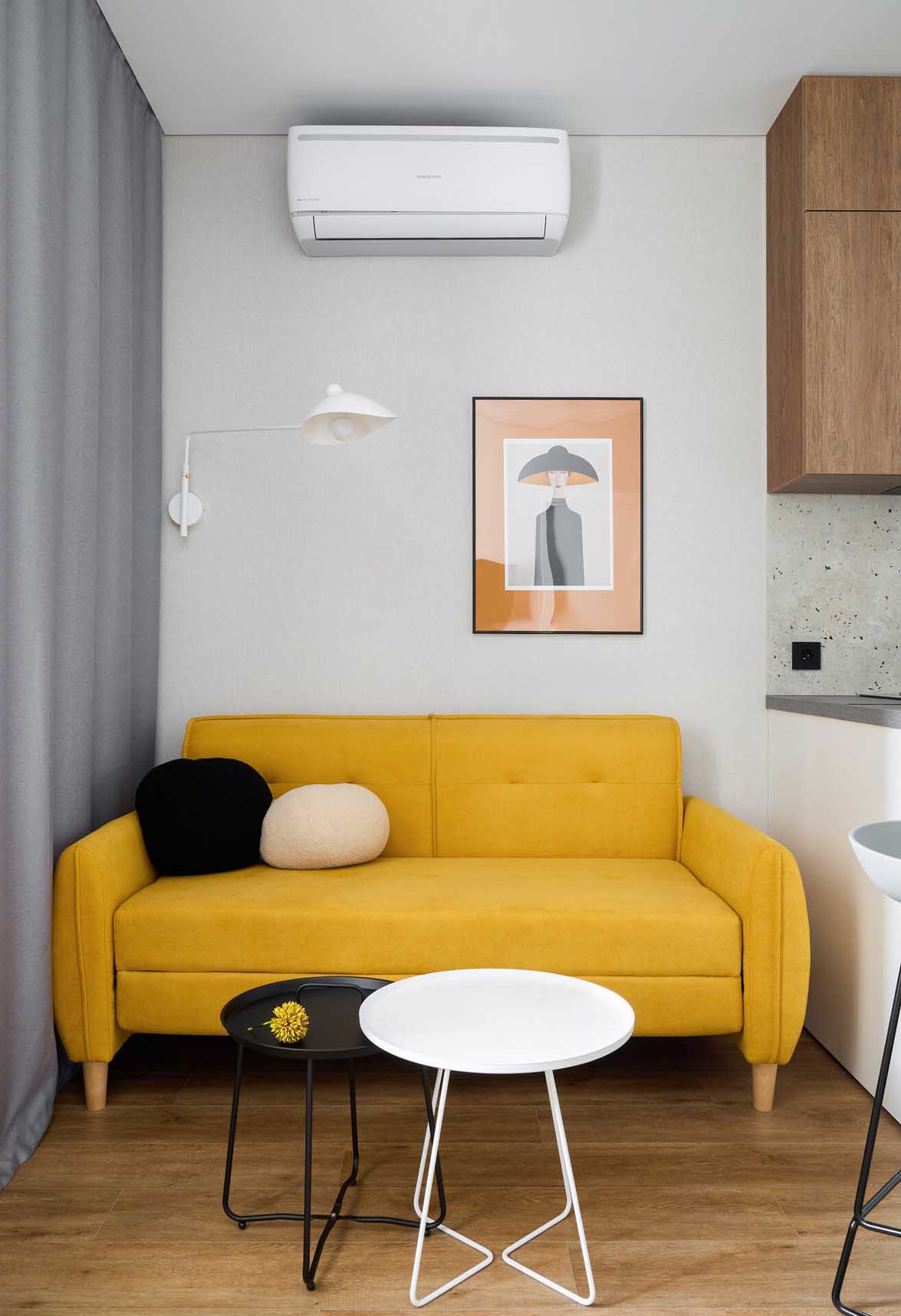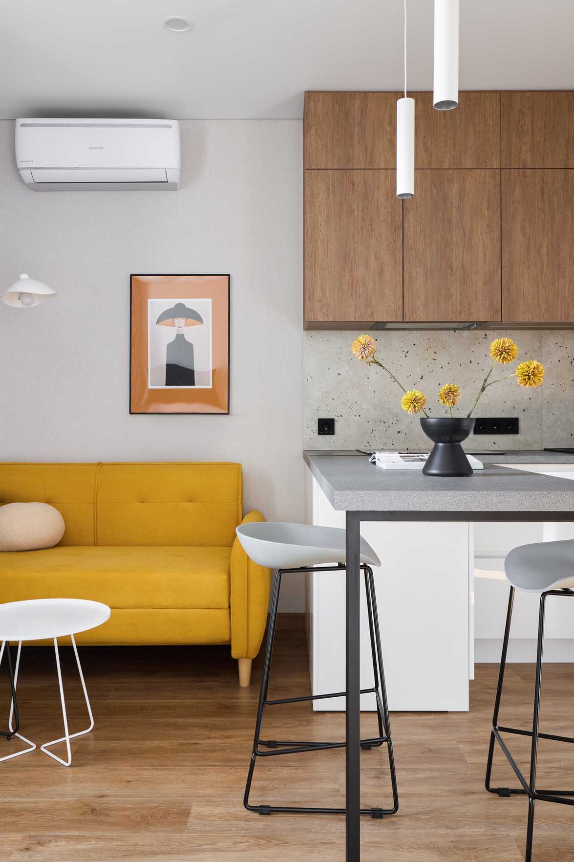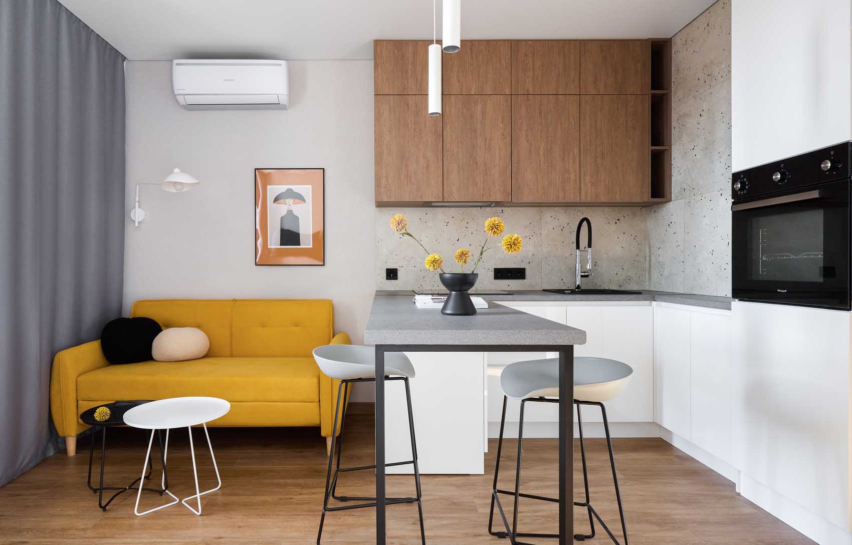 A kis lakásban a tervezői koncepció a maximális helykihasználásra és a vizuális tisztaságra helyezte a hangsúlyt. A projekt fókuszában egy fiatal házaspár igényeinek kielégítése állt. A tervezés elsődleges célja a rendelkezésre álló szűkös alapterület optimalizálása volt, egy szellős, zsúfoltságtól mentes enteriőr megteremtésével.