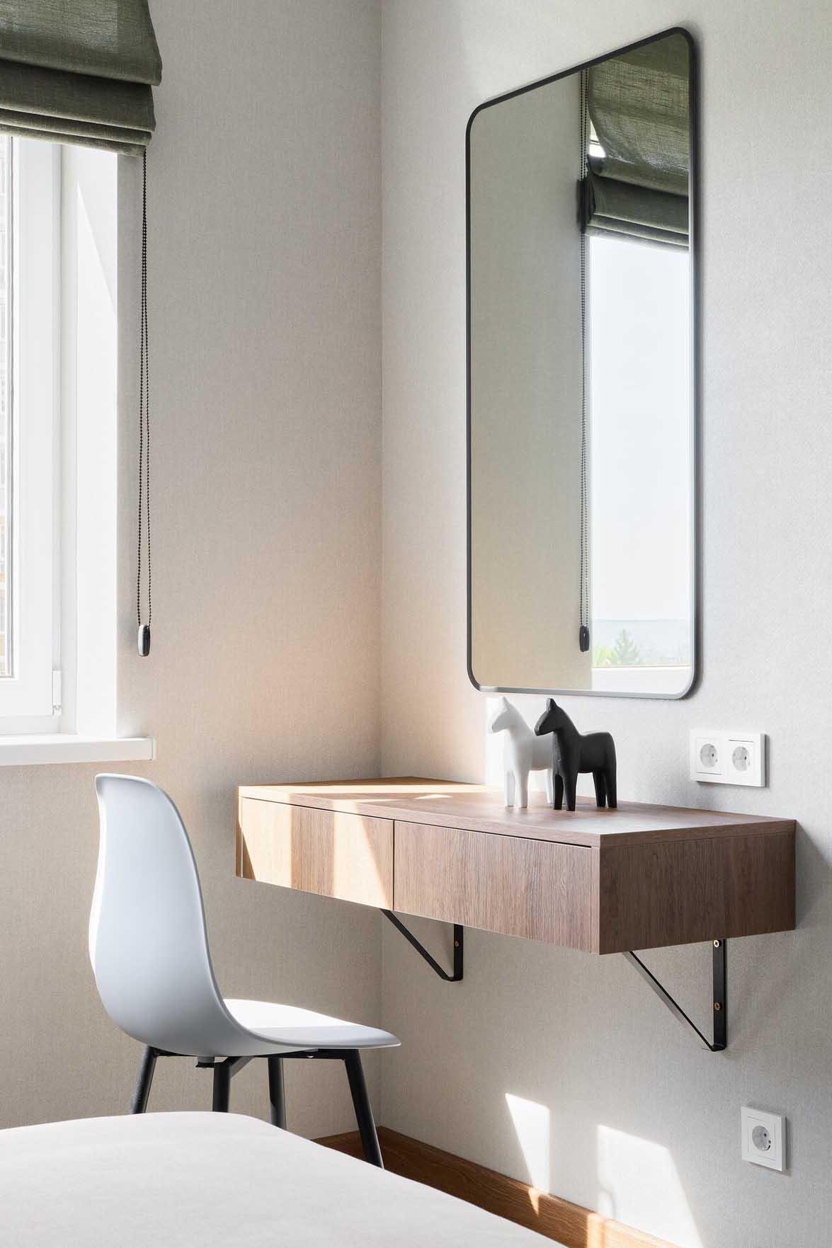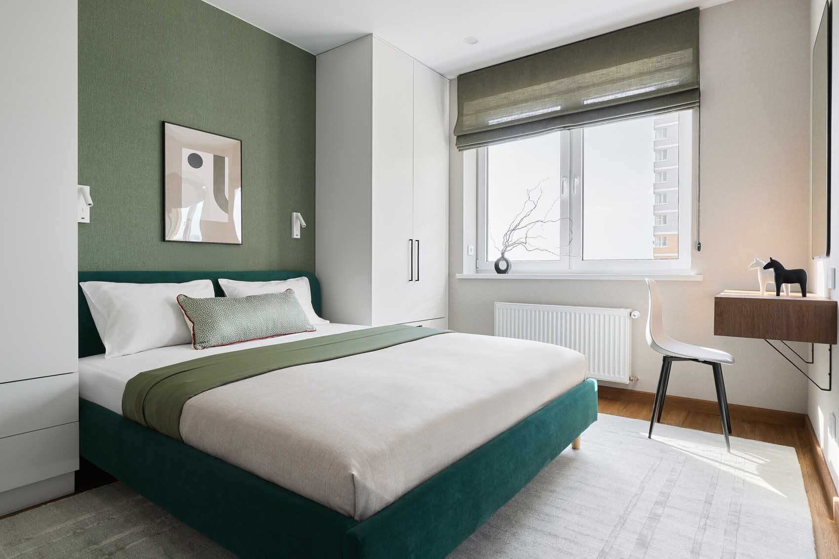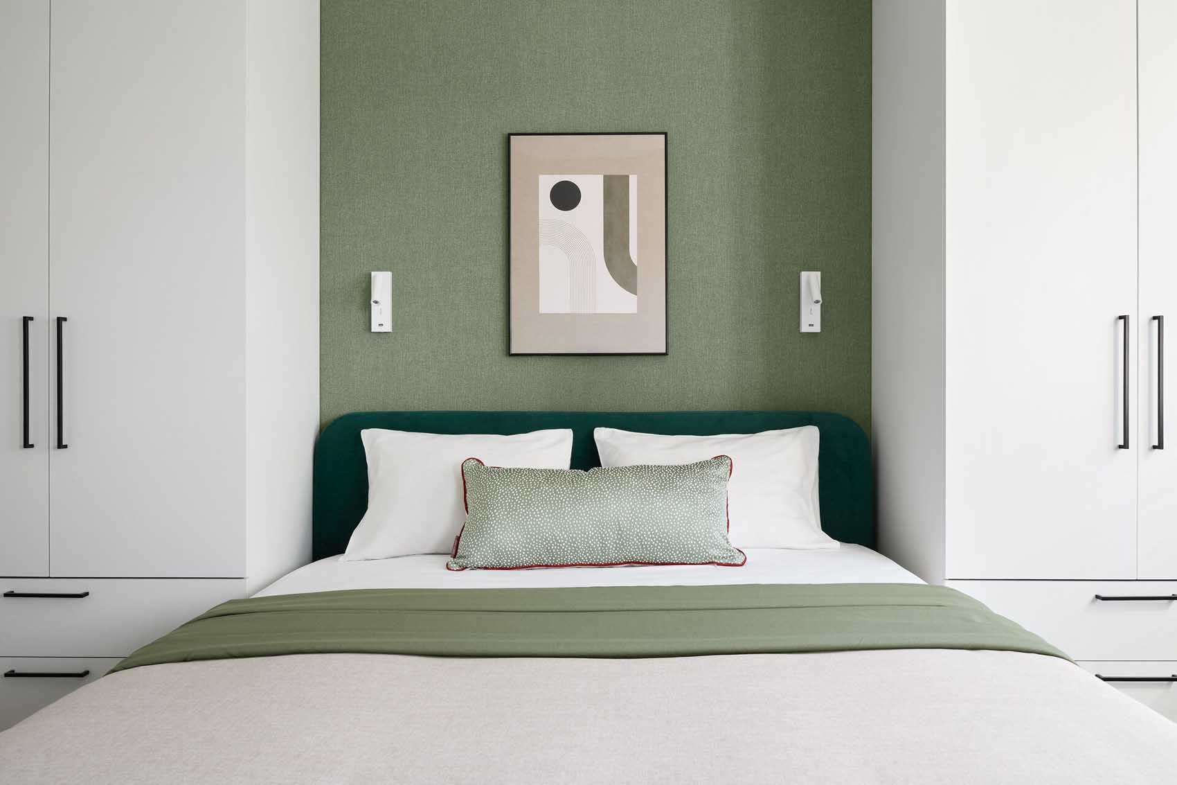 A hálószoba kialakításánál a tárolókapacitás maximalizálása volt a vezérelv. Az ágy fejtámlája mögötti falfelületet hangsúlyos dekorációval emelték ki, vizuálisan is kijelölve az alvás helyét. A tulajdonosi igényekre reagálva az ágy két oldalán magas gardróbszekrényeket építettek be, hídszerű elrendezést alkotva. Az ablakhoz közel elhelyezett, lebegő konzol multifunkcionális elemként szolgál: fésülködőasztalként vagy másodlagos munkahelyként is funkcionálhat.