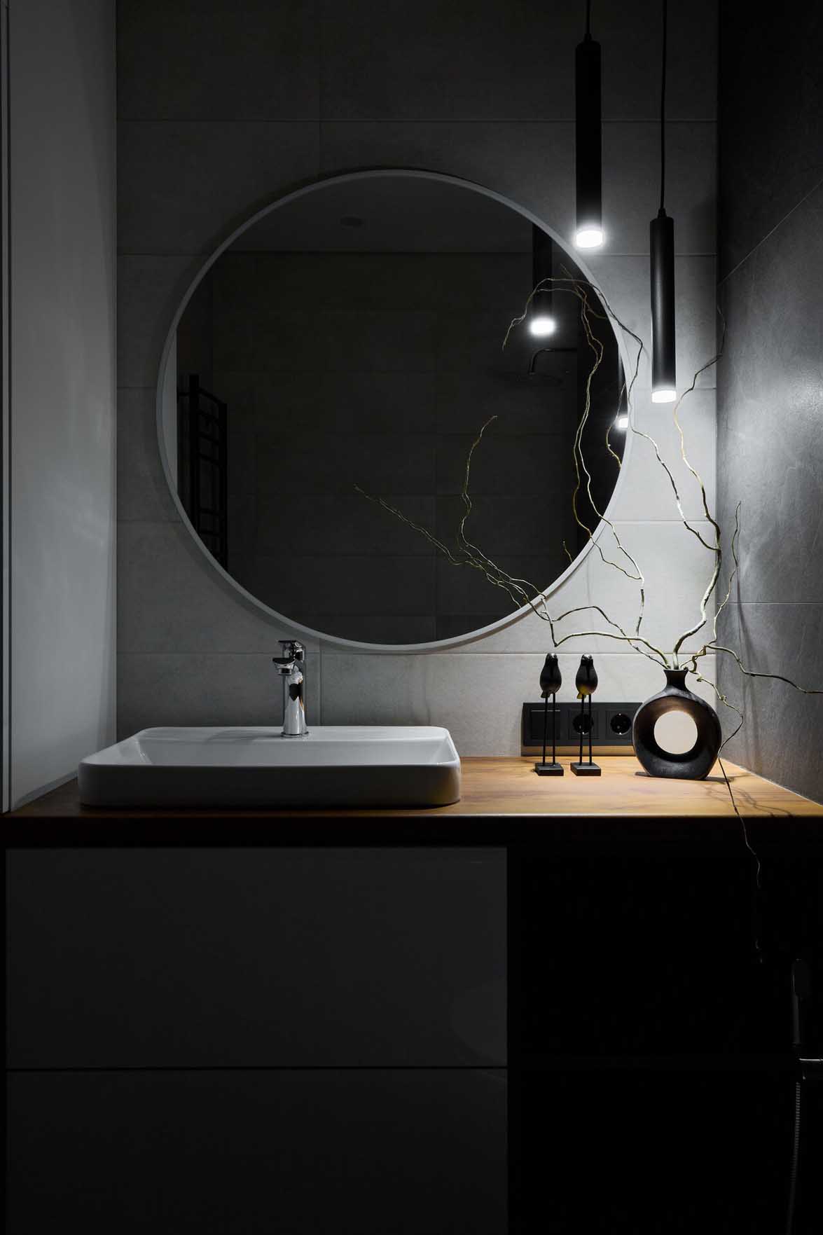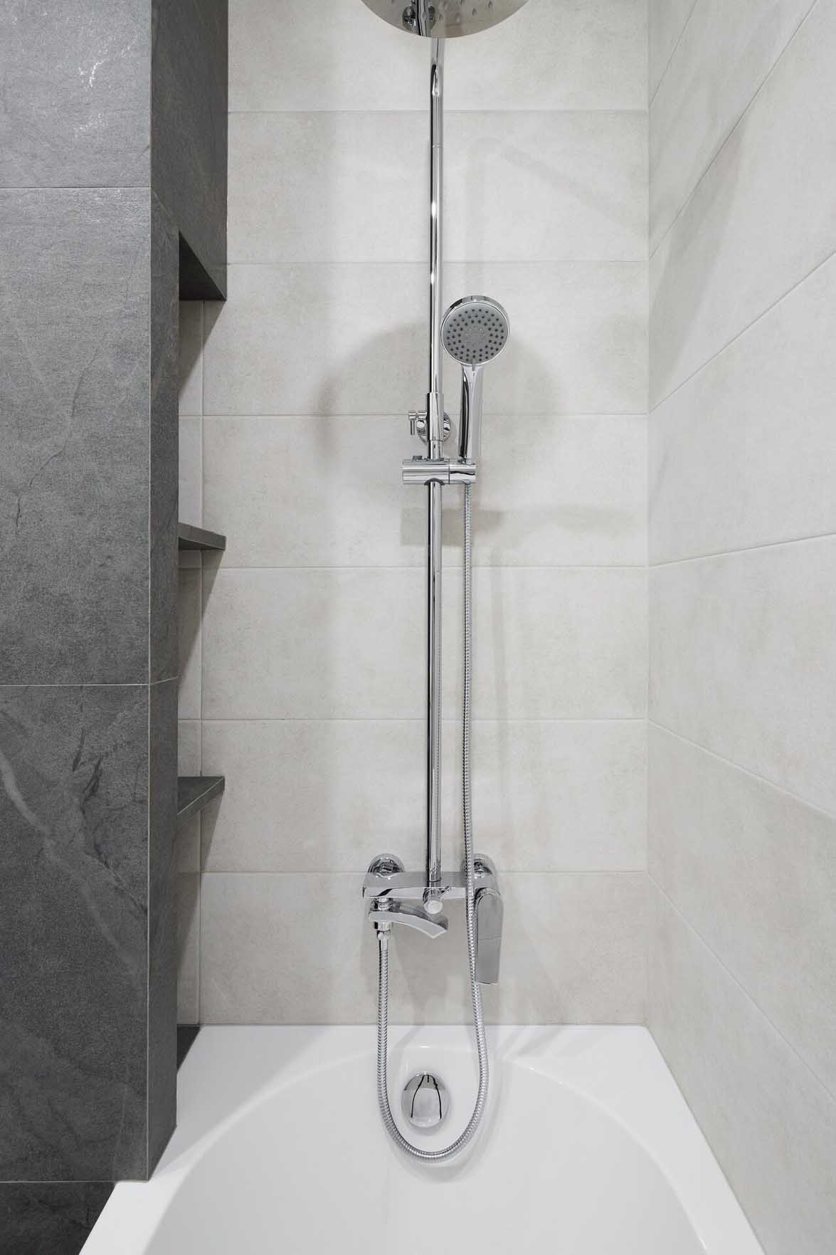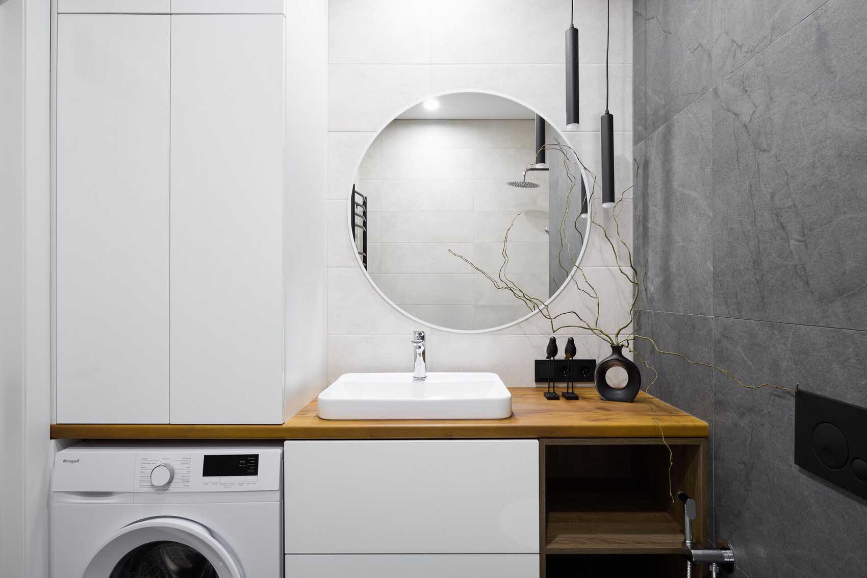 A fürdőszobában a falakat és a padlót kétféle árnyalatú greslappal burkolták, ami elegáns kontrasztot teremt. A gondos tervezésnek köszönhetően a kis alapterület ellenére minden alapvető funkció helyet kapott: egy teljes méretű kád, a falba épített WC-tartály, a mosógép, valamint a szükséges tárolóhelyek is. A kád oldalán kialakított süllyesztett falfülkék praktikus és esztétikus tárolási felületet biztosítanak a tisztálkodószerek számára.