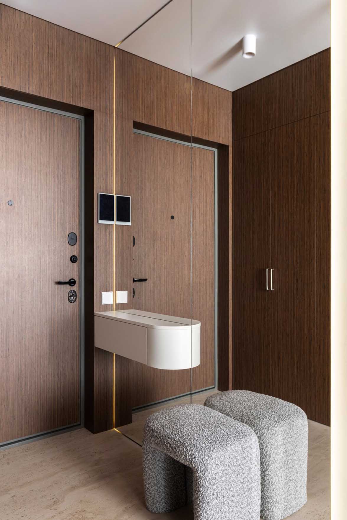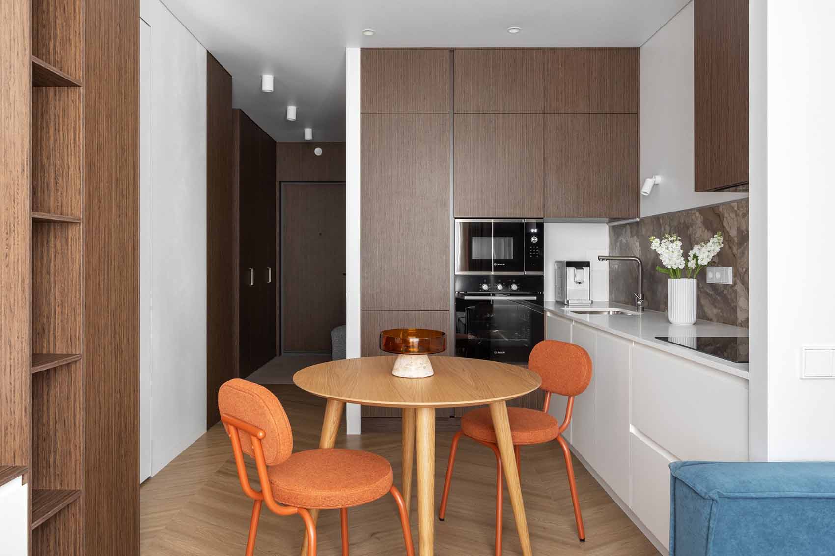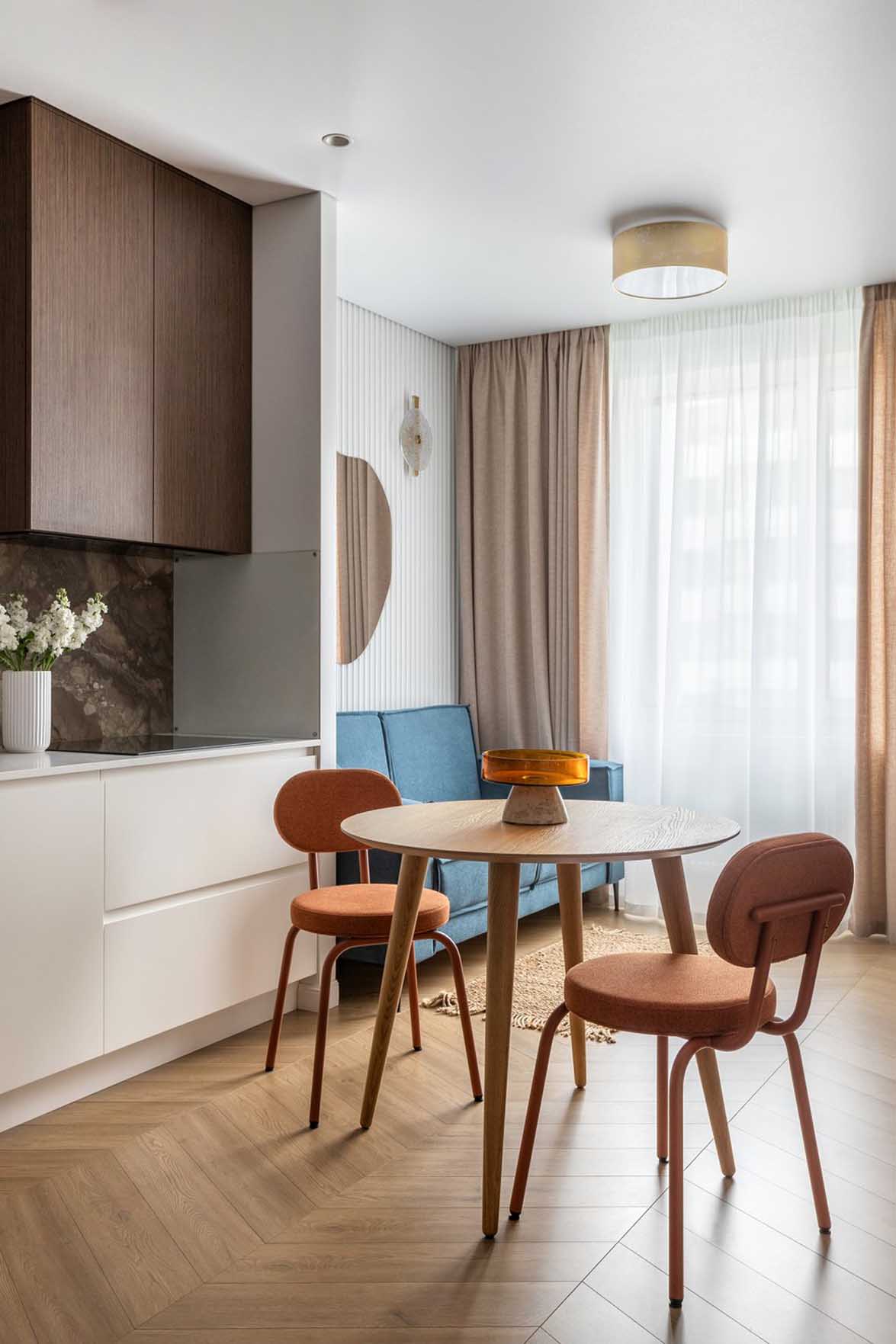 Ebben a lakásban egy fiatal pár alakította ki első közös otthonát. Az ingatlan különlegessége az elhelyezkedése: bár egy modern társasházban található, az erdő közvetlen közelsége a városi kényelmet a vidéki házak nyugalmával és zöld kilátásával ötvözi. A terek tervezésekor a „reggeli fények” hangulata szolgált inspirációként. A púderes árnyalatok lágyak, a fa textúrája melegséget áraszt, míg az élénkebb színfoltok élettel töltik meg a teret. Az eredmény egy modern, skandináv jegyeket hordozó, egyedi megoldásokkal gazdagított enteriőr lett.