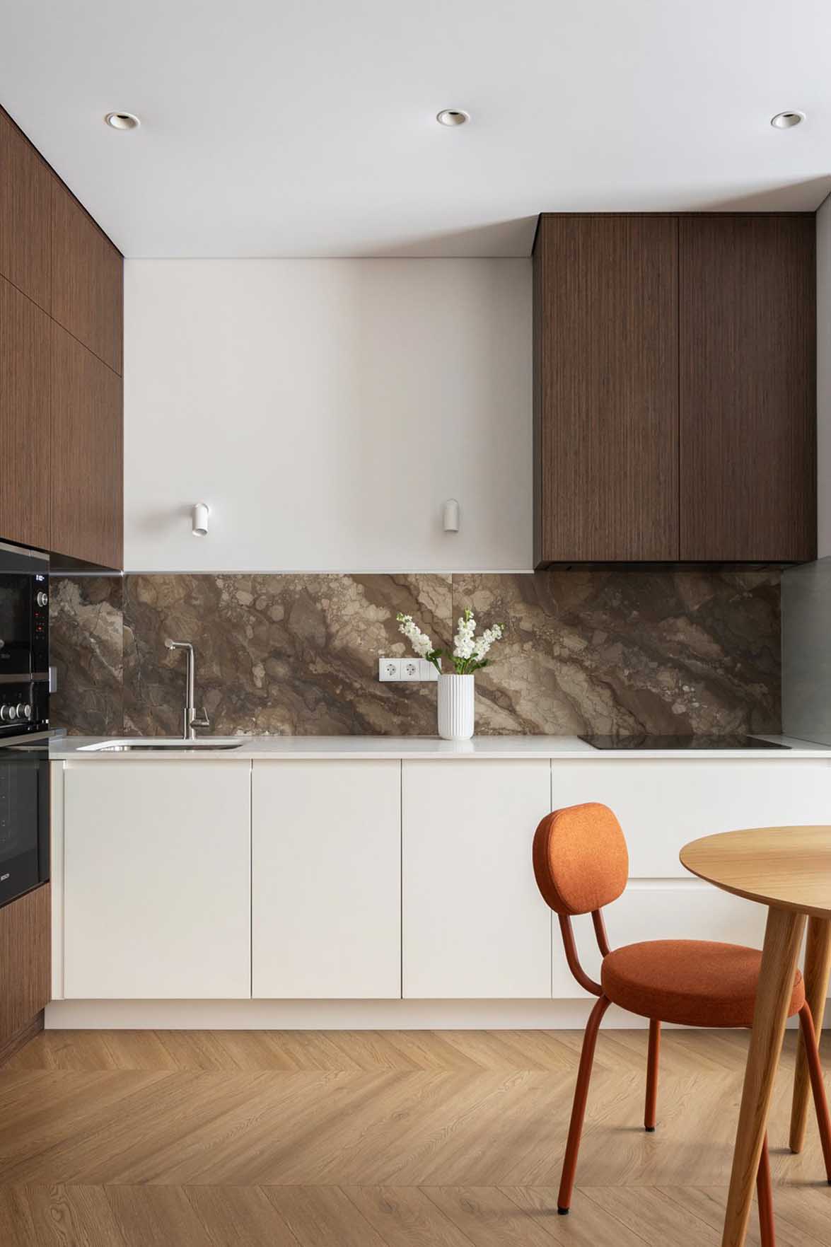Az L-alakú konyhabútor egyedi gyártású, munkalapja tartós kvarc kompozitból készült. A konyha hátfalhoz nagyméretű, 120×60 cm-es, természetes kőmintázatú greslapokat használtak. A tárolási kapacitást az egyik falon elhelyezett beépített toronyszekrények maximalizálják, míg a merőleges falfelületre – a szellős érzet megőrzése érdekében – csupán egyetlen felsőszekrény került.