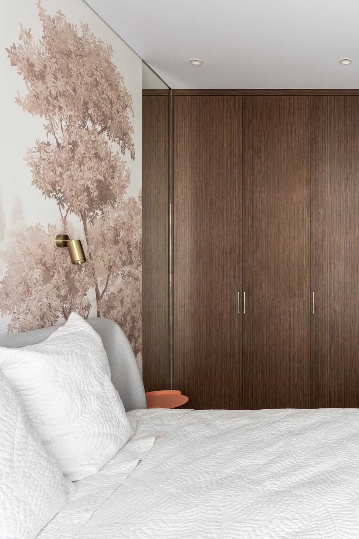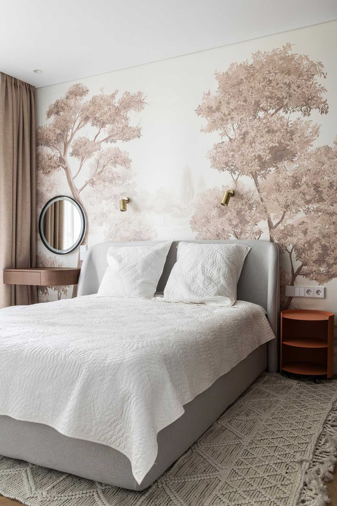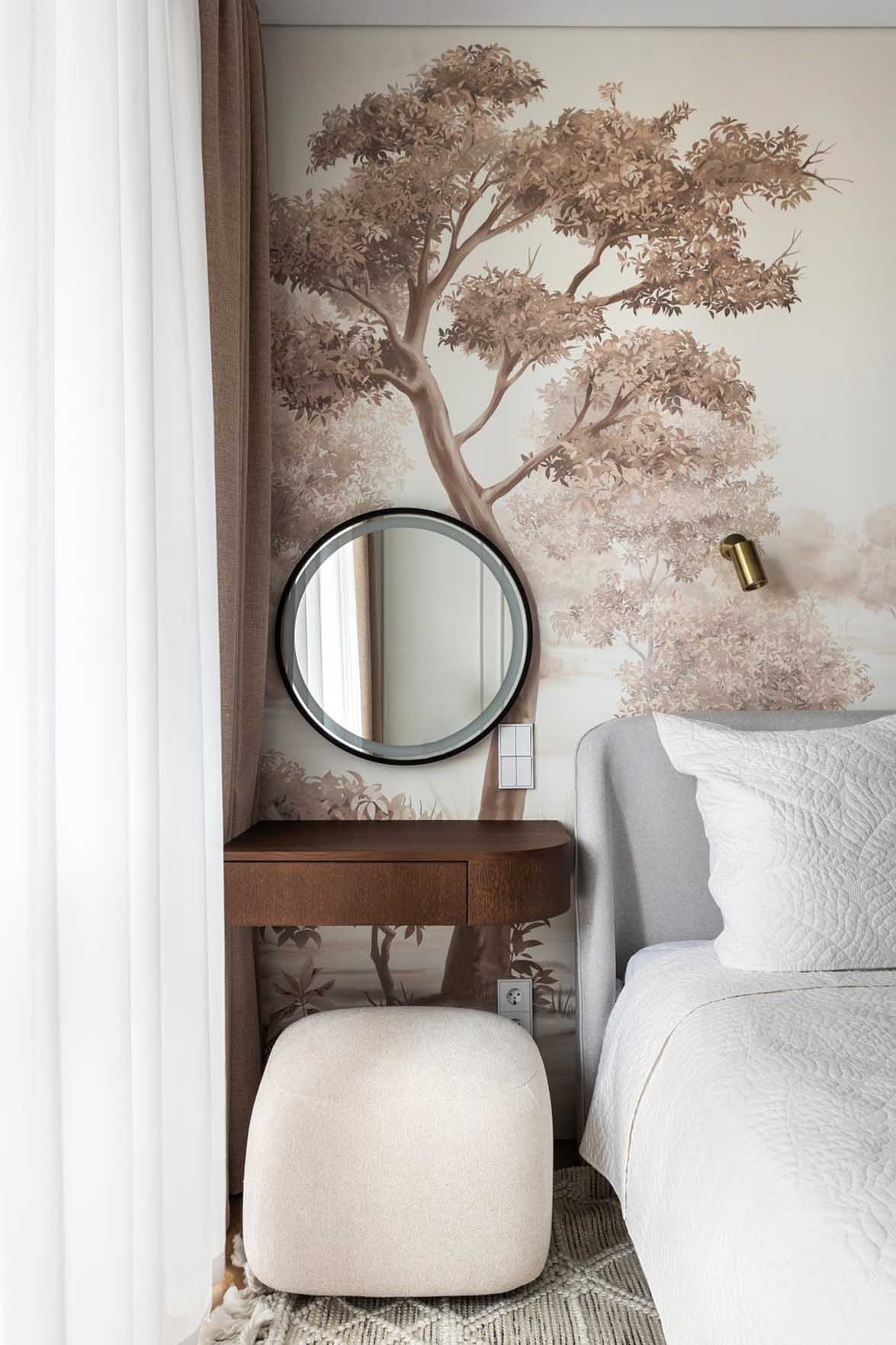 A hálószoba legmeghatározóbb eleme a fejtámla mögötti falat díszítő, erdőt ábrázoló fotótapéta, amely érzelmi töltetet ad a helyiségnek és visszautal a lakás természeti környezetére. A szoba bejáratánál egy méretes gardróbszekrény kapott helyet, az ágy mellett pedig egy kecses fésülködőasztal segíti a reggeli rutint. A terrakotta éjjeliszekrény és az elegáns falikarok finom hangsúlyokat adnak az enteriőrnek. A televízió körüli falfelületet rugalmas díszlécekkel keretezték, hogy lágyítsák a képernyő grafikus megjelenését és harmonikusan illesszék azt a dekorációba.