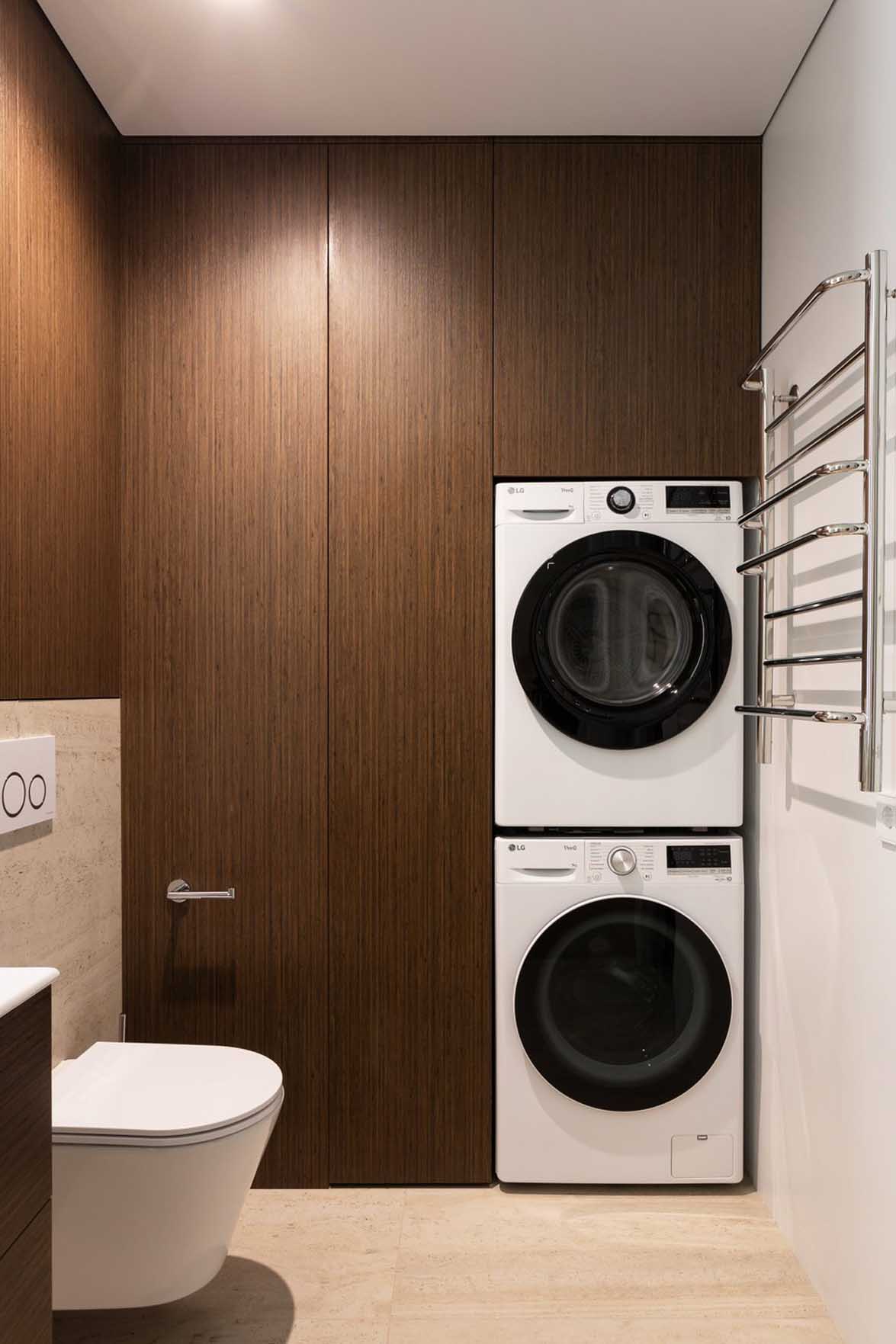 A bővítésnek köszönhetően a fürdőszoba nemcsak tágasabb lett, de egy külön mosókonyha-oszlopot is befogadott, amelyben a mosógép és a szárítógép mellett a szennyesruha-tároló is helyet kapott. Az esztétikát a travertin mintás greslapok és a meleg tónusú, selyemfényű frontok kombinációja határozza meg. A tartósság és a könnyű tisztíthatóság érdekében a burkolatokat epoxi fugával látták el, ami modern és precíz megjelenést kölcsönöz a vizesblokknak.