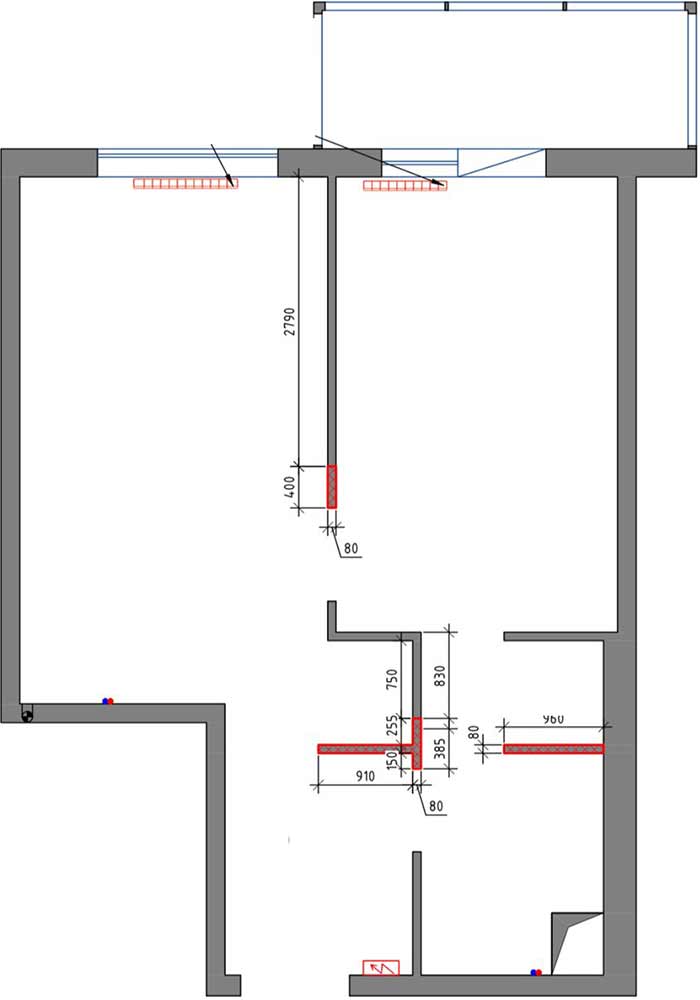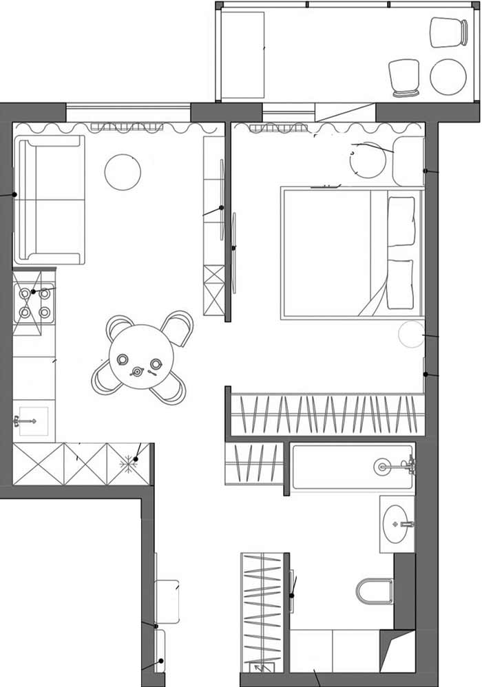 A lakás alaprajza a modern építésű ingatlanokra jellemző elrendezést követte: amerikai konyhás nappali és egy külön hálószoba. A tervezők a funkcionalitás növelése érdekében kisebb szerkezeti módosításokat végeztek. Az előszobát szabályosabb alakúra formálták, a hálószoba bejáratát pedig eltolták, hogy az egyik falfelület teljes hosszában beépíthető legyen tárolókkal. A legjelentősebb változtatás a fürdőszobát érintette, amelyet a hálószobai gardrób rovására bővítettek ki, így helyet szorítva a háztartási funkcióknak.