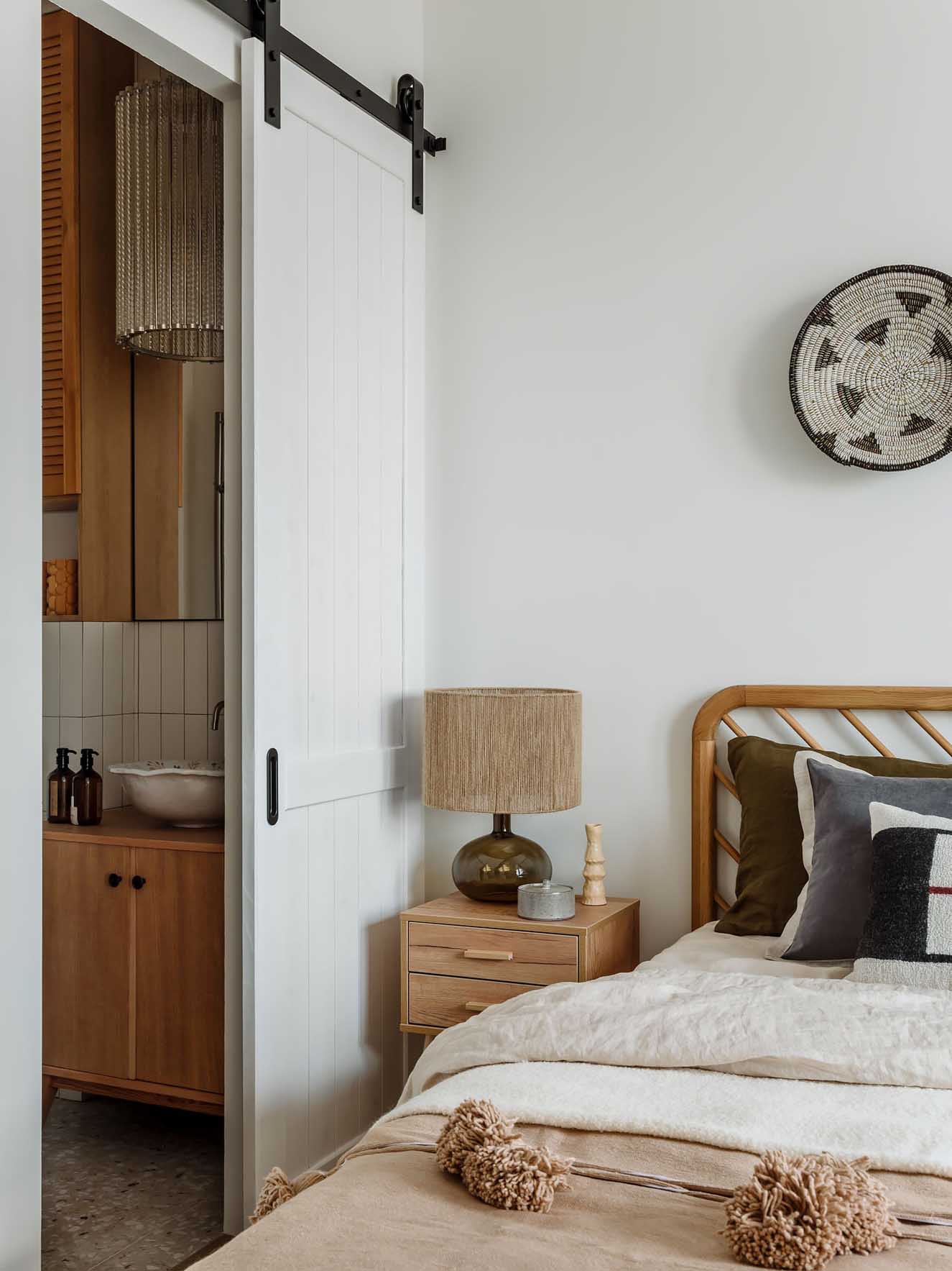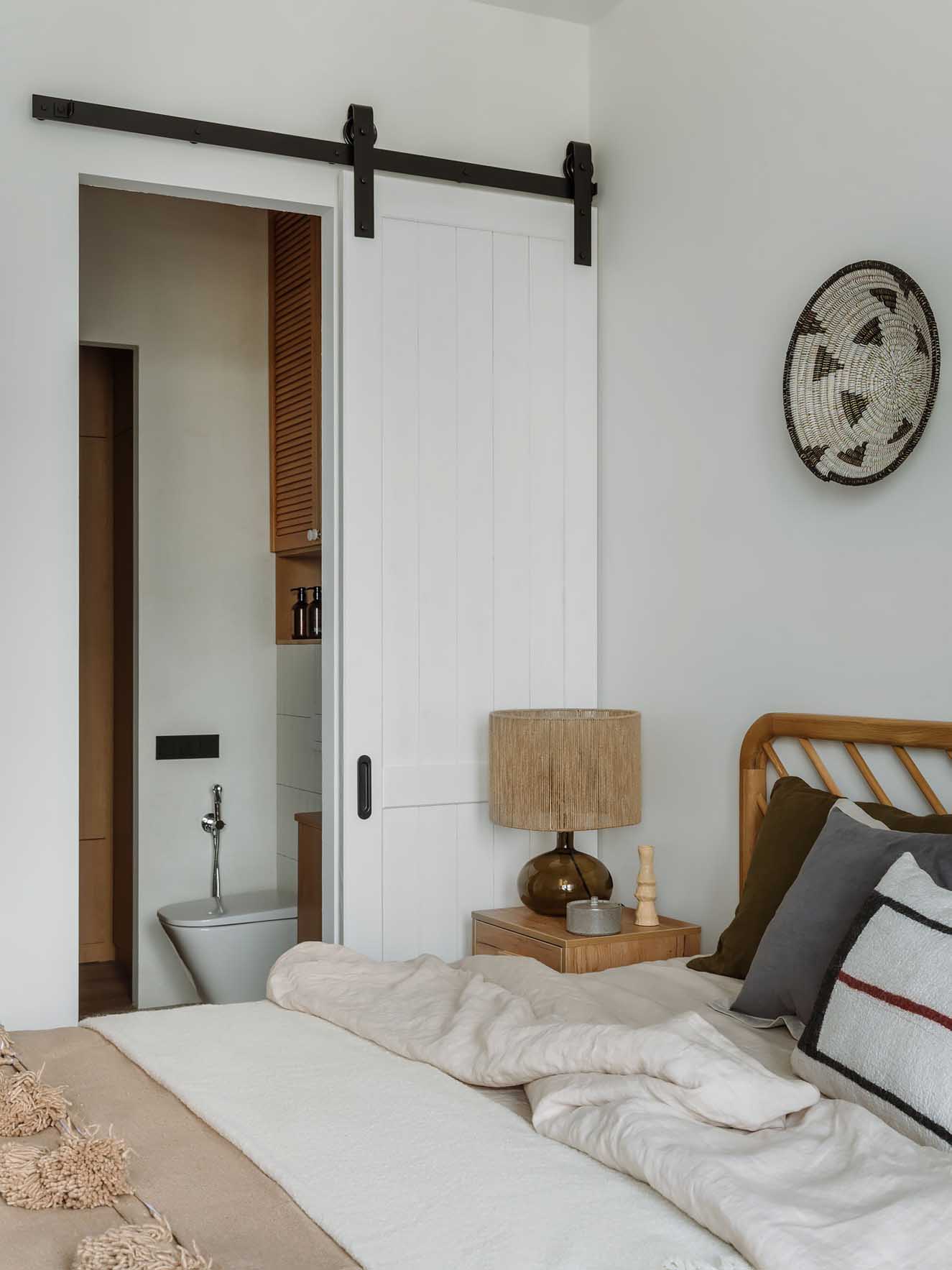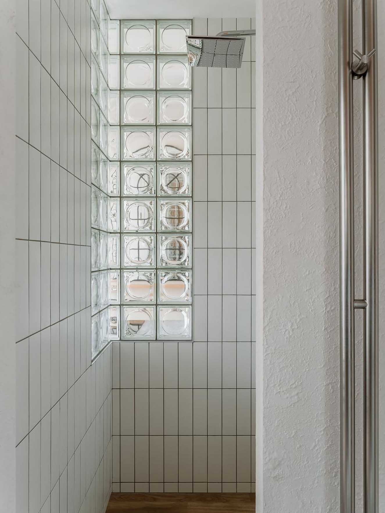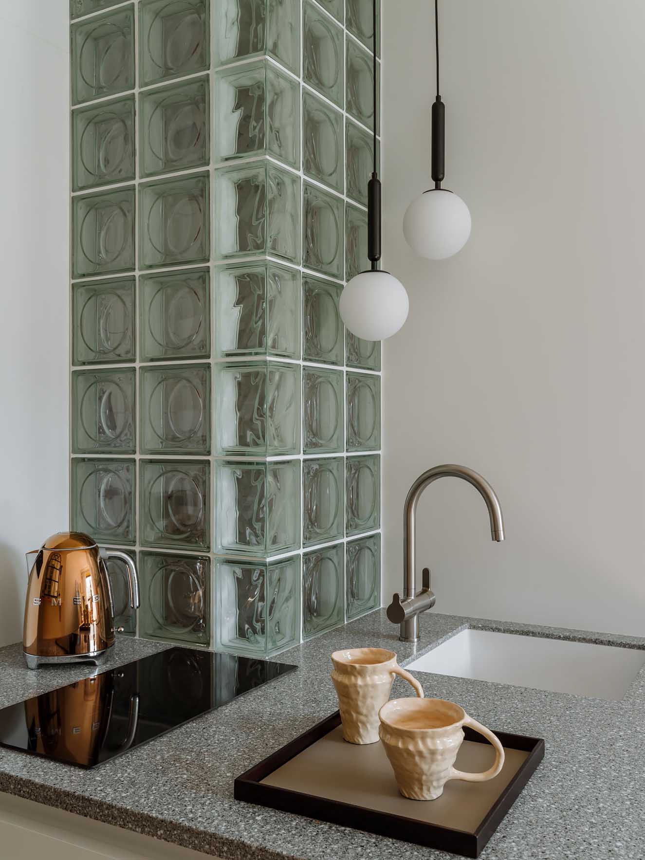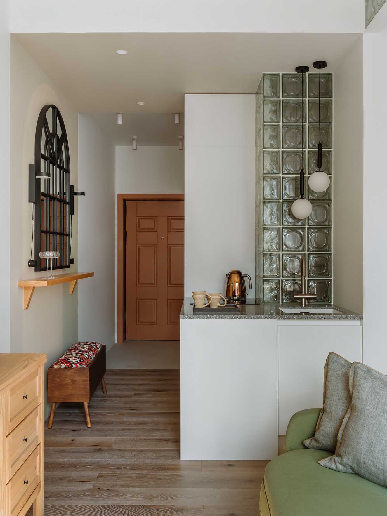 A térszervezés központi eleme a vizesblokk tömbje lett. A fürdő és a szoba között a fényáteresztő, részben üvegtéglából készült válaszfal és a tolóajtók segítettek vizuálisan nyitottabbá tenni a különböző funkcionális zónákat, az enteriőr egységét hangsúlyozva. A kompakt alapterület ellenére, a bőséges természetes fénynek és a kényelmes közlekedő tereknek köszönhetően a lakásban megmaradt a légiesség érzete.