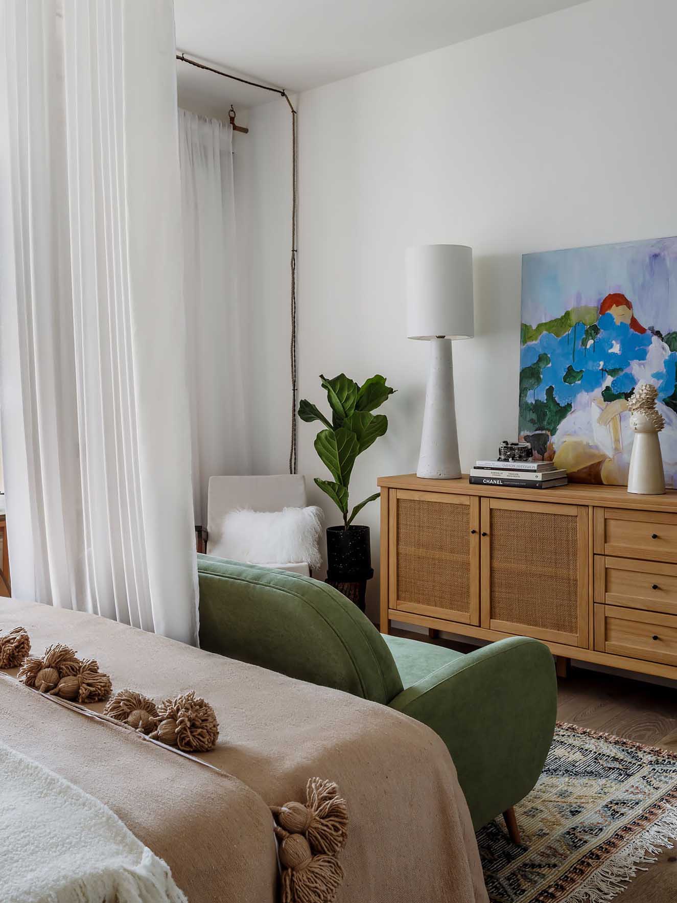 A lakótér egyúttal univerzális háttérként is szolgál az otthoni ruhapróbák és fotózások számára, ezért a tervező több tükröt is elhelyezett a térben. A karakteres tárgyak sokaságának köszönhetően sikerült olyan atmoszférát teremteni, amelyben összefonódik a nosztalgia és az otthonos kényelem. Az éjjeliszekrényen álló asztali lámpa palackzöld üvegéhez a lámpaernyőt a tervezőcsapat egyik munkatársa fonta kézzel. A kompozíciót egy kortárs festőművész alkotása teszi teljessé.