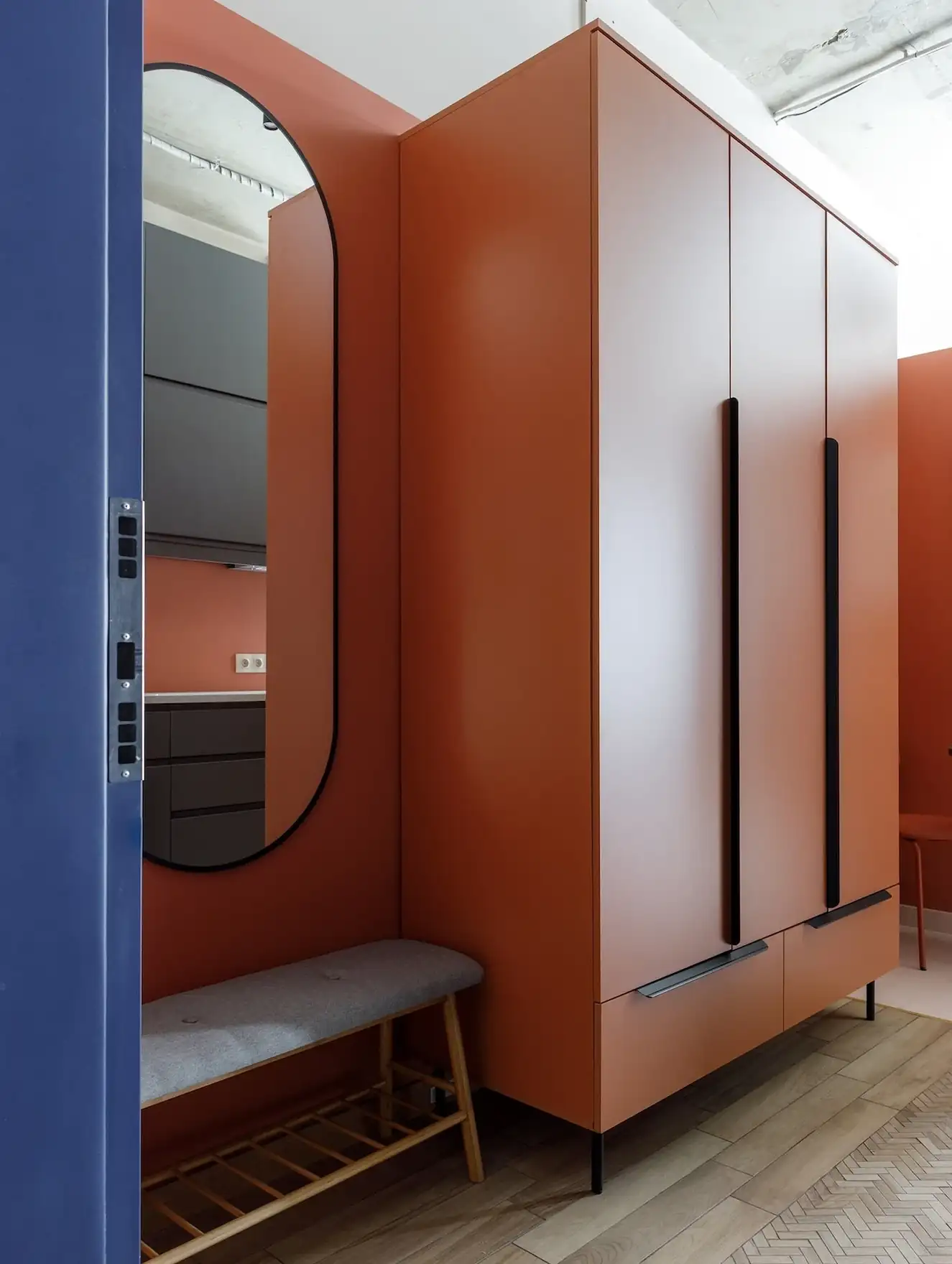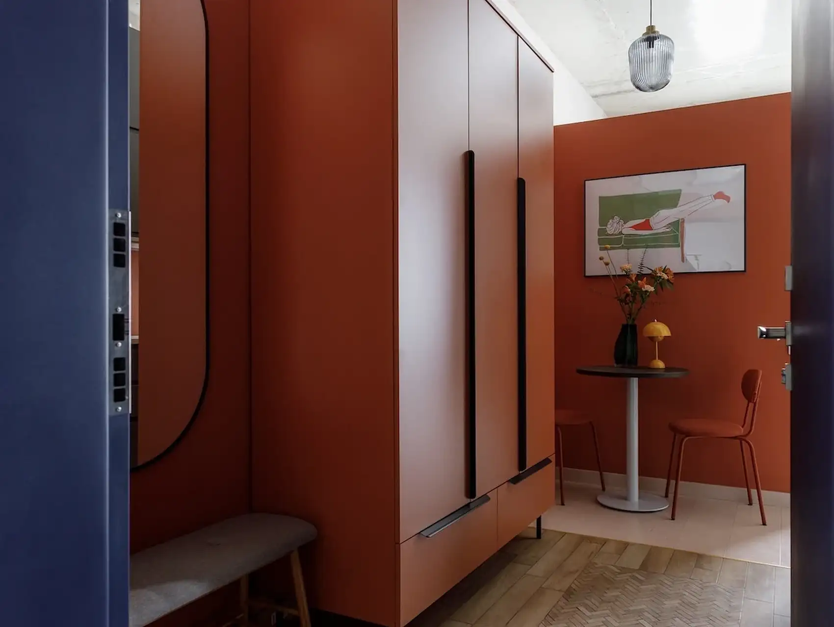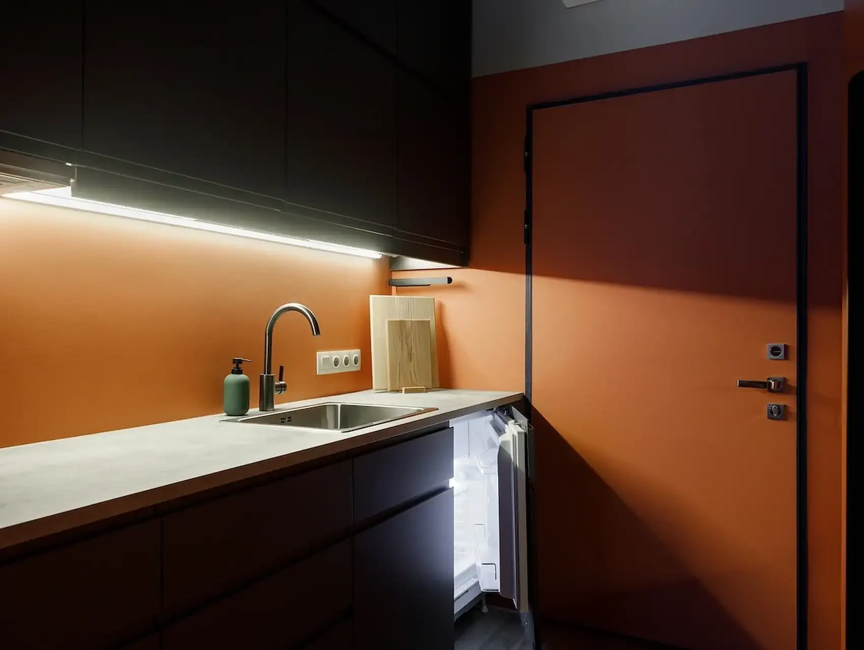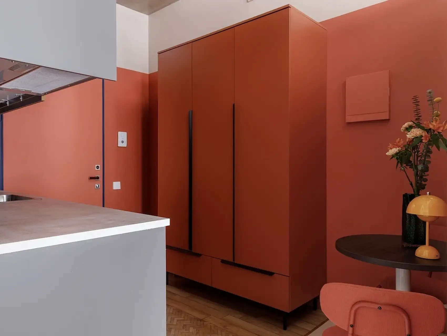 Ahogy belépünk a lakásba, rögtön egy meleg, élénk terrakotta színű zóna fogad minket. Közvetlenül a bejáratnál egy praktikus, tükörrel kombinált puff kapott helyet a cipőhúzáshoz. Ebben a terrakotta térben kapott helyet a konyha, amelyet előre gyártott, modern bútorelemekből állítottak össze. A tervezők ügyeltek arra, hogy minden millimétert kihasználjanak: az alsó szekrénybe egy kisméretű hűtőszekrényt építettek be, a mosogató alatt pedig egy apró mosogatógép is elfért – ami egy diák számára igazi megváltás a vizsgaidőszakban. A helytakarékosság jegyében a hagyományos tűzhelyet elvetették, helyette egy kisméretű, hordozható főzőlapot használnak.