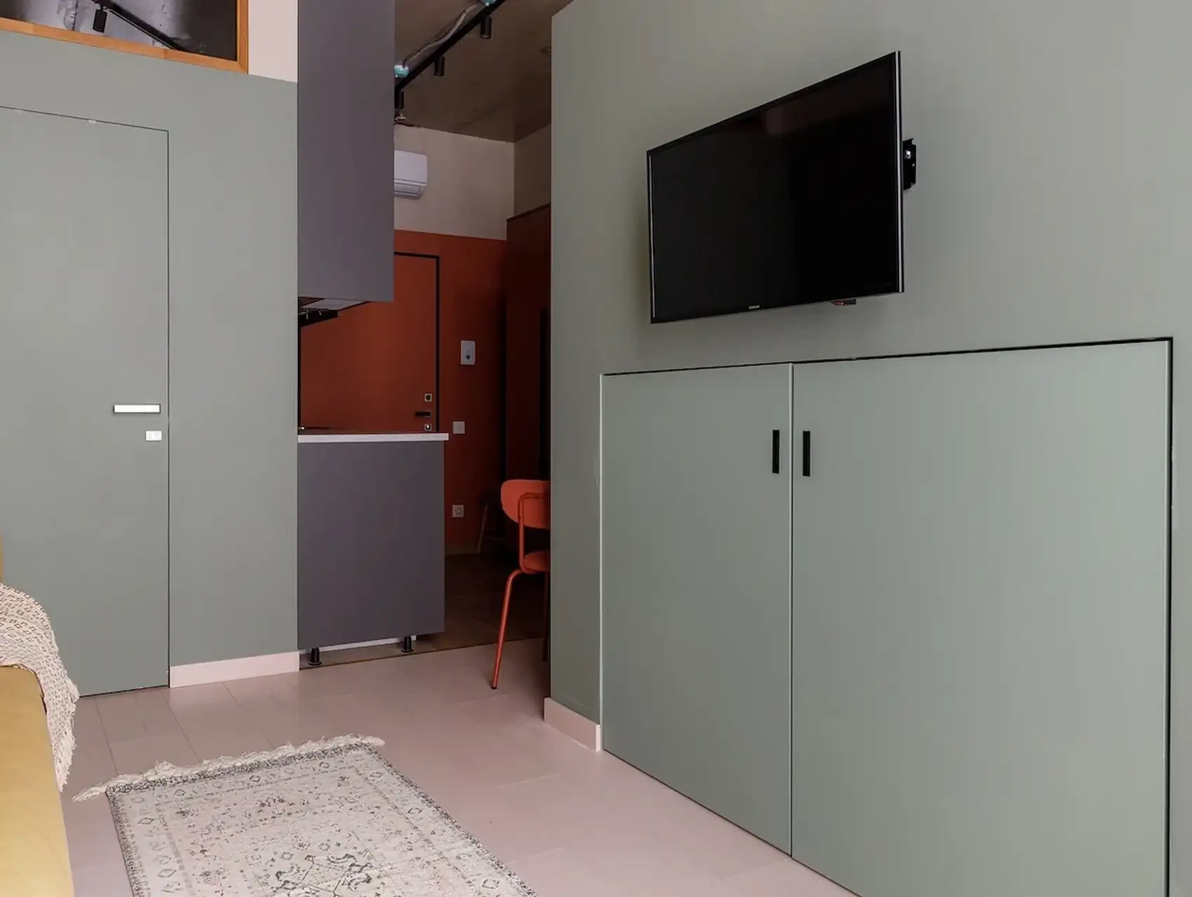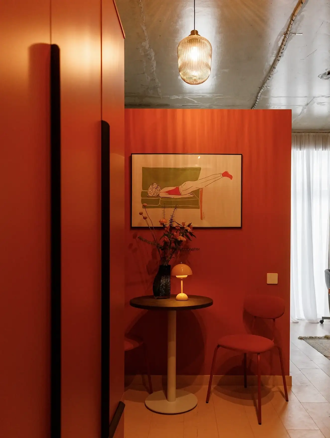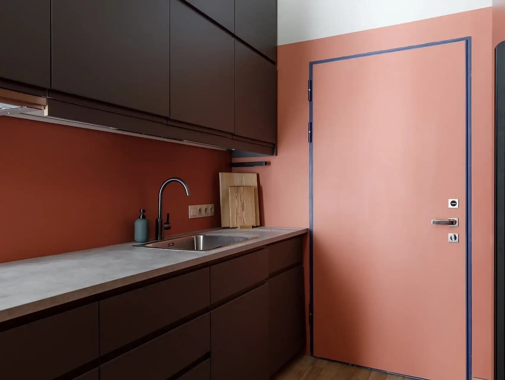 Ahogy belépünk a lakásba, rögtön egy meleg, élénk terrakotta színű zóna fogad minket. Közvetlenül a bejáratnál egy praktikus, tükörrel kombinált puff kapott helyet a cipőhúzáshoz. Ebben a terrakotta térben kapott helyet a konyha, amelyet előre gyártott, modern bútorelemekből állítottak össze. A tervezők ügyeltek arra, hogy minden millimétert kihasználjanak: az alsó szekrénybe egy kisméretű hűtőszekrényt építettek be, a mosogató alatt pedig egy apró mosogatógép is elfért – ami egy diák számára igazi megváltás a vizsgaidőszakban. A helytakarékosság jegyében a hagyományos tűzhelyet elvetették, helyette egy kisméretű, hordozható főzőlapot használnak.