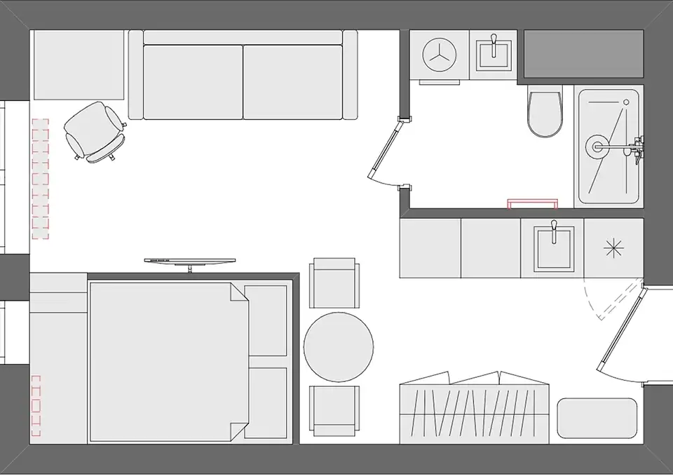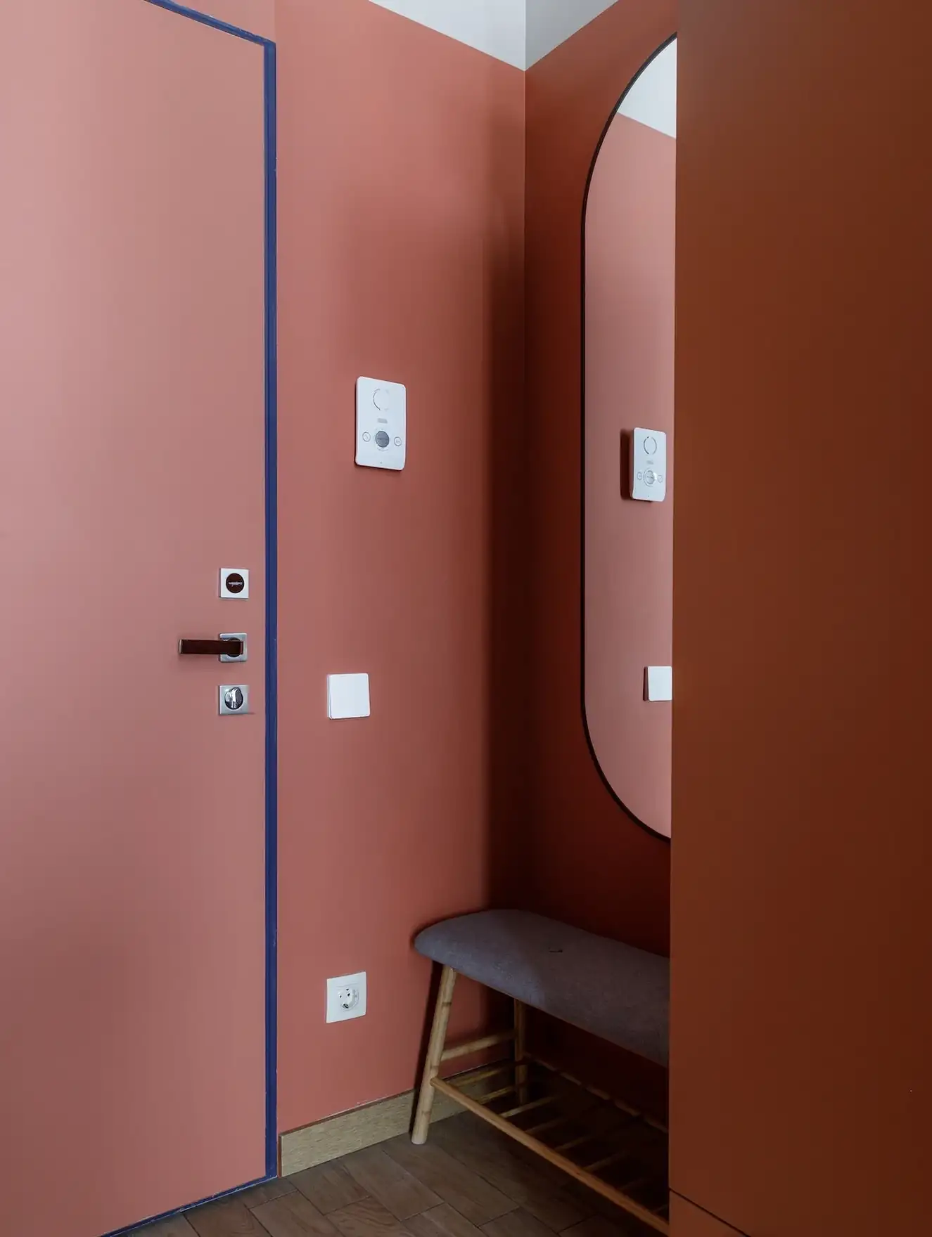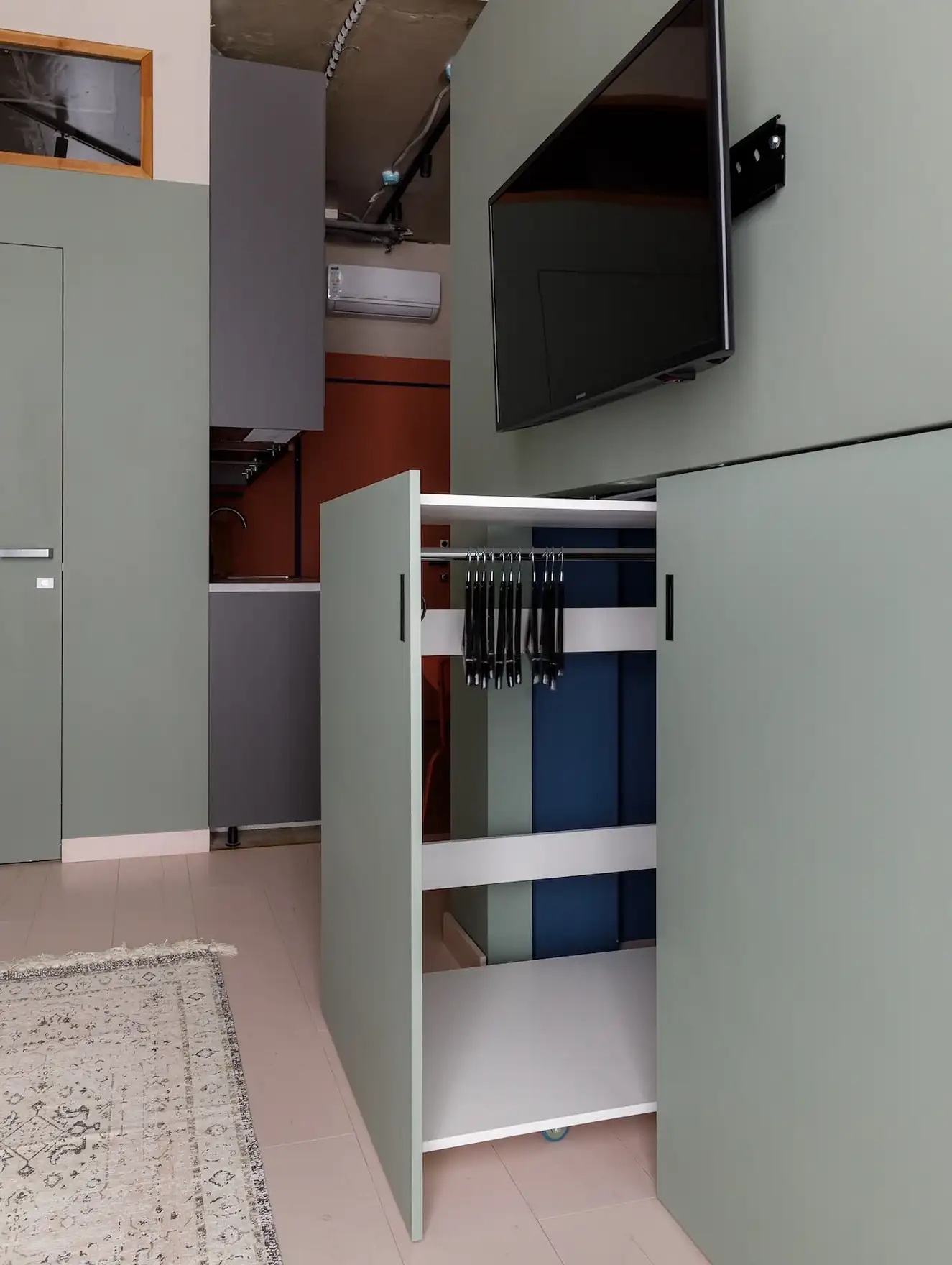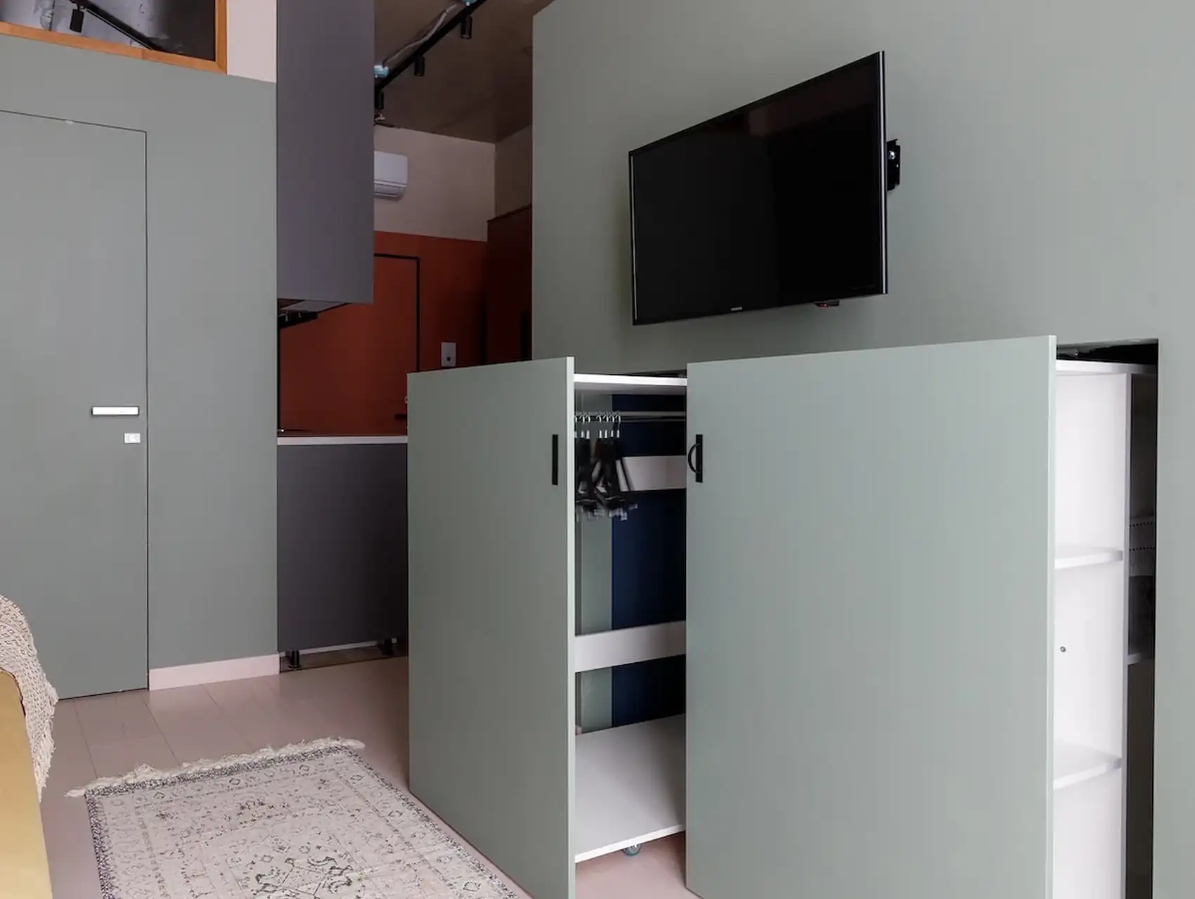 Ahogy belépünk a lakásba, rögtön egy meleg, élénk terrakotta színű zóna fogad minket. Közvetlenül a bejáratnál egy praktikus, tükörrel kombinált puff kapott helyet a cipőhúzáshoz. Ebben a terrakotta térben kapott helyet a konyha, amelyet előre gyártott, modern bútorelemekből állítottak össze. A tervezők ügyeltek arra, hogy minden millimétert kihasználjanak: az alsó szekrénybe egy kisméretű hűtőszekrényt építettek be, a mosogató alatt pedig egy apró mosogatógép is elfért – ami egy diák számára igazi megváltás a vizsgaidőszakban. A helytakarékosság jegyében a hagyományos tűzhelyet elvetették, helyette egy kisméretű, hordozható főzőlapot használnak.