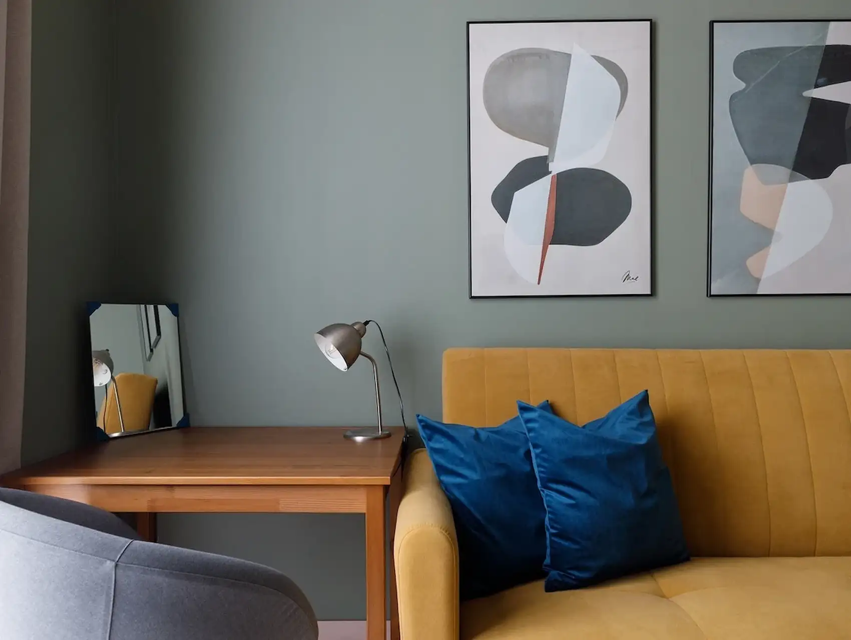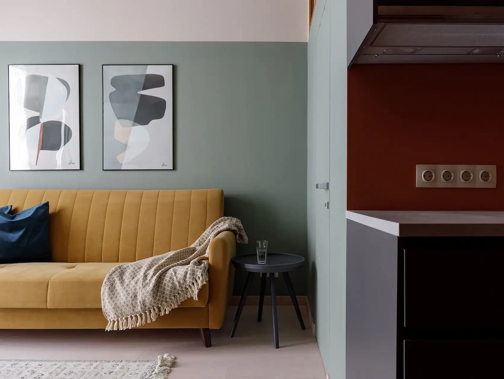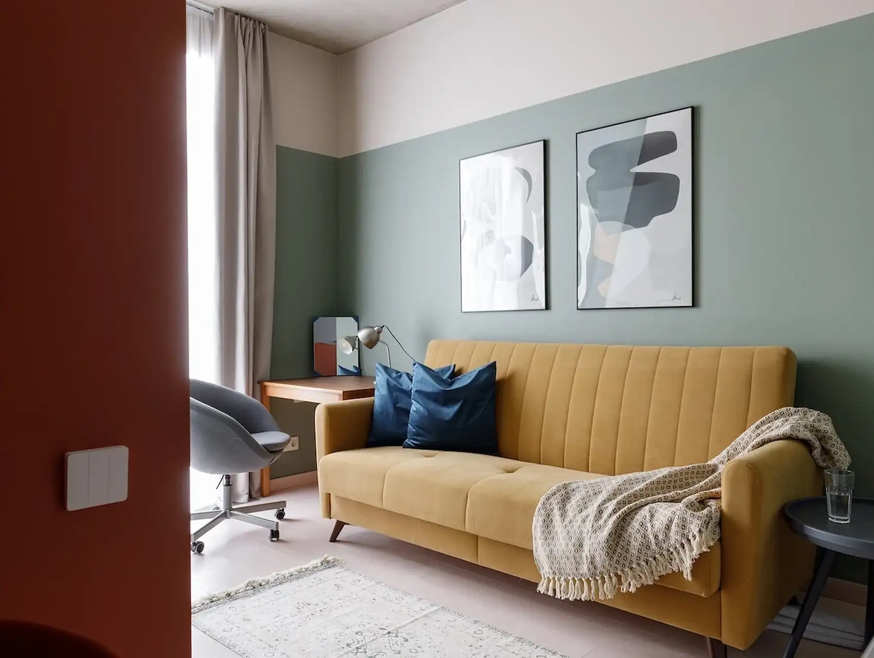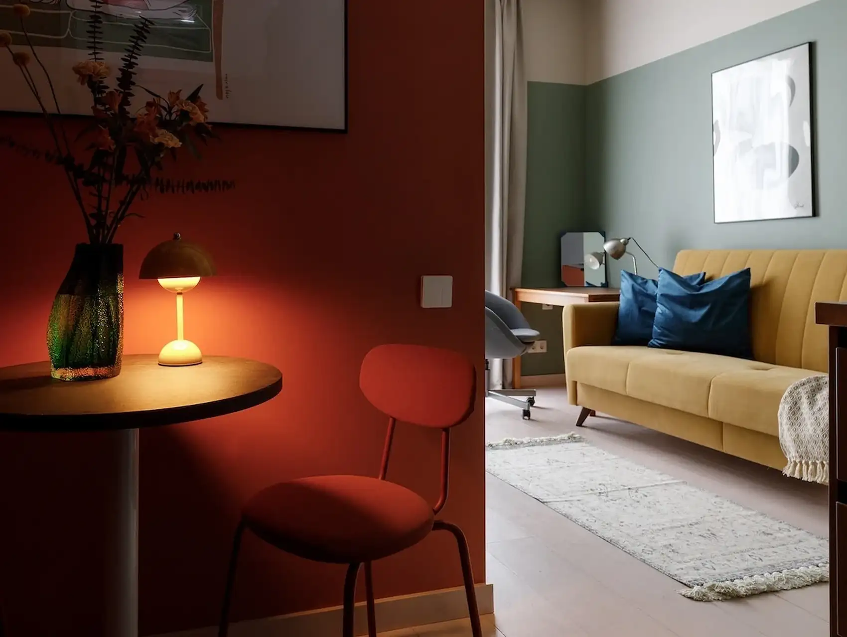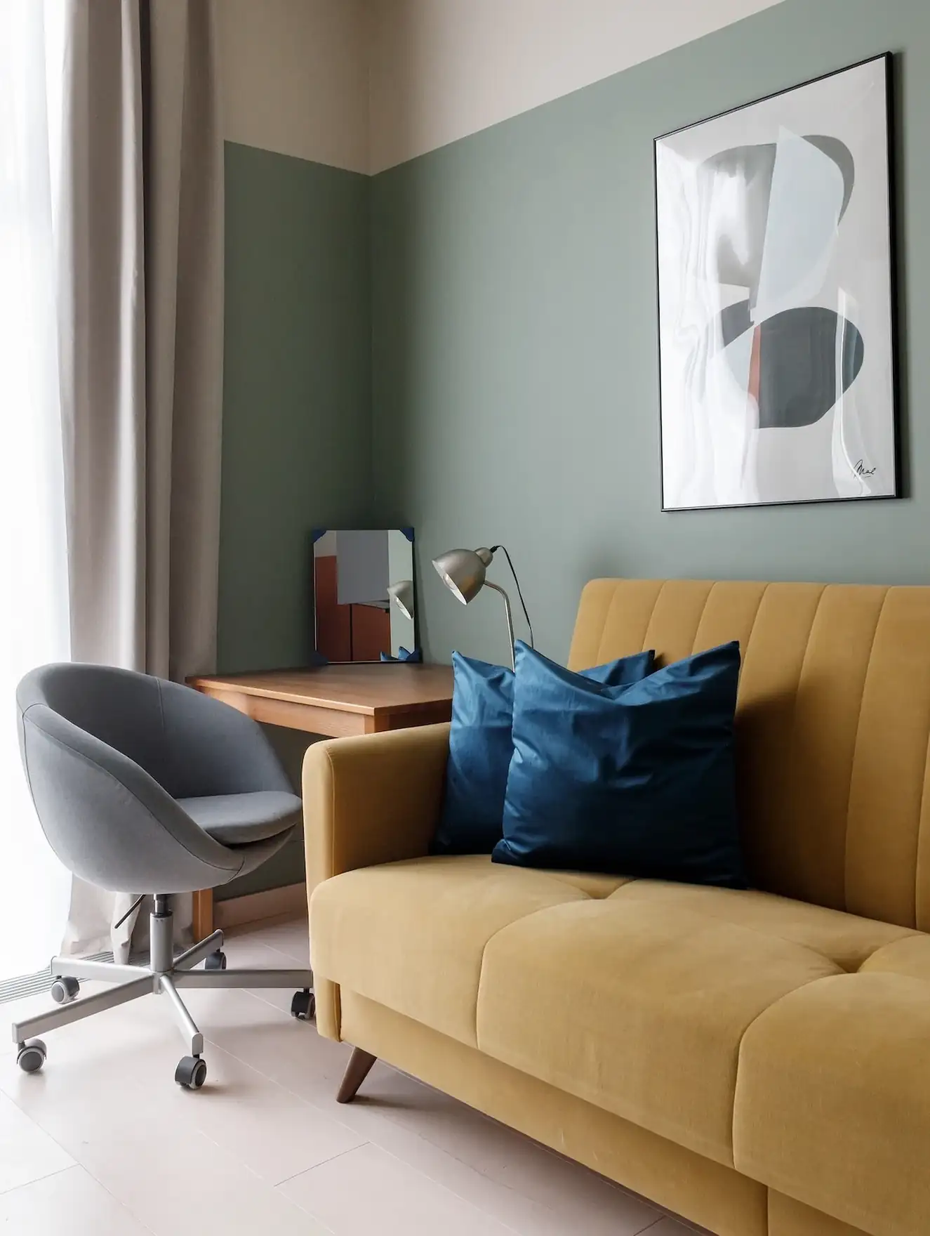A projekt alapfelállása izgalmas volt: egy fiatal egyetemista számára készült az enteriőr, ahol a tanulás, a pihenés és a baráti találkozók is kényelmesen megférnek egymás mellett. A tulajdonosok már előre kitalálták az alapvető színkoncepciót és az elrendezést, a felújítási munkák után pedig profi lakberendezőket hívtak segítségül. A tervezők feladata az volt, hogy a teret vizuálisan egységessé és vonzóvá tegyék, valamint kiválasszák a megfelelő bútorokat és dekorációkat. A végeredmény egy olyan modern enteriőr lett, amely a skandináv térszervezés logikáját, a retró formavilágot és a merész színhasználatot ötvözi a minimalista burkolatokkal. Ez a mix egy rendkívül karakteres, mégis otthonos és rendezett minigarzont eredményezett.