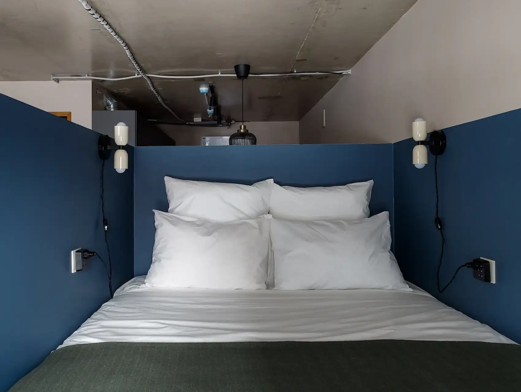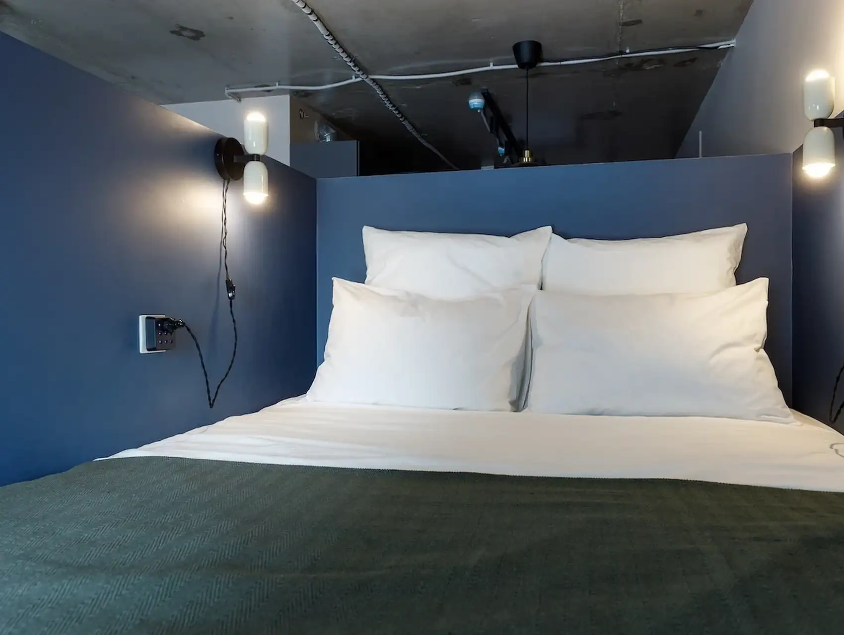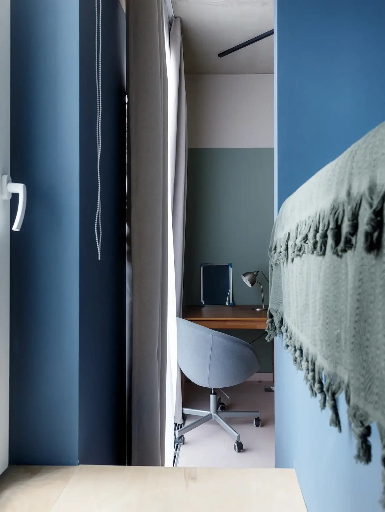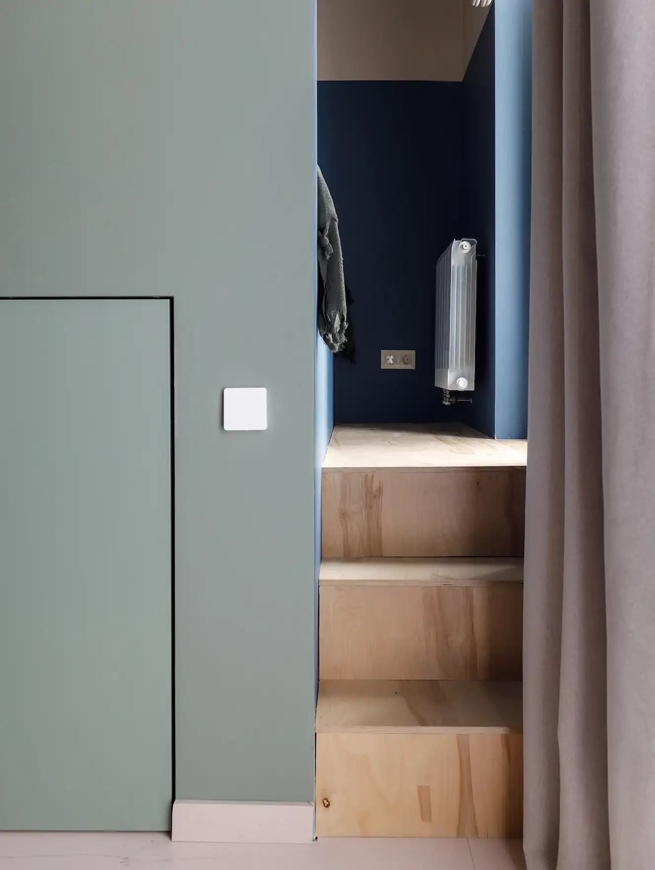 A lakás legintimebb része, a dobogóra emelt hálózóna mélykék színt kapott, ami tökéletes atmoszférát teremt a pihenéshez. A dobogó azonban nem csak egy dizájnelem: a lakás legnagyobb tárolási trükkjét rejti. A tervezők egy asztalossal karöltve egy komplett, rejtett gardróbot alakítottak ki az ágy alatt. A rendszer kihúzható elemekből áll, amelyekben akasztós és polcos részek is helyet kaptak, így a teljes ruhatár kényelmesen elfér. A tároló rejtett ajtajait a dobogóval megegyező zöld színre festették, így csukott állapotban teljesen láthatatlanok. Az esti olvasáshoz a falon előre kialakított konnektorokba dugható, falra szerelhető olvasólámpákat választottak a tervezők.