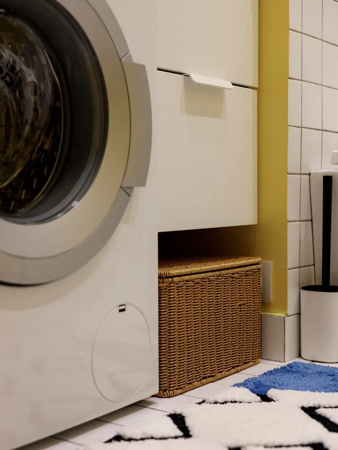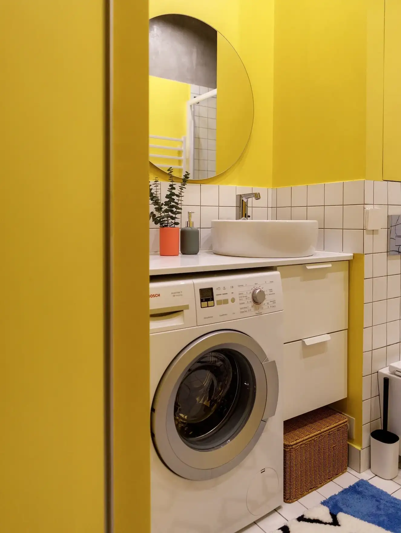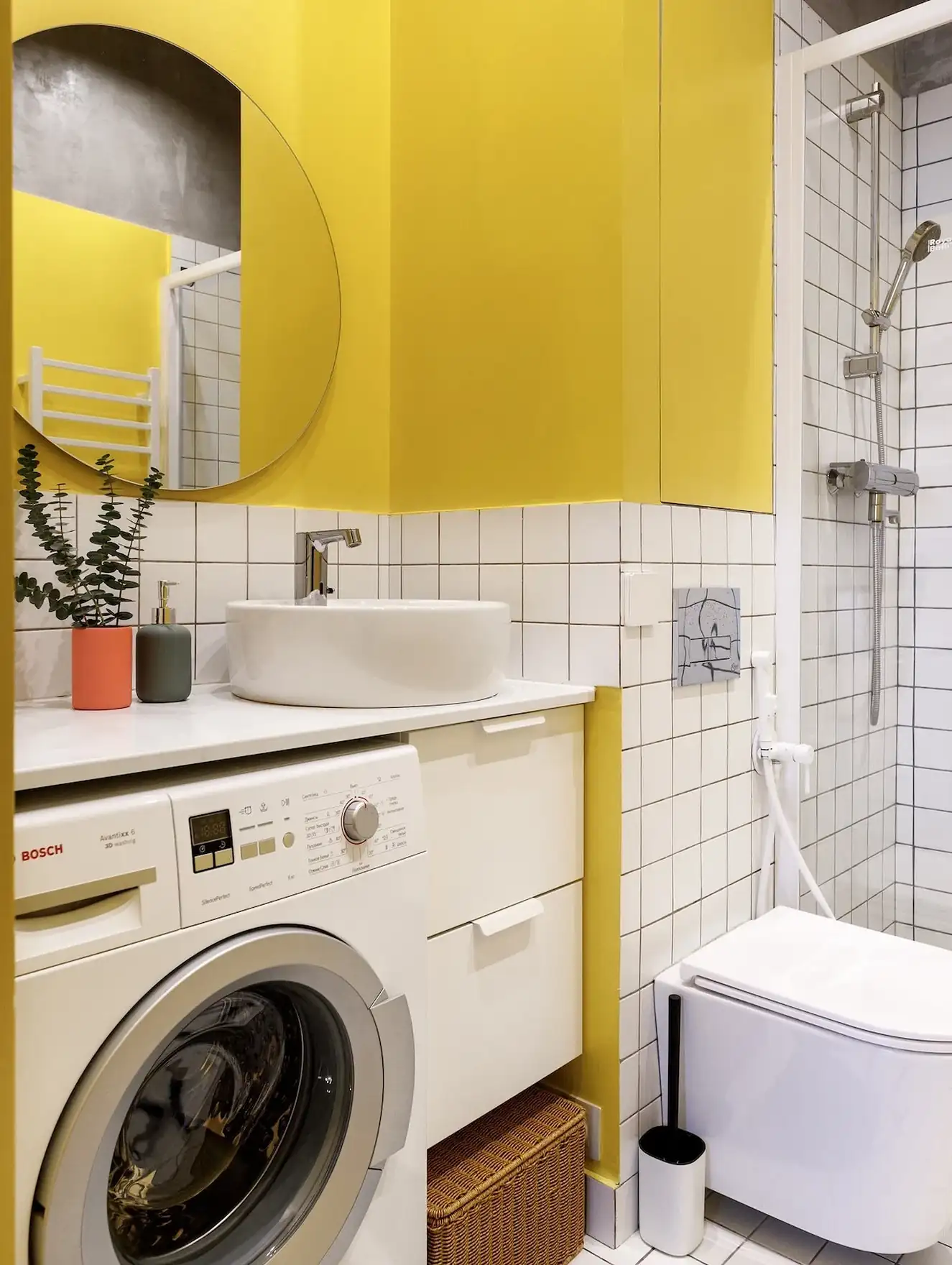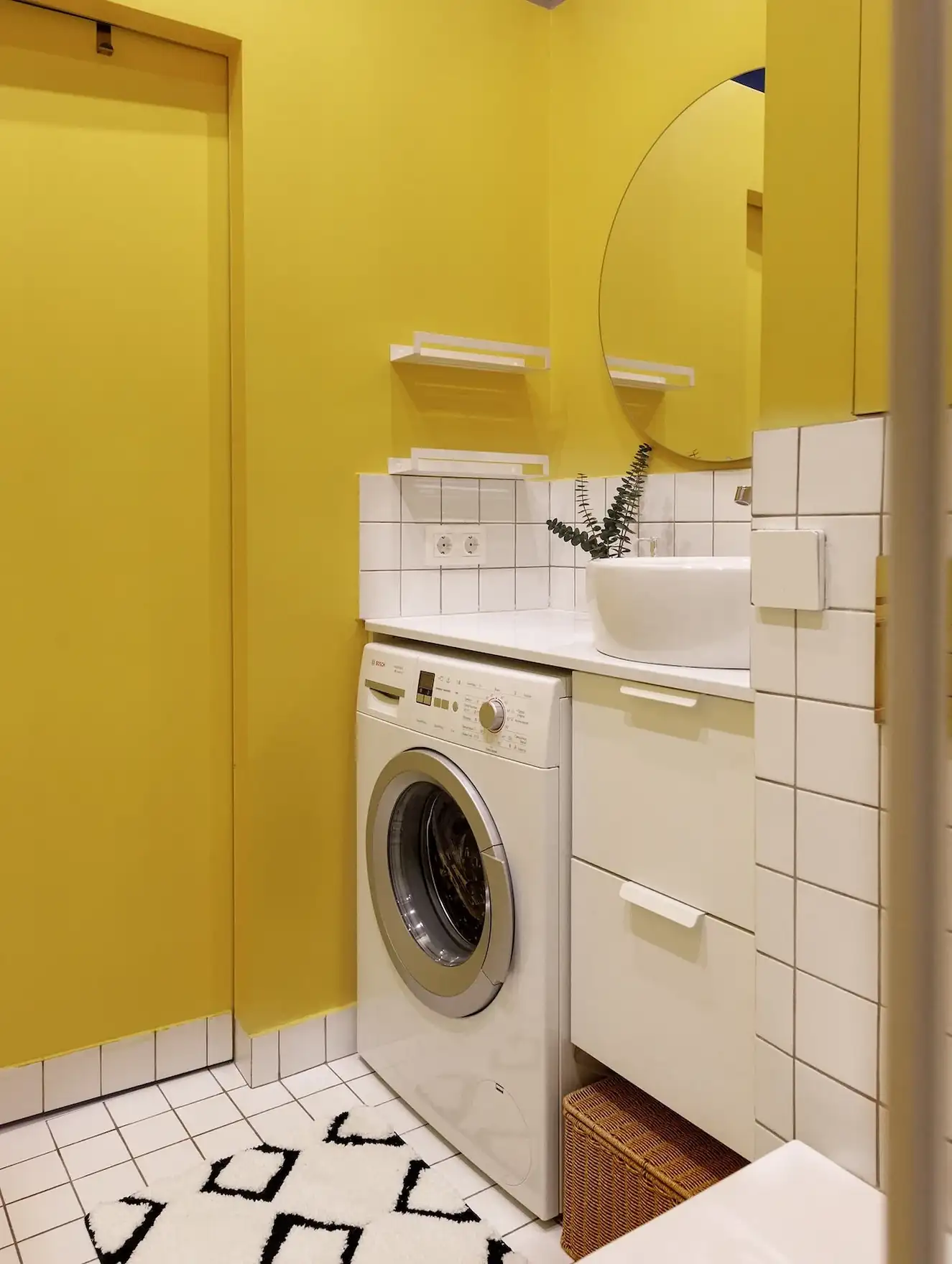Bár a fürdőszoba aprócska, a dizájnnak köszönhetően mégis tágasnak és világosnak hat. Itt a falakon a sárga festéket kombinálták fehér, négyzet alakú csempével és fehér szaniterekkel. A sárga szín igazi energiabomba, ami még a legnehezebb, korán induló reggeleken is garantálja a jókedvet és a „napsütéses” hangulatot. A helyiségbe egy mosógépet is be kellett passzírozni, ezt a mosdókagyló alatti pultba építették be. Hogy a különböző tisztítószerek és flakonok ne keltsenek vizuális zajt a kis térben, a tervezők a pult alá egy dekoratív tárolókosarat is elhelyeztek. A koncepciót egy stílusos kerek tükör teszi teljessé.