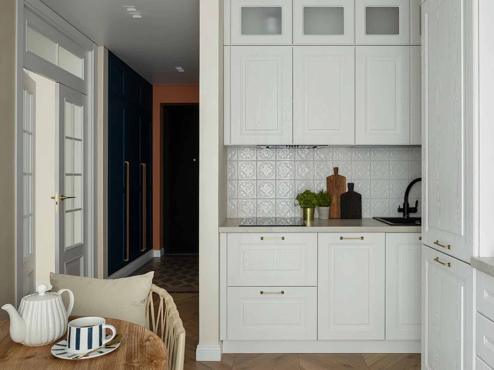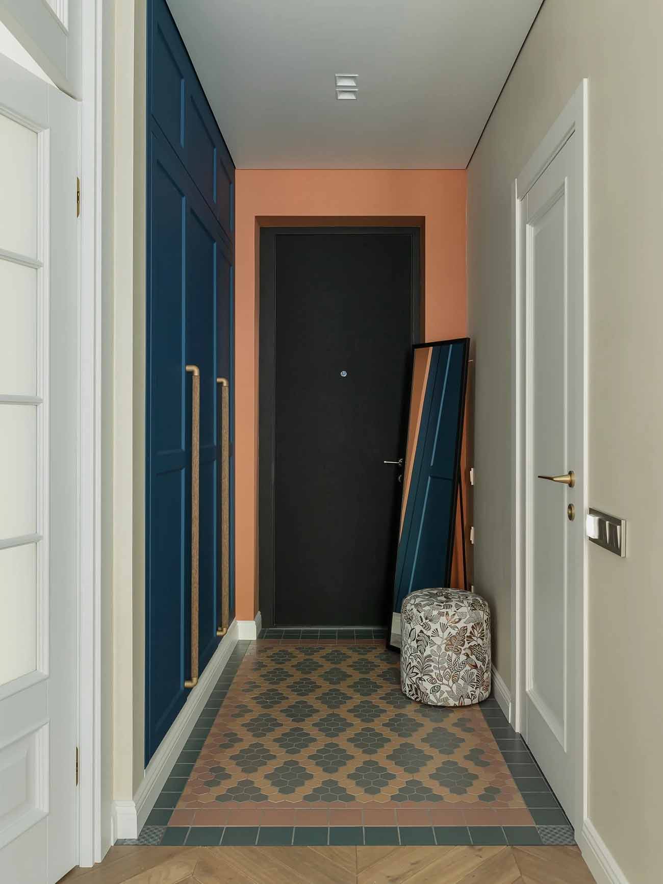 Az előszoba egyik falát hangsúlyos terrakotta színűre festették, ami melegséget ad az rlőtérnek. A padlót dekoratív megoldással burkolták: apró hatszögletű lapok alkotnak „szőnyegmintát”, amelyet négyzetes csempék kereteznek. Mivel a lakásban nincs külön gardróbszoba, a tárolást itt egy beépített, karakteres kék frontokkal rendelkező szekrény oldja meg. Ez nemcsak a kabátoknak és cipőknek biztosít helyet, hanem a háztartási funkciókat is elrejti: az egyik szekcióban kapott helyet a mosó- és szárítógép oszlop. A világítást praktikus mennyezeti spotlámpák biztosítják.