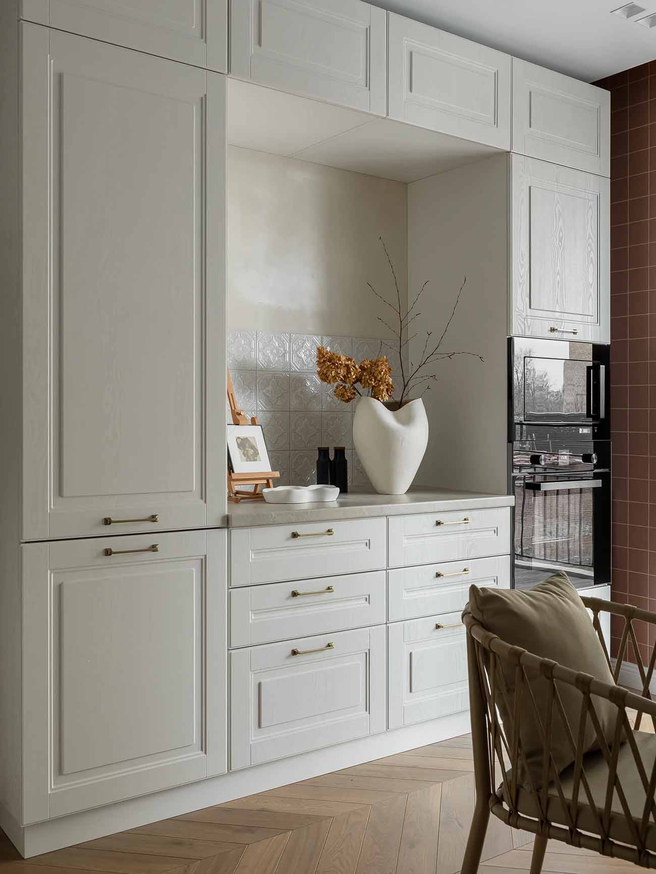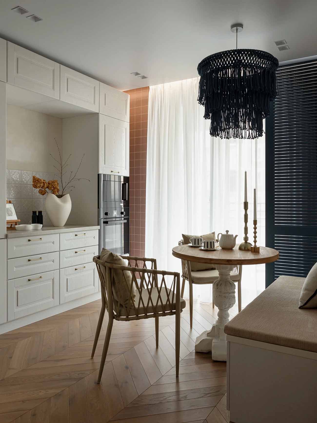 A konyha kialakítását a mediterrán hangulat vezérelte. A teraszajtó és az ablak melletti falat négyzet alakú, terrakotta színű csempékkel burkolták, vizuális kapcsolatot teremtve az előszoba falszínével. A konyhabútort két funkcionális zónára osztották: az egyik oldalon található a fő munkafelület a főzőlappal és a mosogatóval, míg a másik oldalon a magas elemek kaptak helyet, amelyek a beépített hűtőt, a sütőt, a mikrohullámú sütőt, valamint a fiókokat és a mennyezetig érő tárolókat rejtik. Az étkezősarokban egy tárolóhellyel ellátott pad és a kültéri bútorokat idéző fonott fotelek erősítik a déli tájak hangulatát. A világítás itt rétegezett: az általános fényt adó spotokon túl a konyhabútornál falikarok és rejtett fények, az étkezőasztal felett pedig egy kézzel készített makramé csillár gondoskodik a meghitt atmoszféráról.