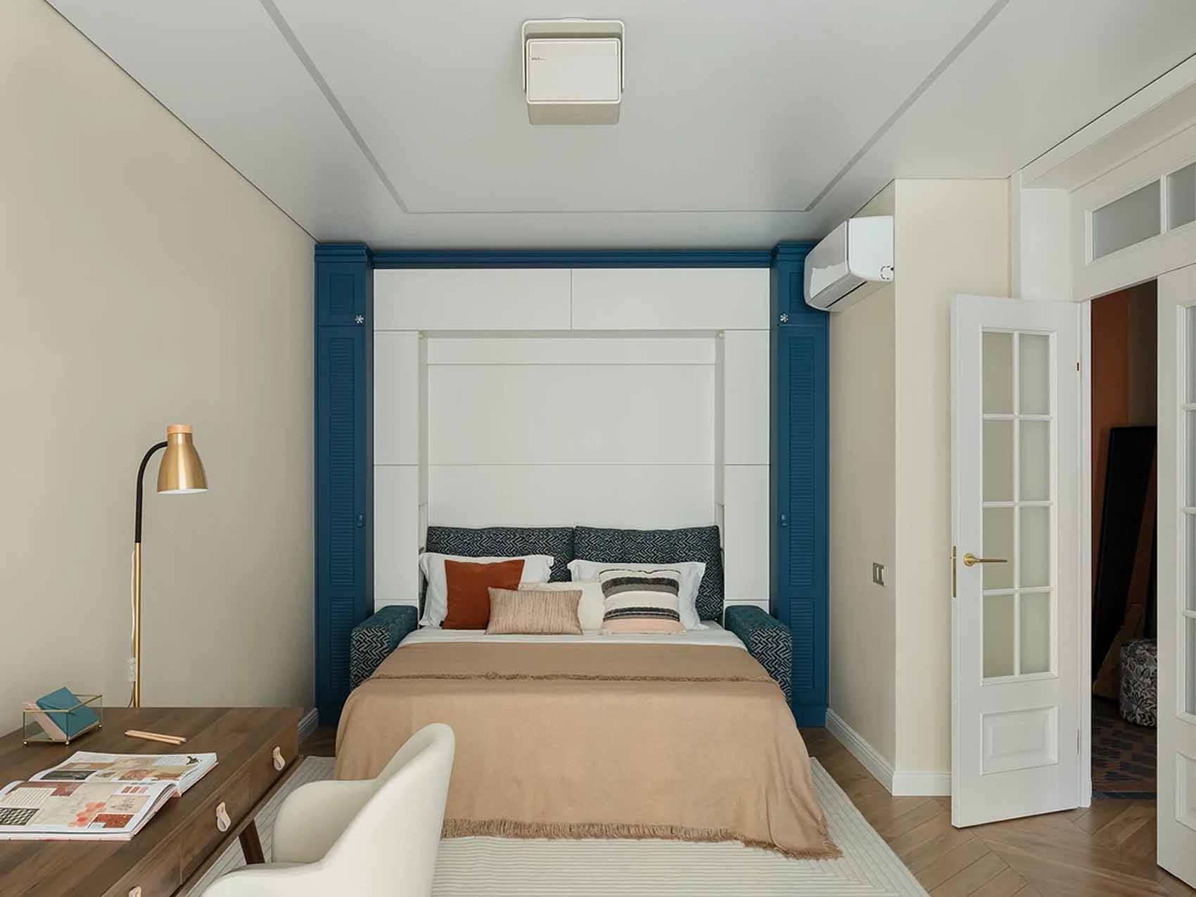 A tulajdonos hölgy frissen házasodott fia számára rendezte be ezt a 39 négyzetméteres lakást. A cél egy egyedi, de funkcionális tér létrehozása volt, amelyben a fiatal pár önálló életet kezdhet. A tervezési koncepció központi eleme a mediterrán életérzés megidézése, valamint a kis alapterület maximális kihasználása volt okosan elhelyezett bútorokkal.