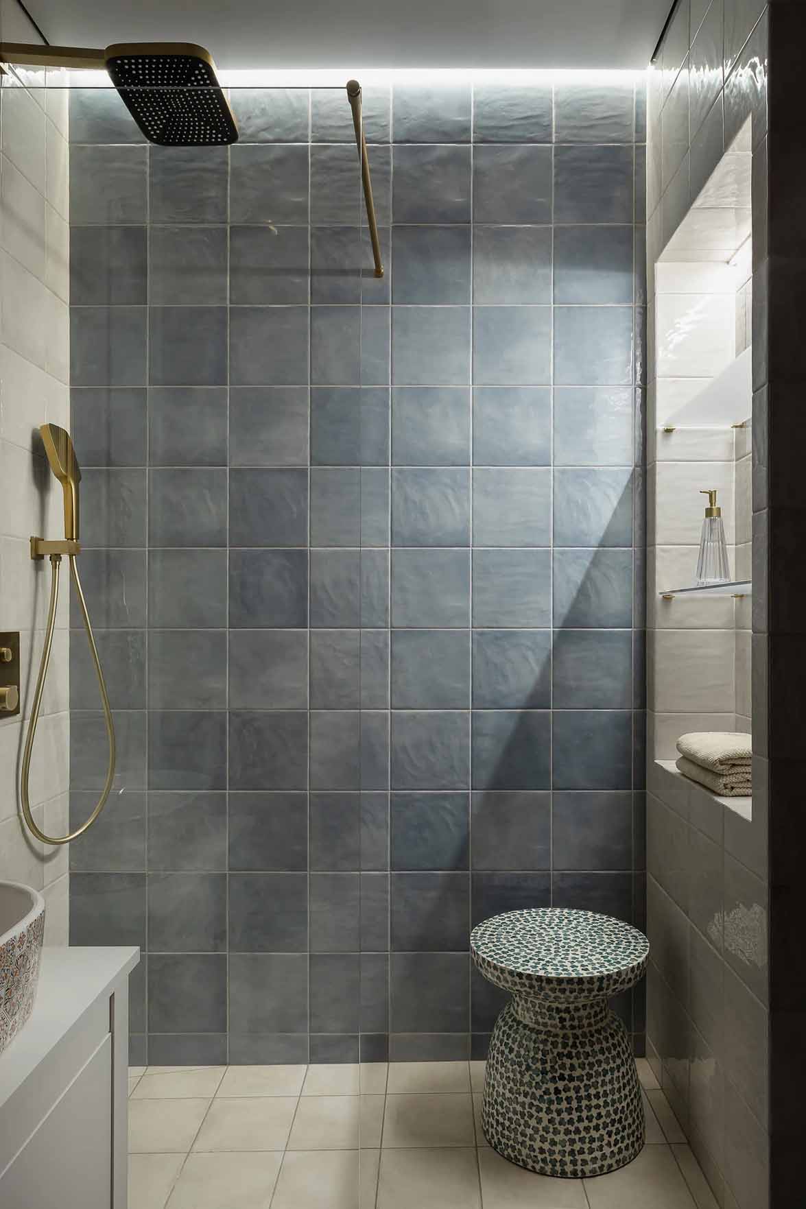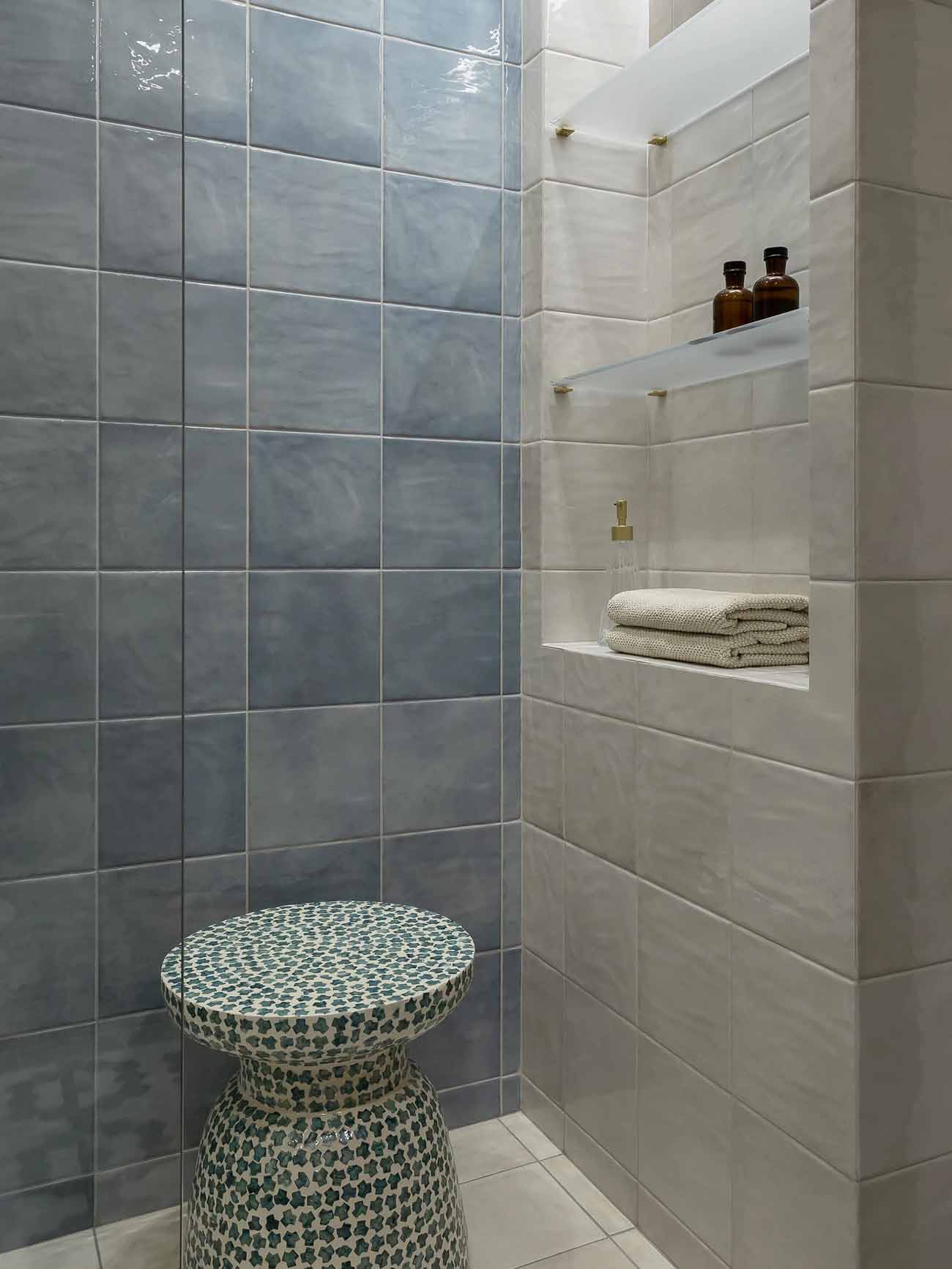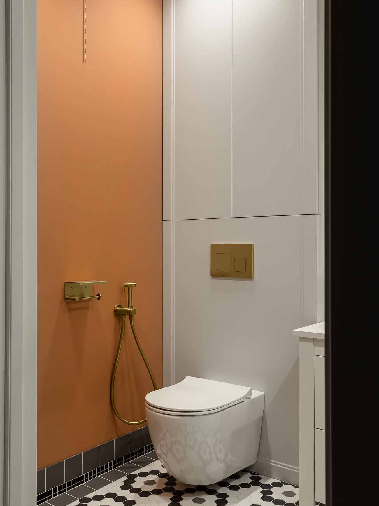 A fürdőszobában a burkolatok kombinációja dominál: a falakon fehér négyzetes lapok váltakoznak a zuhanyzóban ugyanannak a kollekciónak a kék darabjaival, míg a padlón fekete-fehér hatszögletű mozaik fut mintába rendezve. A víz által nem ért falfelületeket itt is a lakáson végigvonuló terrakotta árnyalatra festették. A tárolást a mosdó alatti szekrény, a WC tartálya fölé épített zárt tároló és a zuhanyzó falfülkéjében kialakított polcok biztosítják. A világításról süllyesztett spotok és a tükör mellett elhelyezett finom vonalú, lineáris függeszték gondoskodik.