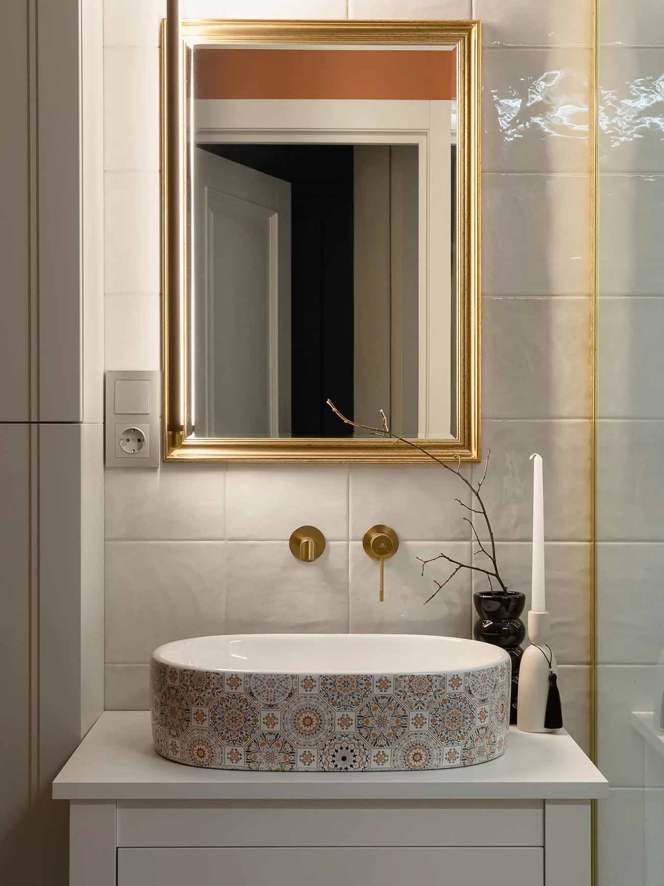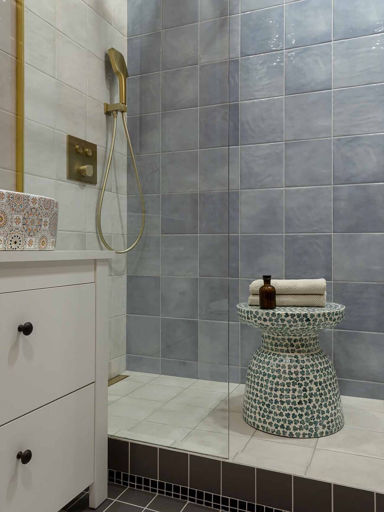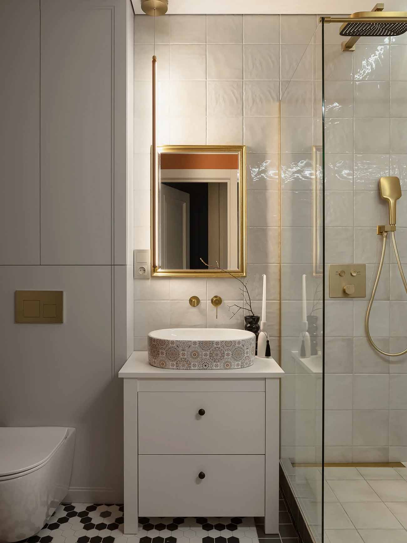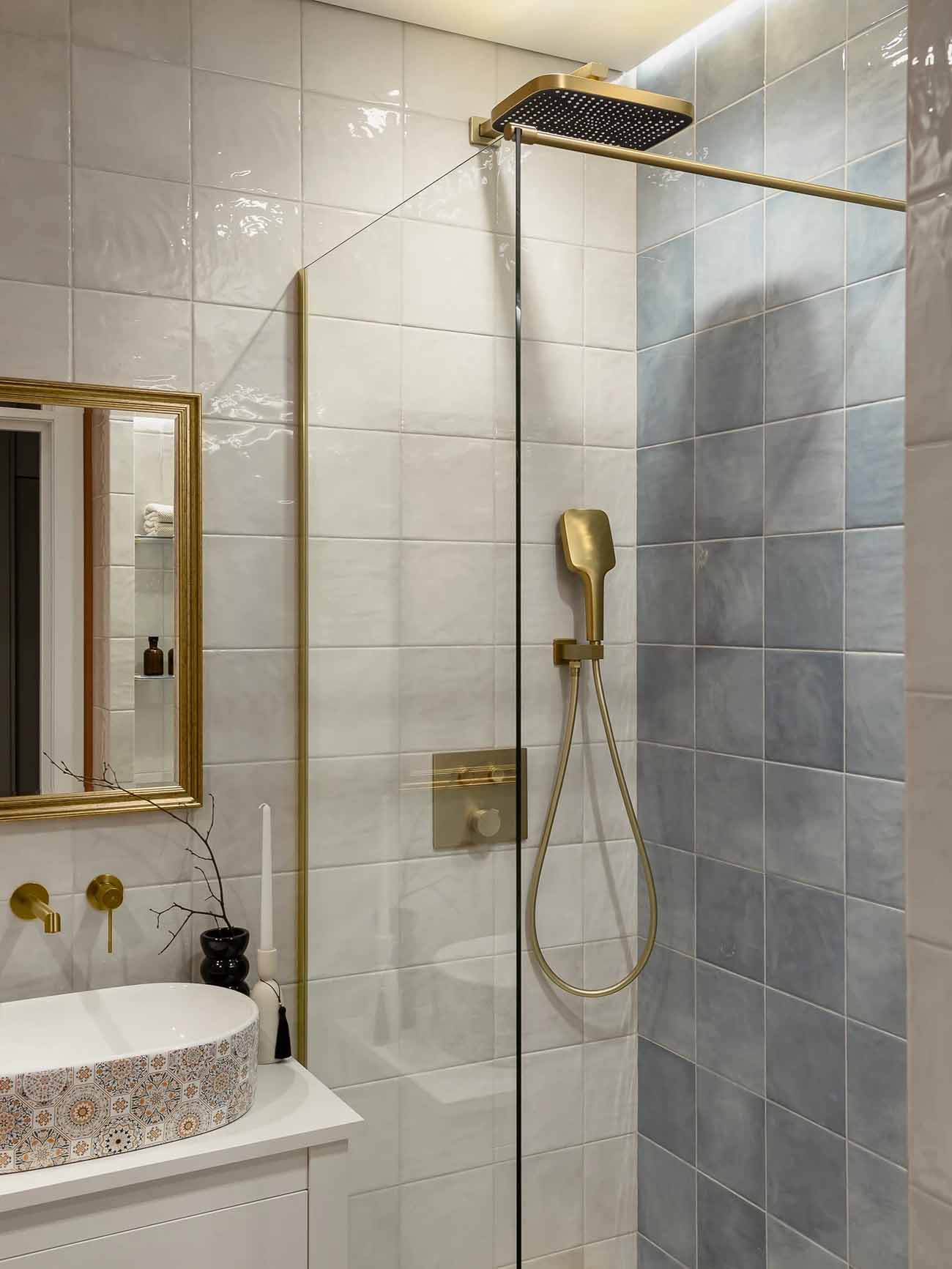 A fürdőszobában a burkolatok kombinációja dominál: a falakon fehér négyzetes lapok váltakoznak a zuhanyzóban ugyanannak a kollekciónak a kék darabjaival, míg a padlón fekete-fehér hatszögletű mozaik fut mintába rendezve. A víz által nem ért falfelületeket itt is a lakáson végigvonuló terrakotta árnyalatra festették. A tárolást a mosdó alatti szekrény, a WC tartálya fölé épített zárt tároló és a zuhanyzó falfülkéjében kialakított polcok biztosítják. A világításról süllyesztett spotok és a tükör mellett elhelyezett finom vonalú, lineáris függeszték gondoskodik.
